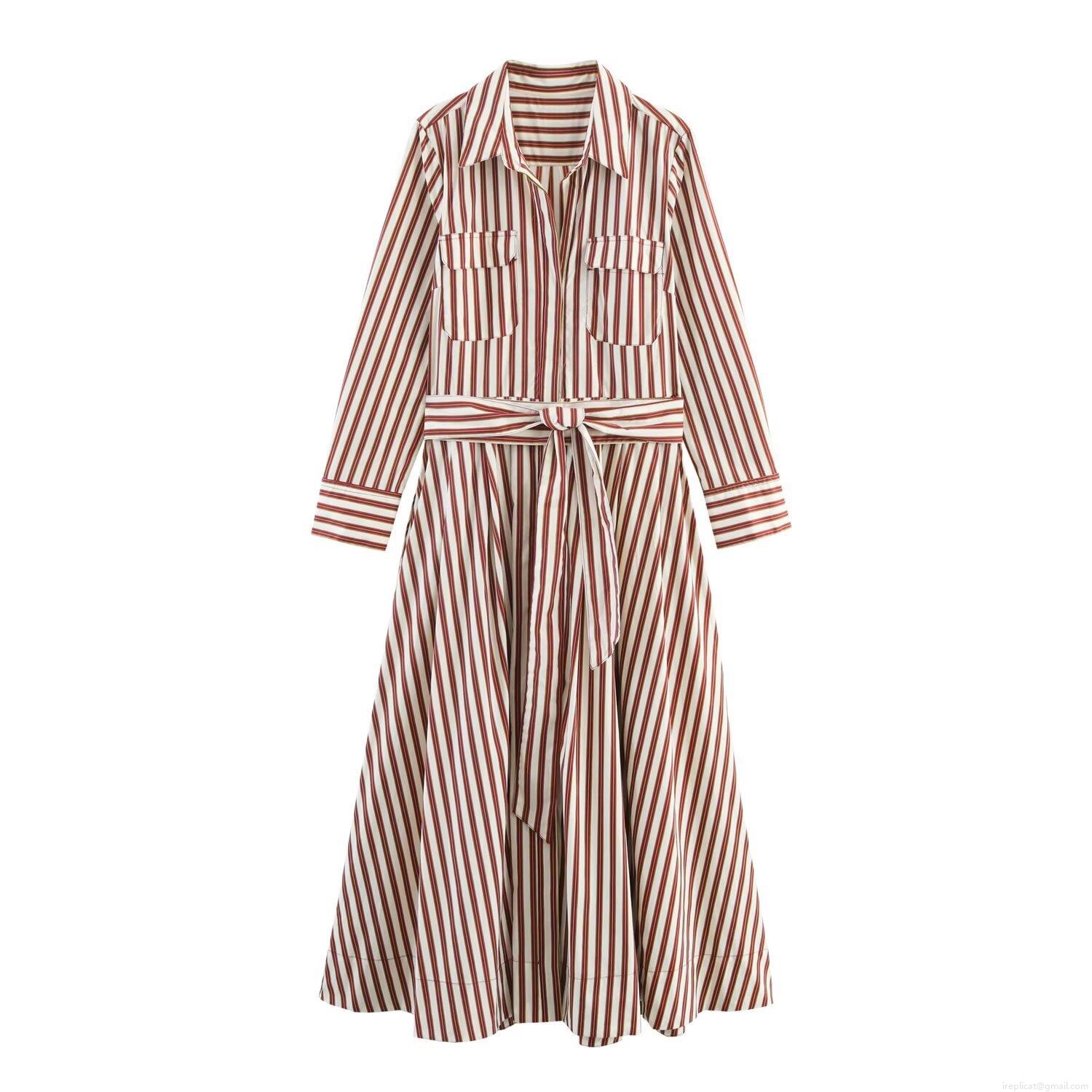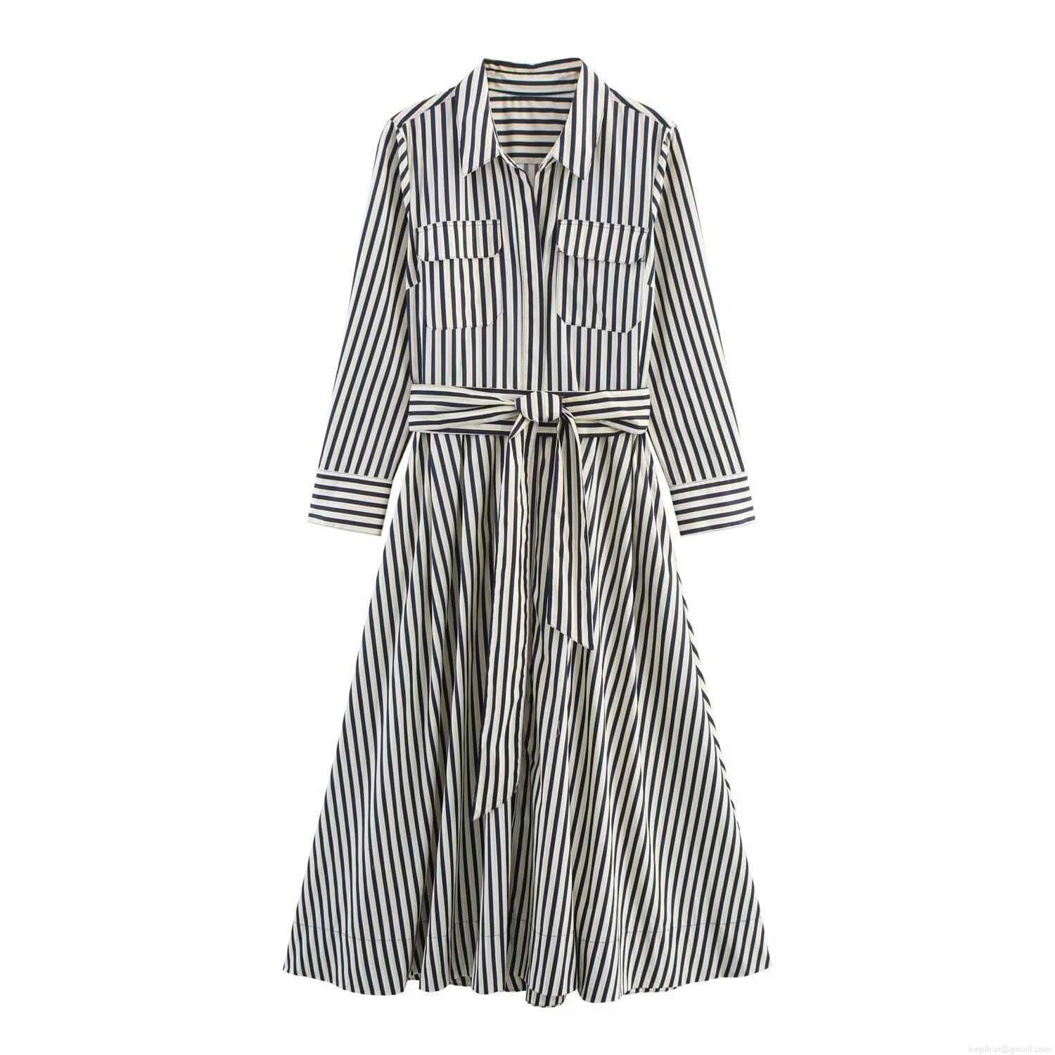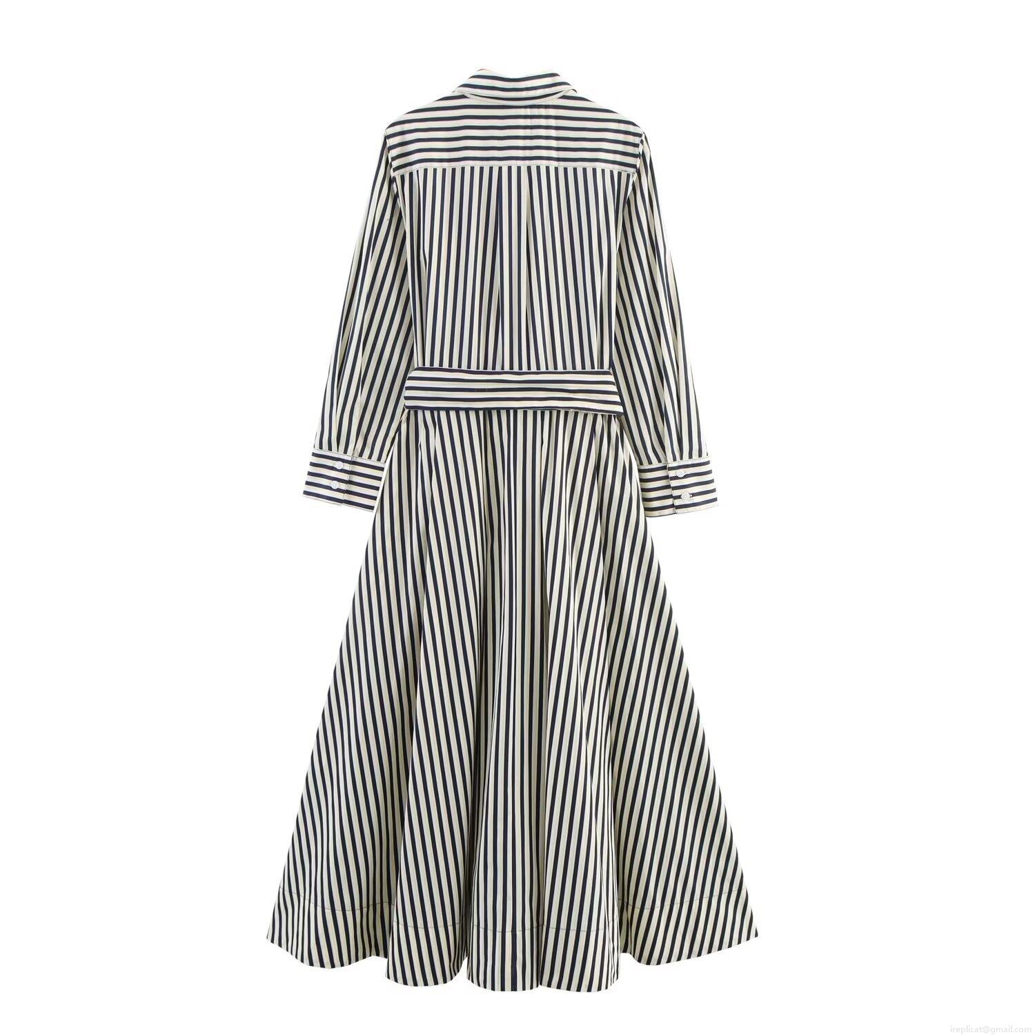Women Elegant Striped Shirt Dress With Belt Button Down Maxi Long Sleeve Poplin A-Line Office Lady Casual Dresses