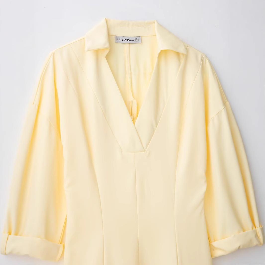 Solid Color, V-neck, Lapel, Full Skirt, Adjustable Cuffs