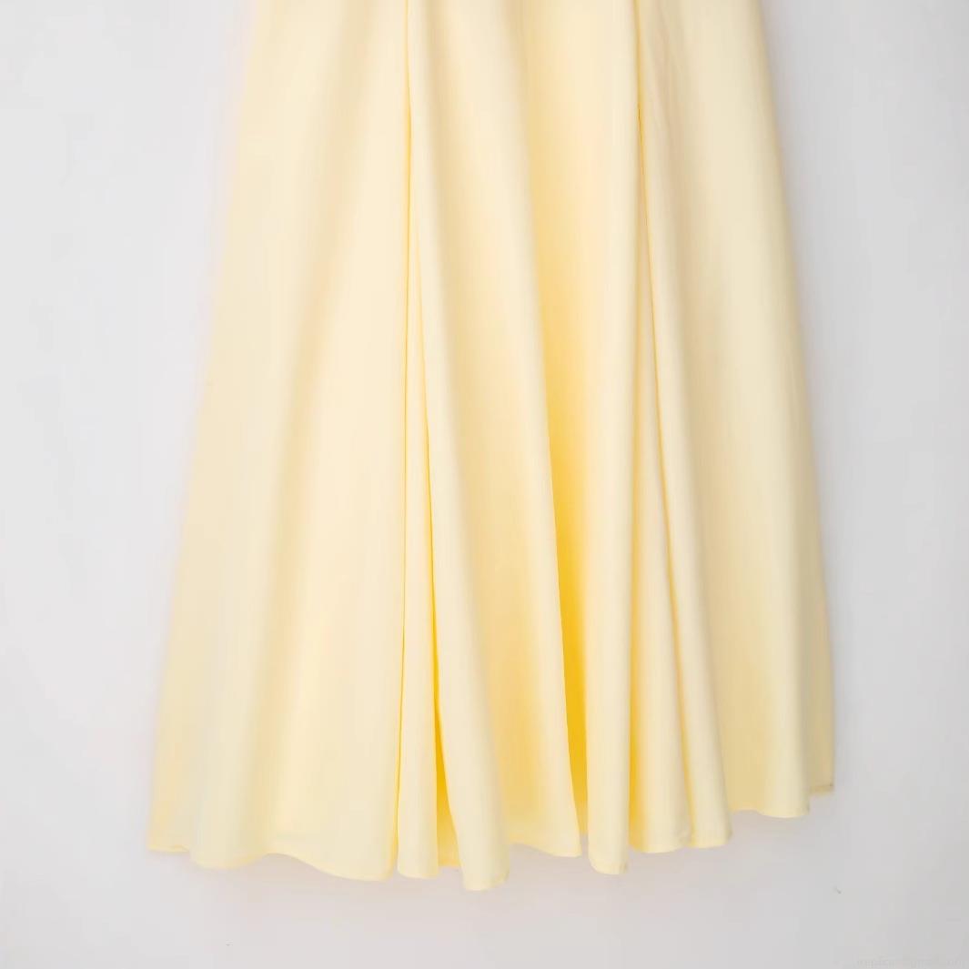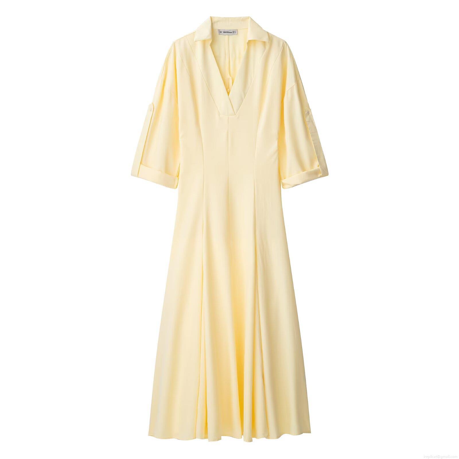 Women Elegant V Neck Shirt Maxi Dress 100% Polyester Short Sleeve A Line Swing Dress For Daily Party Dating Solid Pale Yellow Fashion Gown