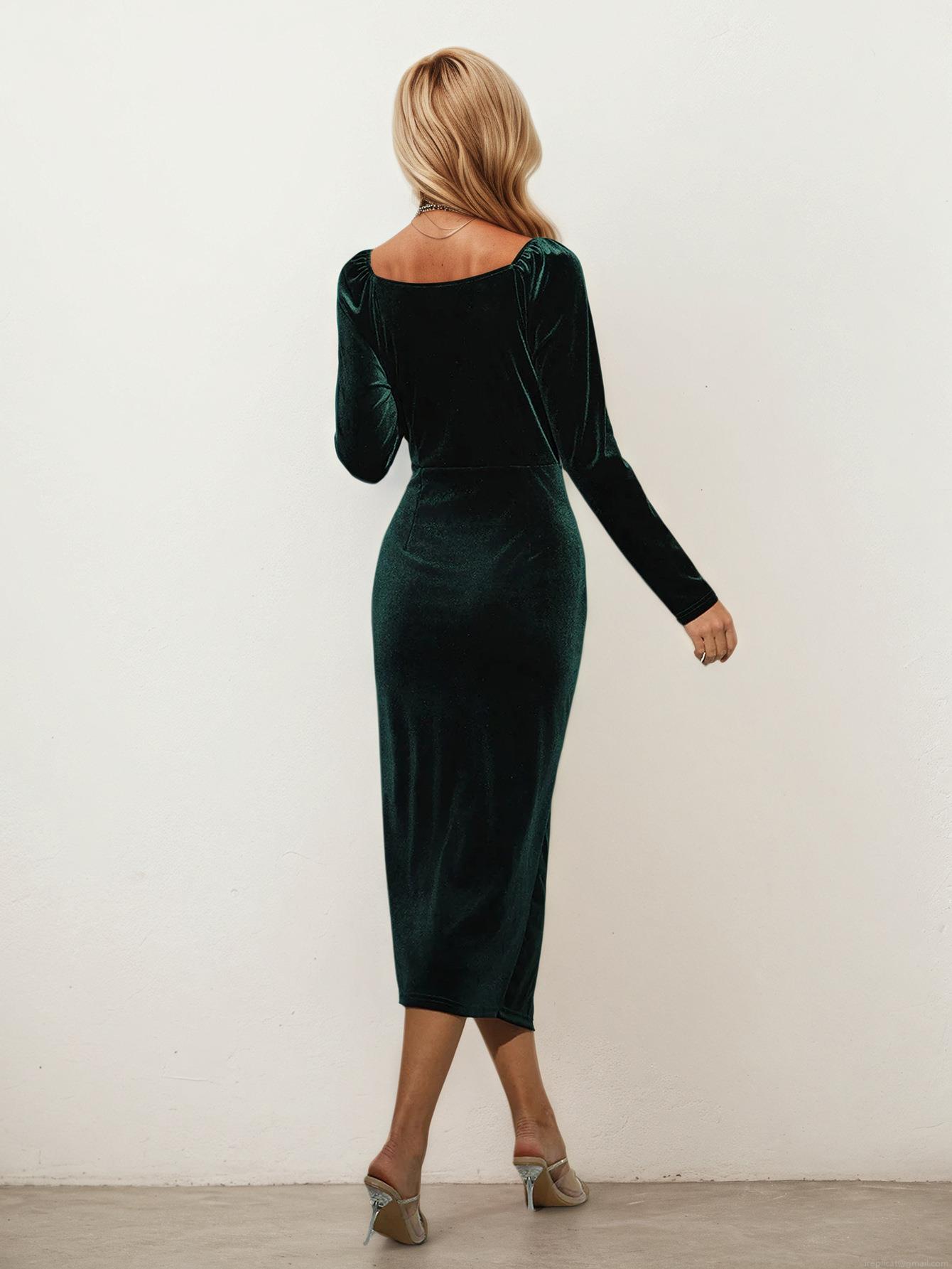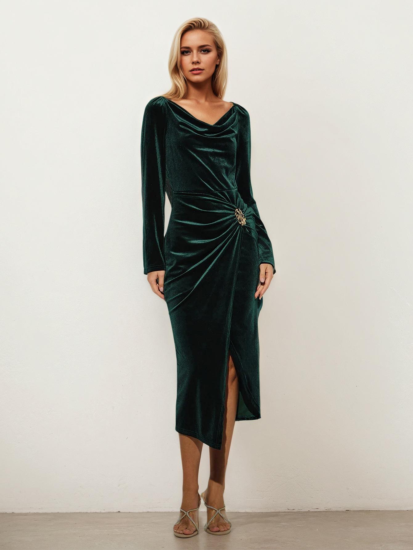 • Women Elegant Velvet Maxi Dress Cowl Neck Long Sleeve High Slit Evening Party Gown With Waist Buckle Dark Green For Wedding Formal Occasions