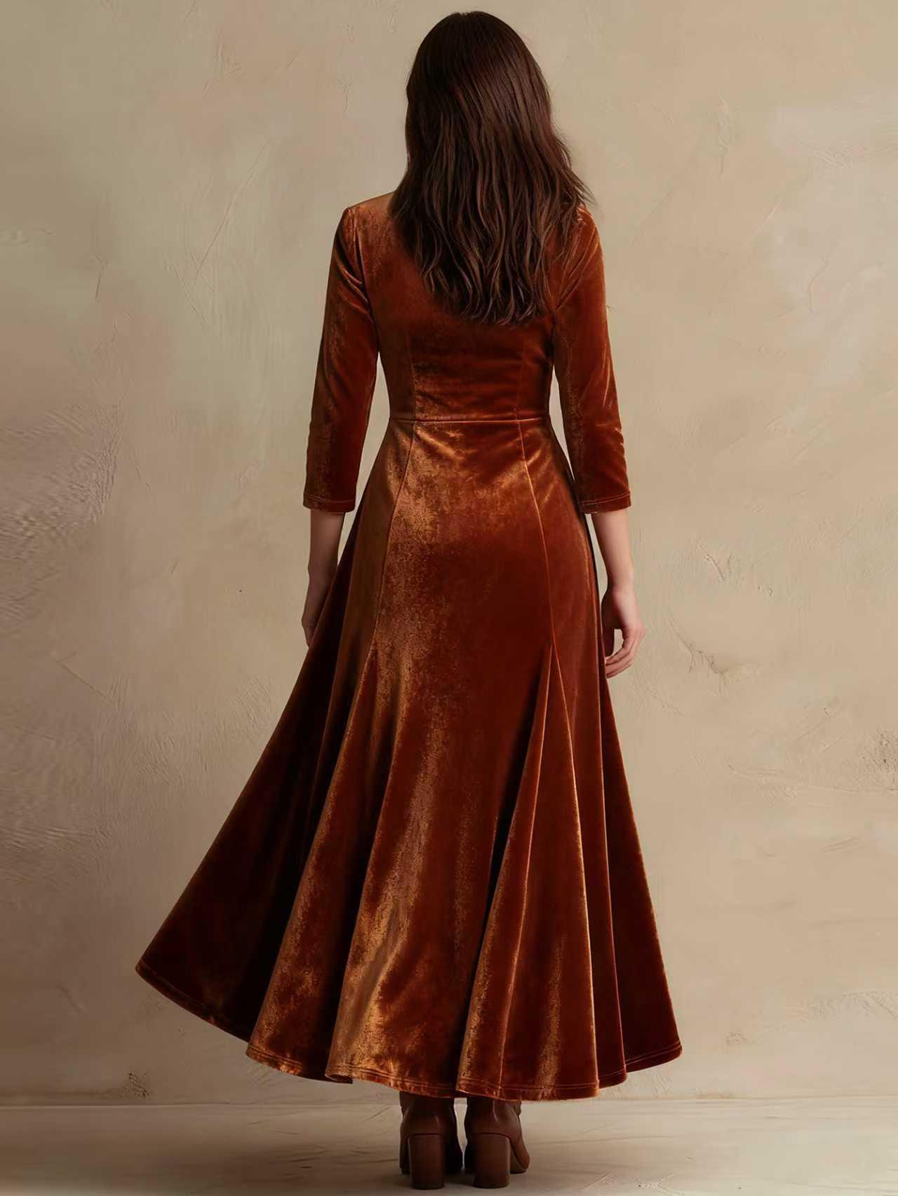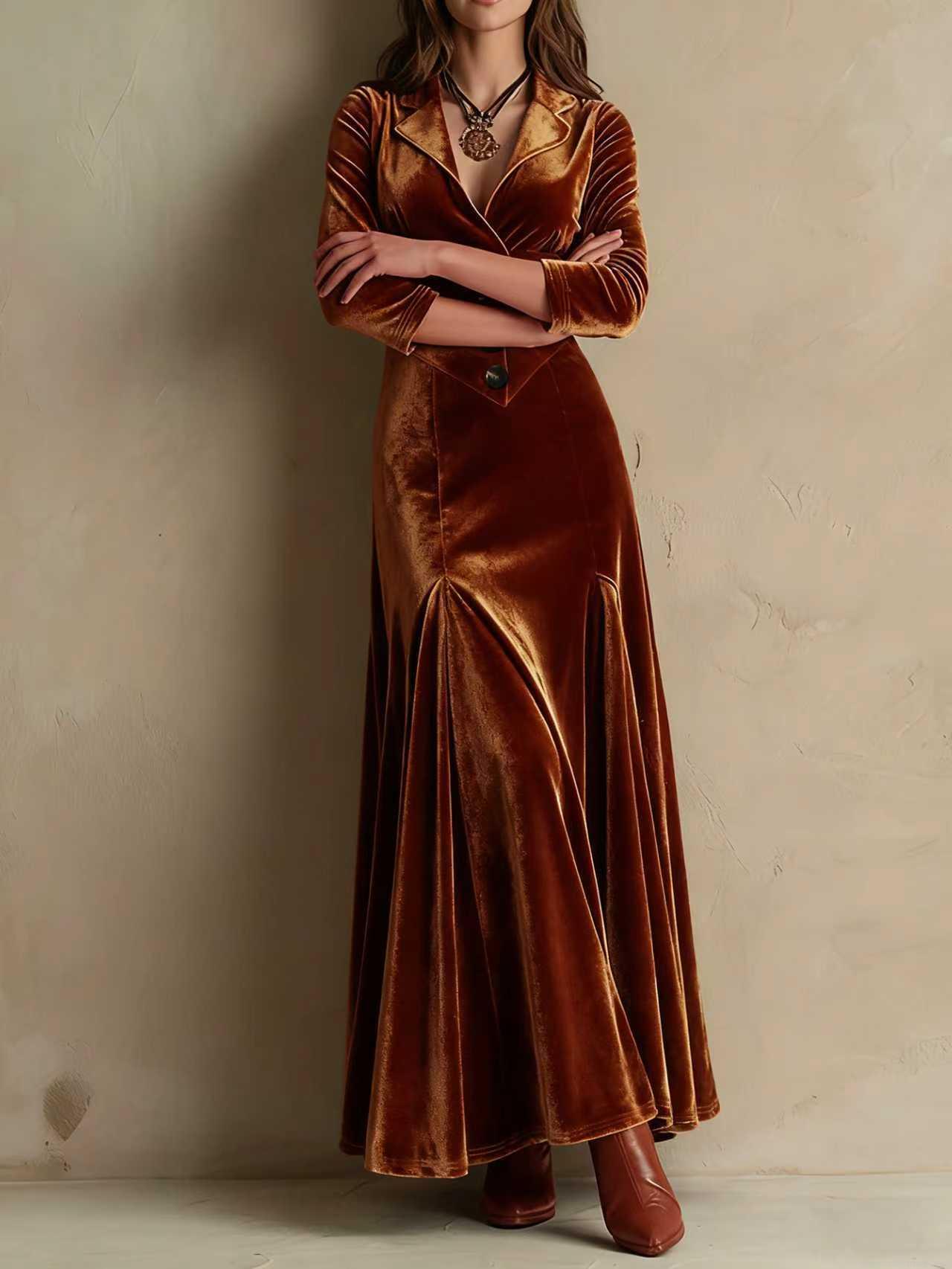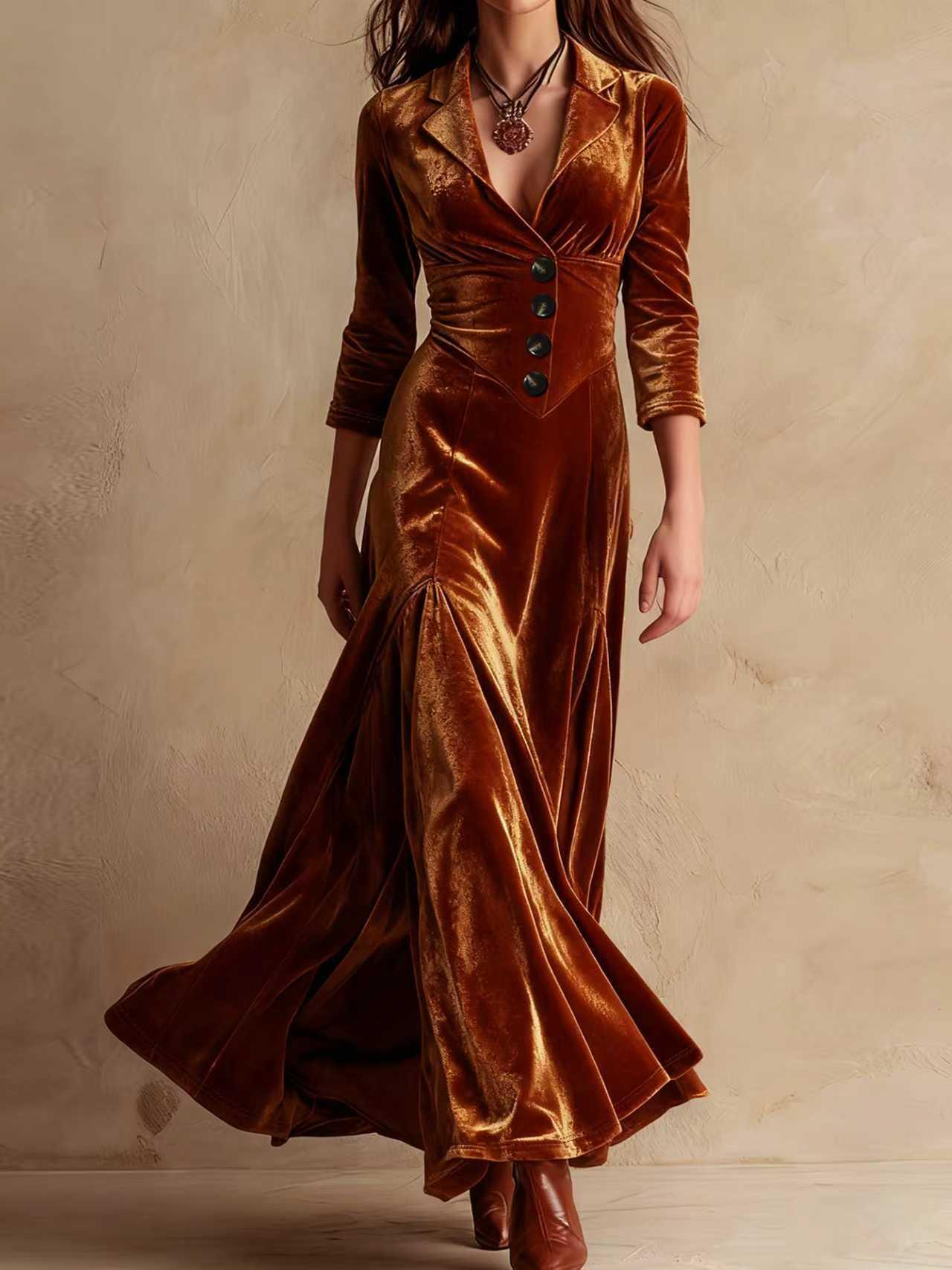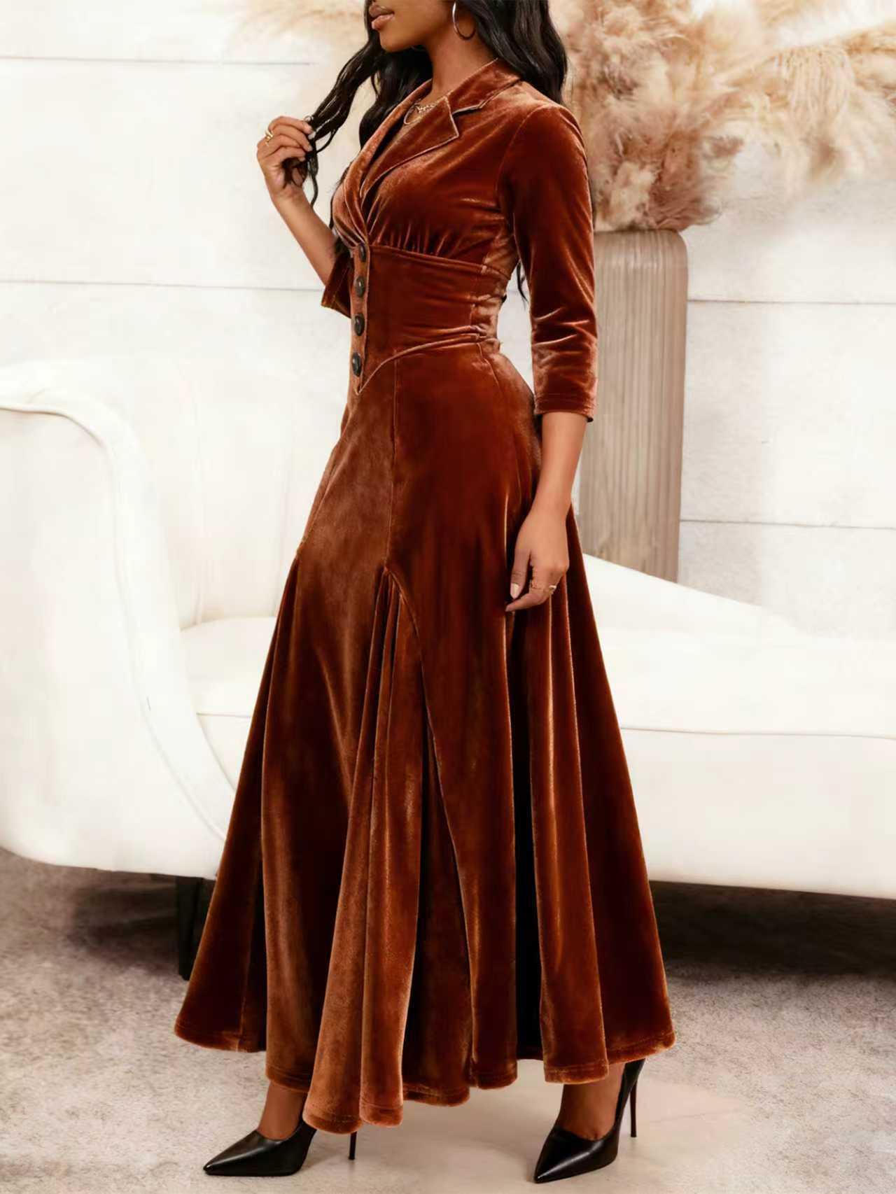 • Women Elegant Velvet Maxi Dress V-Neck Button Down Long Sleeve Slim Fit Party Evening Swing Long Dress Coffee Vintage Aesthetic Gown S-XXL