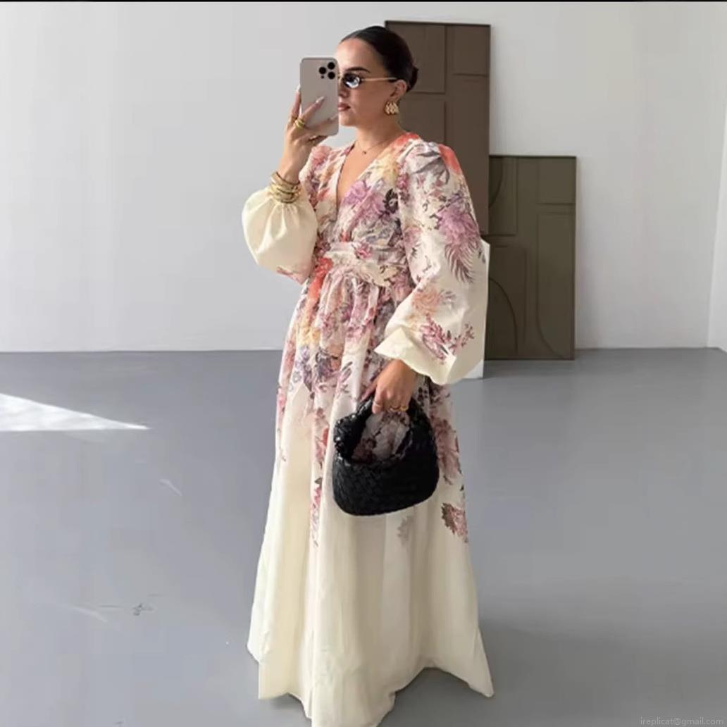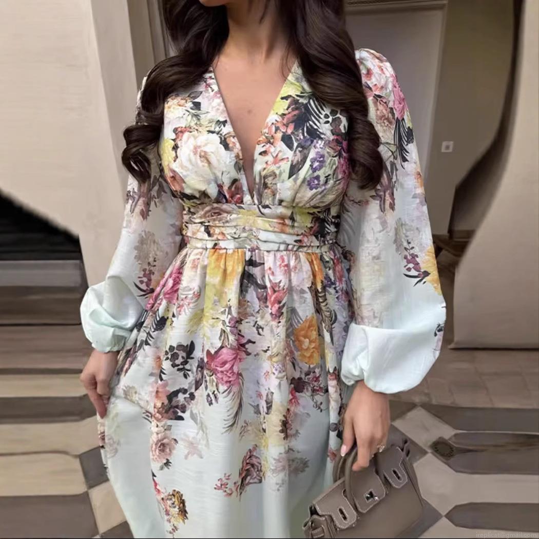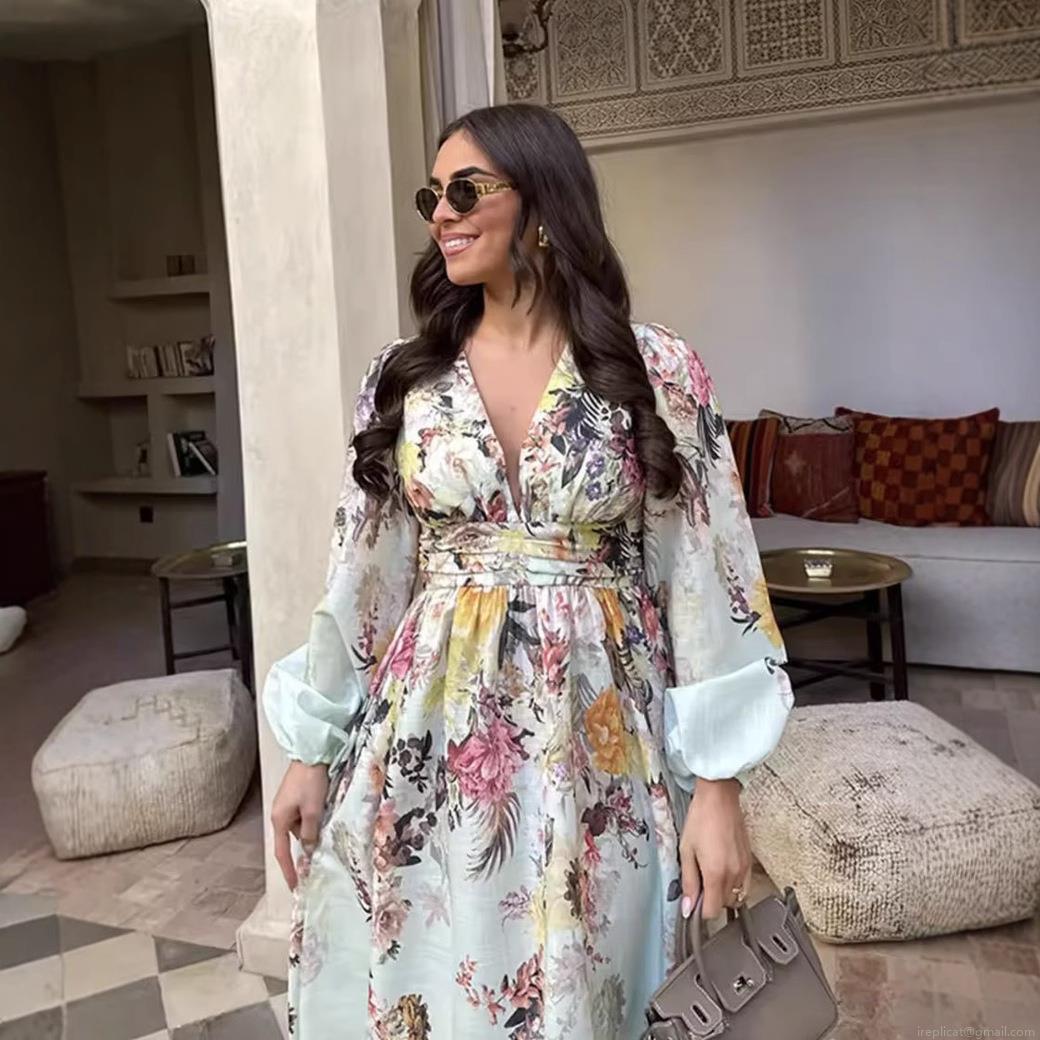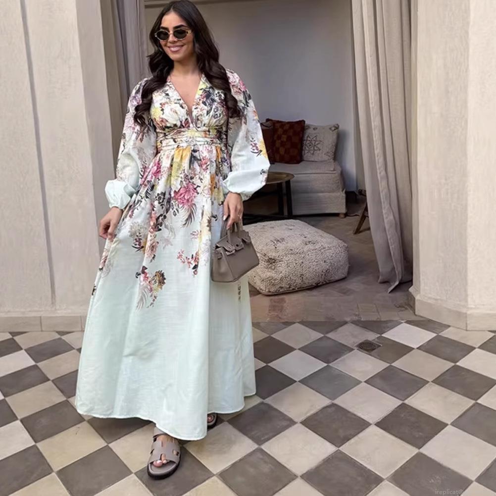 • Women Elegant V-Neck Floral Print Maxi Dress Long Lantern Sleeve High Waist Bohemian Vacation A-Line Dresses For Ladies Summer Holiday