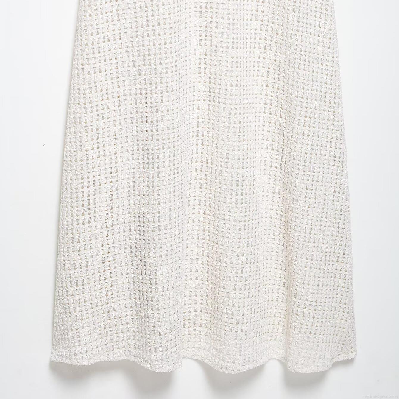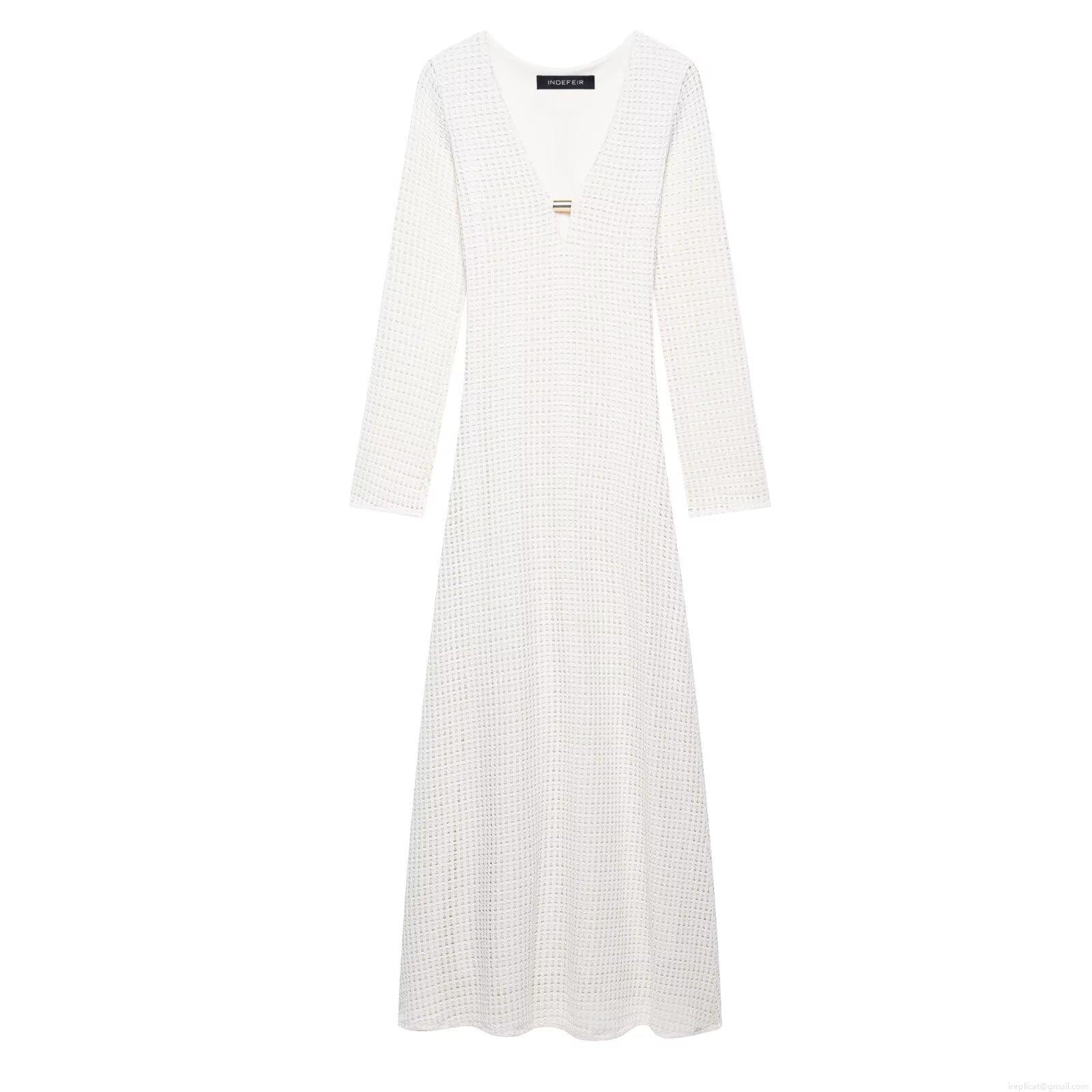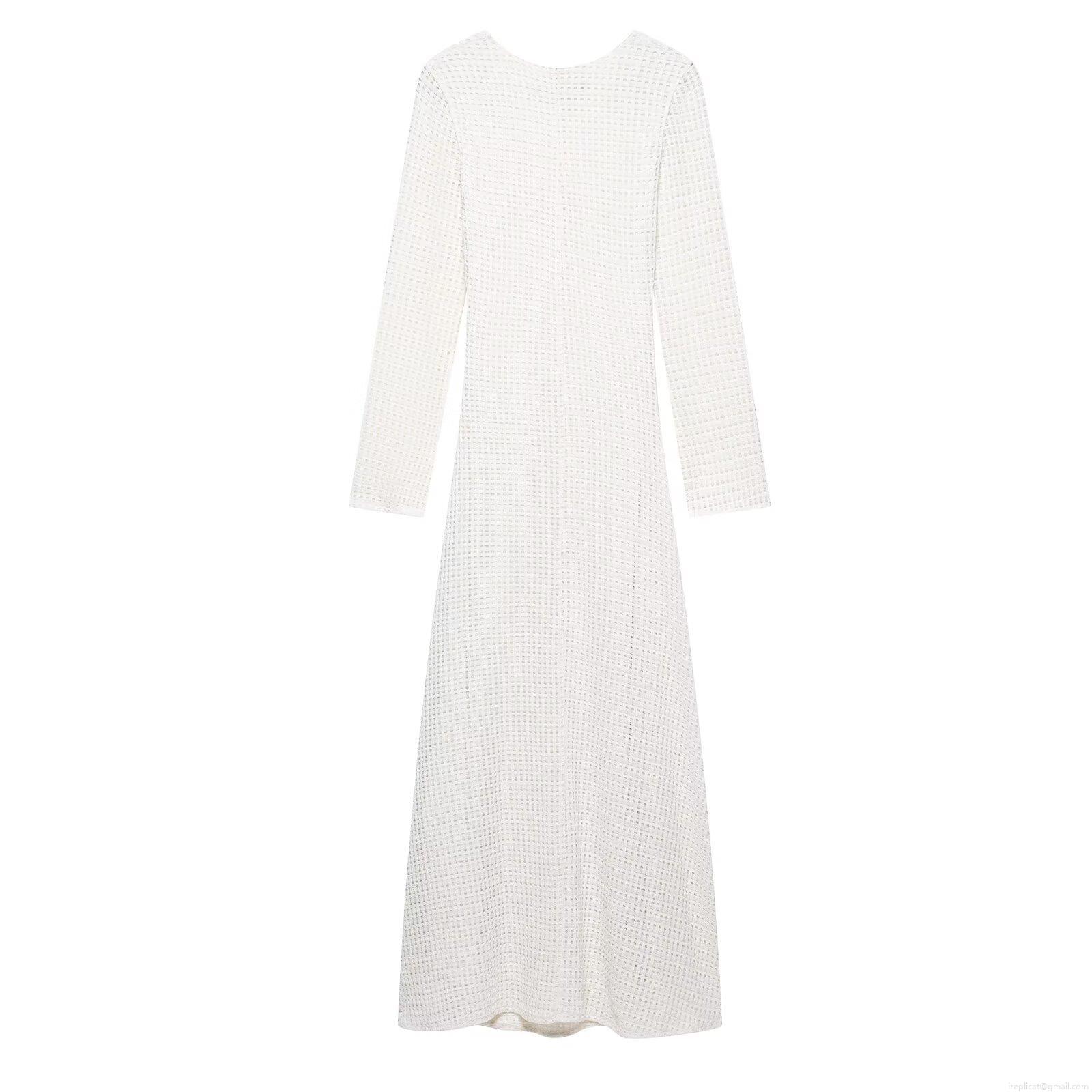 • Women Elegant White Crochet Knit Maxi Dress Sexy V Neck Long Sleeve Mesh Hollow Out Dress With Metal Buckle For Party Club Vacation