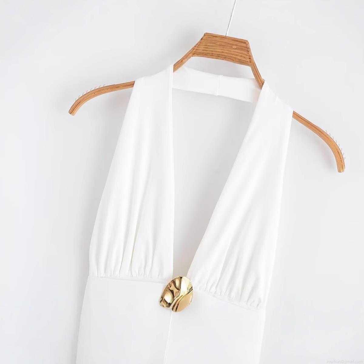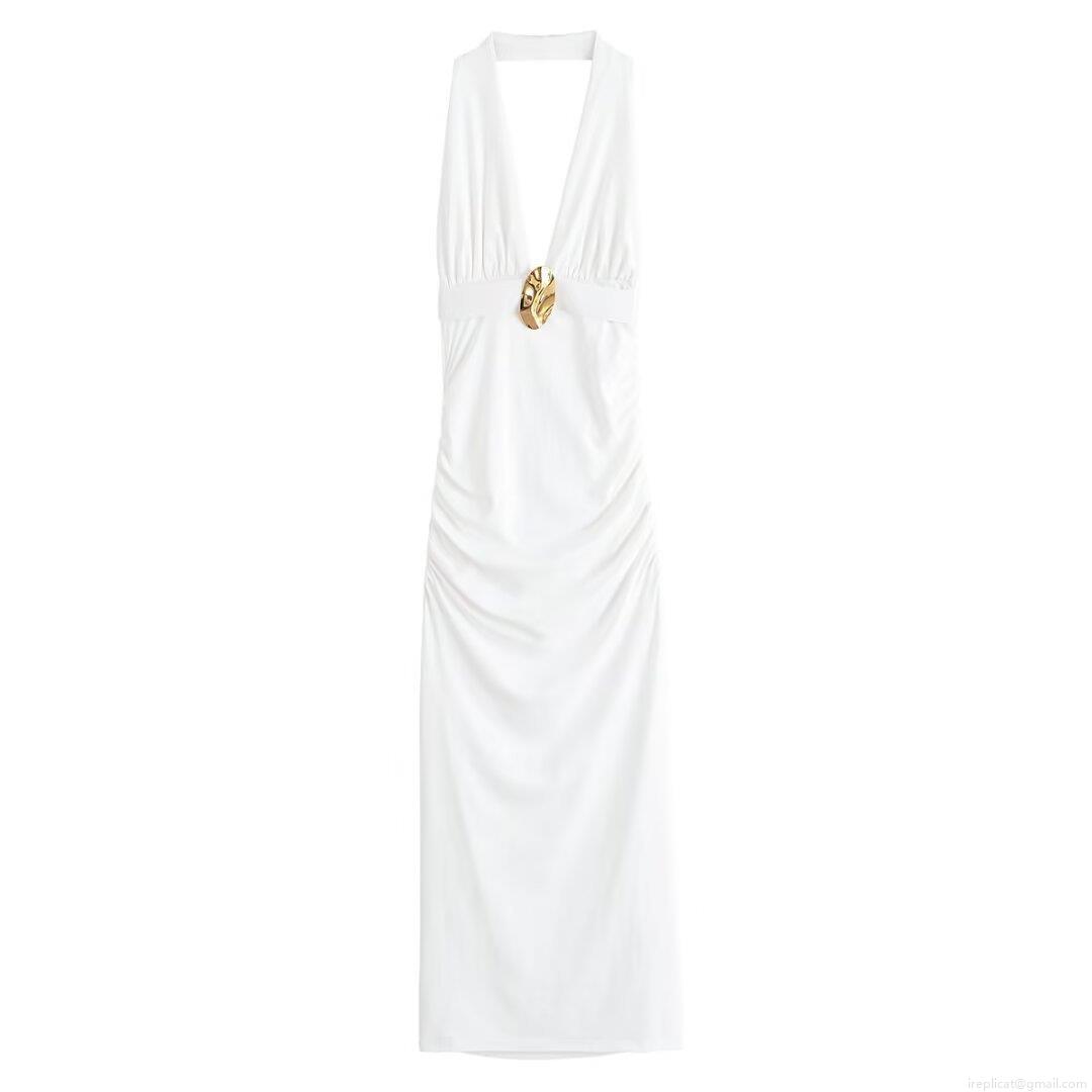 • Women Elegant White Halter Maxi Dress Sexy Deep V-Neck Ruched Long Party Dress with Gold Metal Buckle Sleeveless Backless Evening Gown for Cocktail Banquet