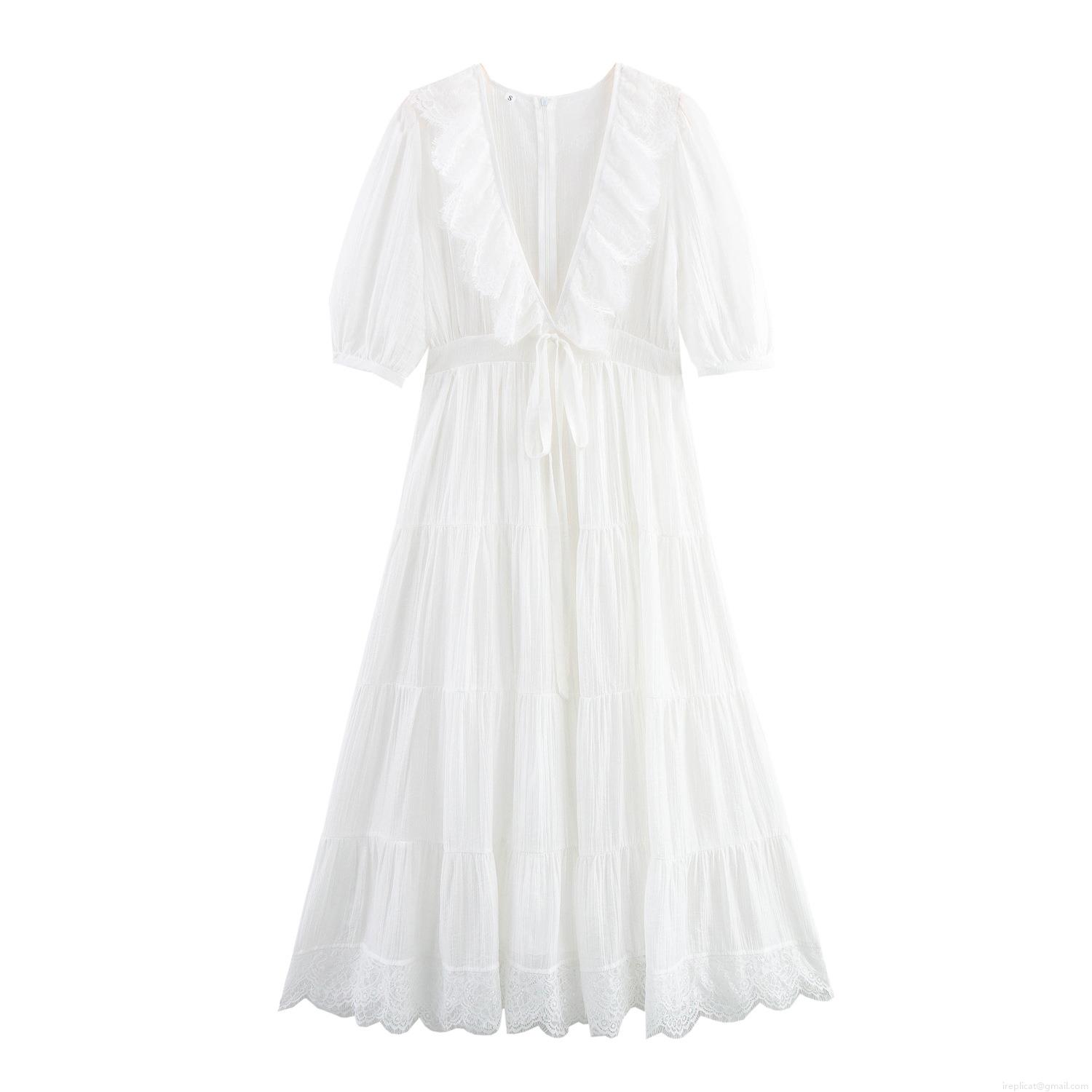 • Women Elegant White Lace Stitching Maxi Dress V Neck Short Sleeve Ruffle Tiered Cake Dress For Wedding Party Vacation Summer Ladies Polyester Long Dress