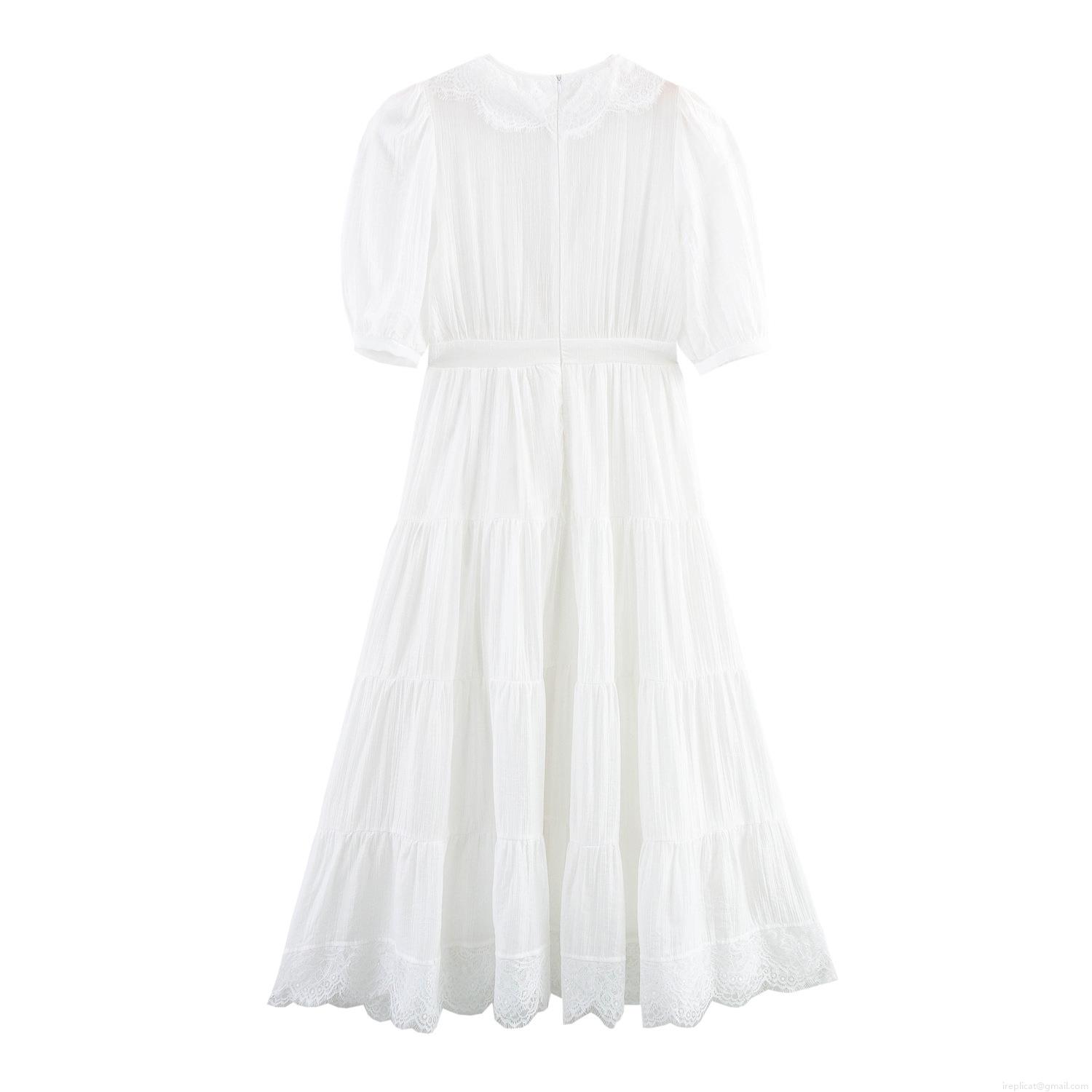 Women Elegant White Lace Stitching Maxi Dress V Neck Short Sleeve Ruffle Tiered Cake Dress For Wedding Party Vacation Summer Ladies Polyester Long Dress