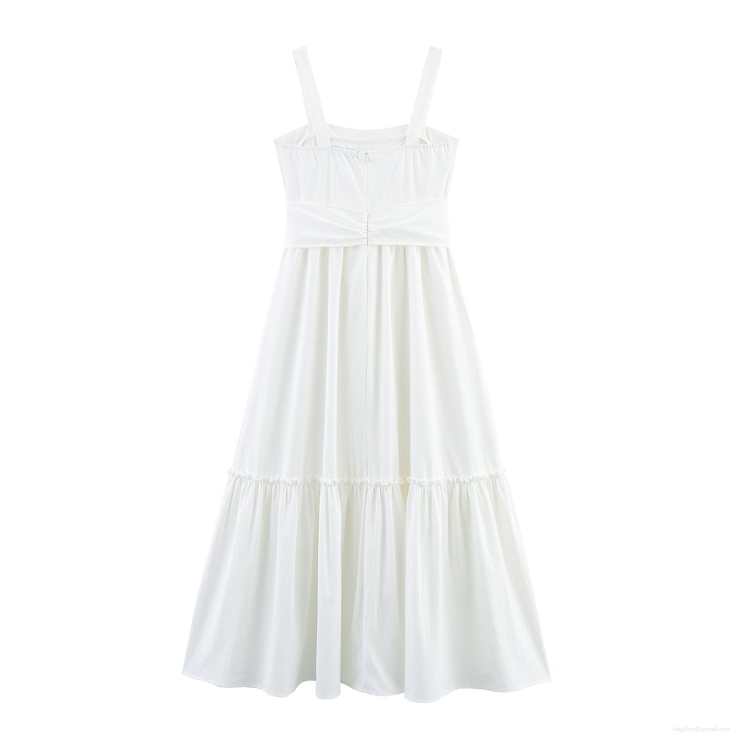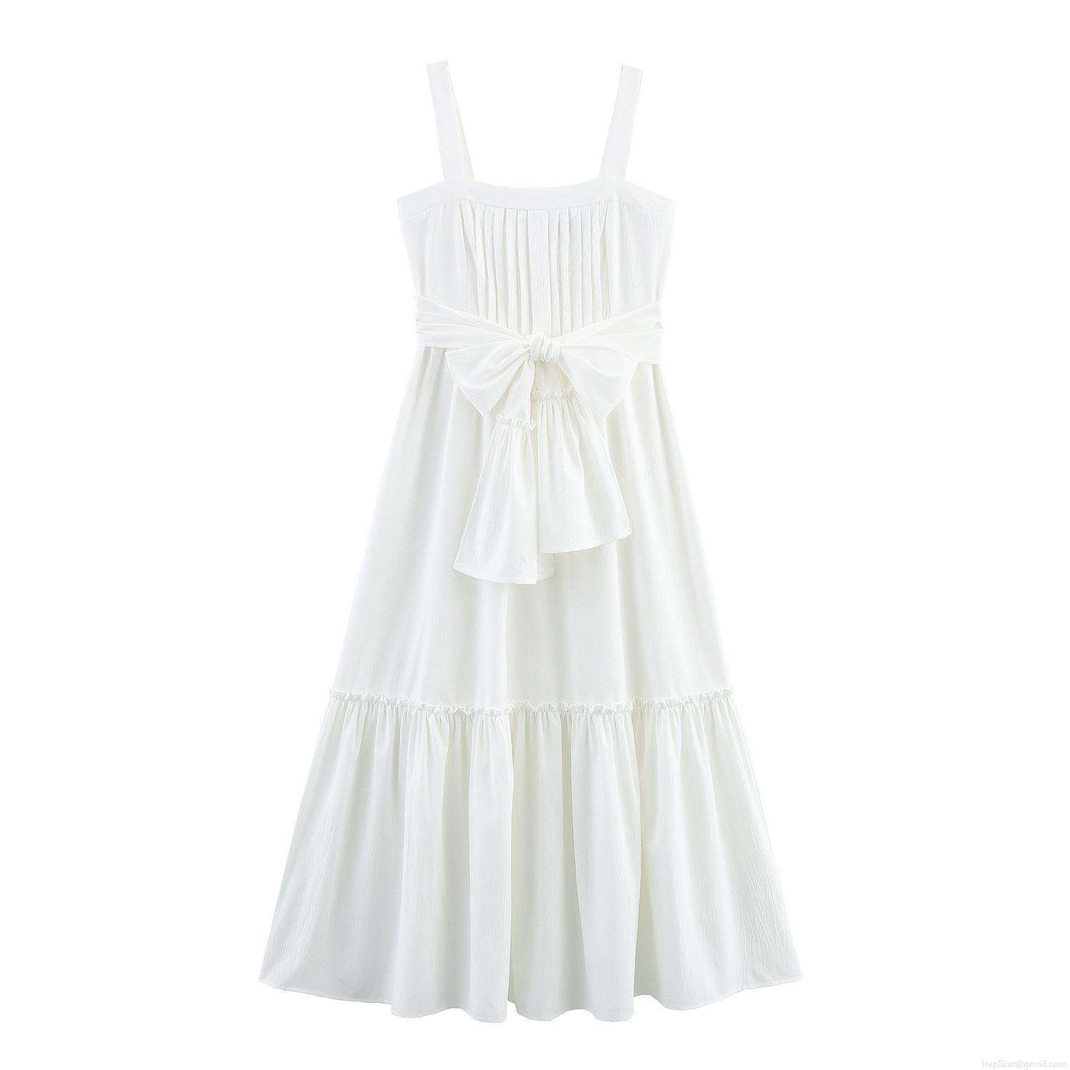 • Women Elegant White Polyester Maxi Dress Square Neck Sleeveless Tiered Cake Dress With Bow Tie Waist Pleated Long Dress For Summer Vacation Party Ladies