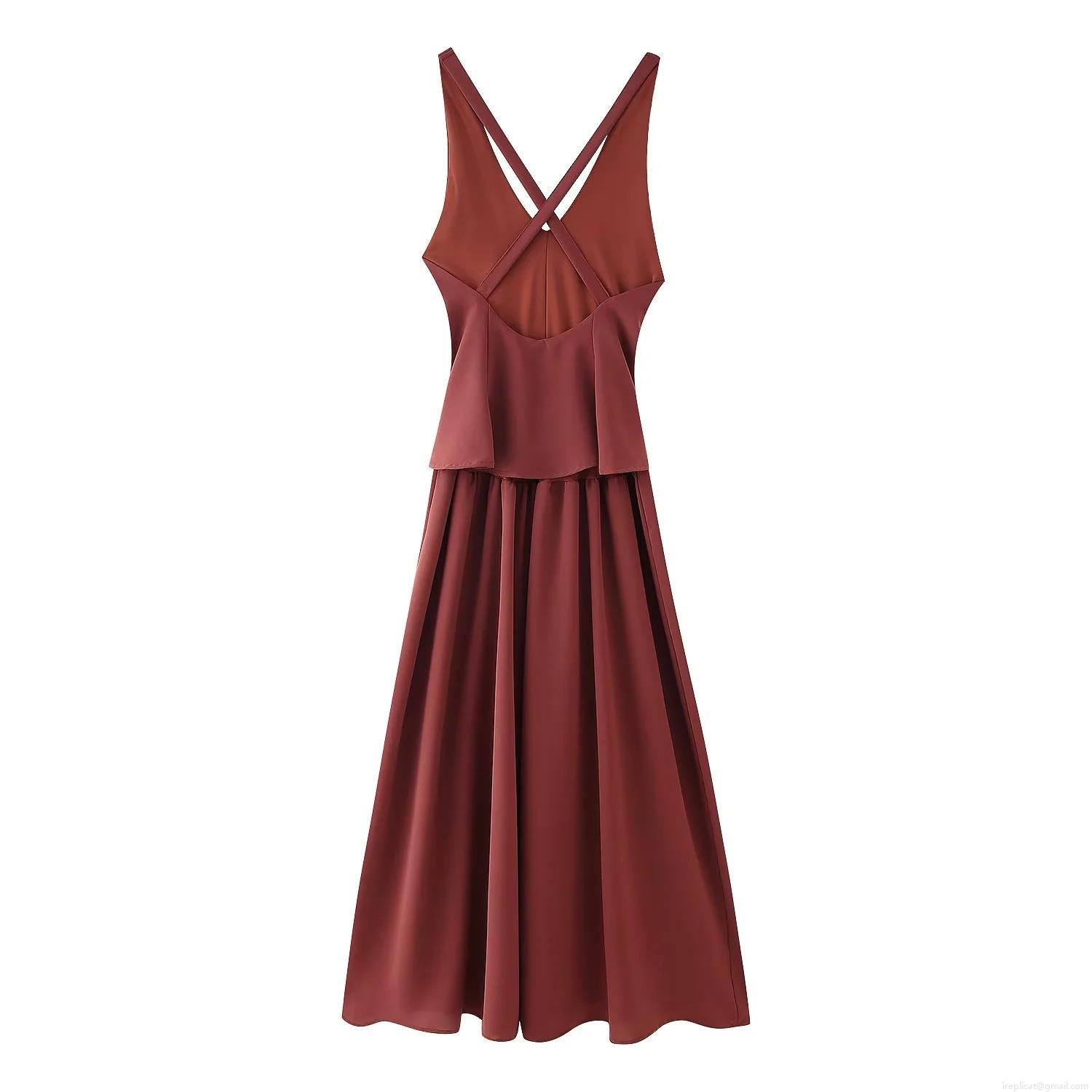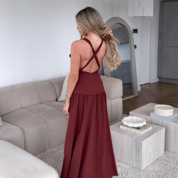 • Women Elegant Wine Red V Neck Maxi Dress Backless Criss Cross Straps Sleeveless Polyester Solid Color Long Party Evening Gown Fashion