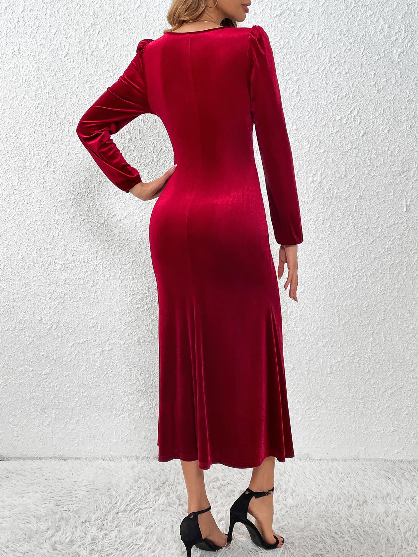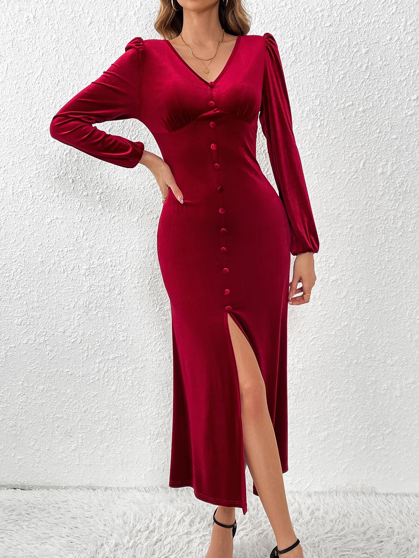 • Women Elegant Wine Red Velvet Maxi Dress Deep V Neck Long Puff Sleeve Slim Fit Slit Bodycon Evening Gown For Party Club Wedding