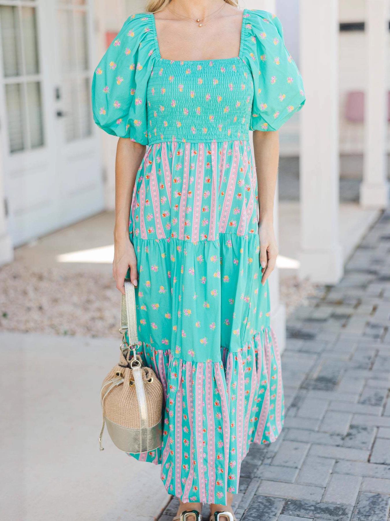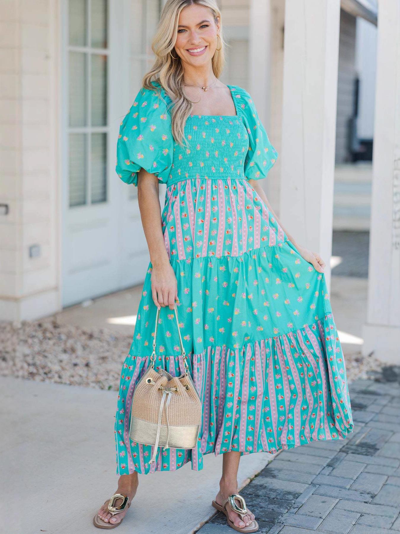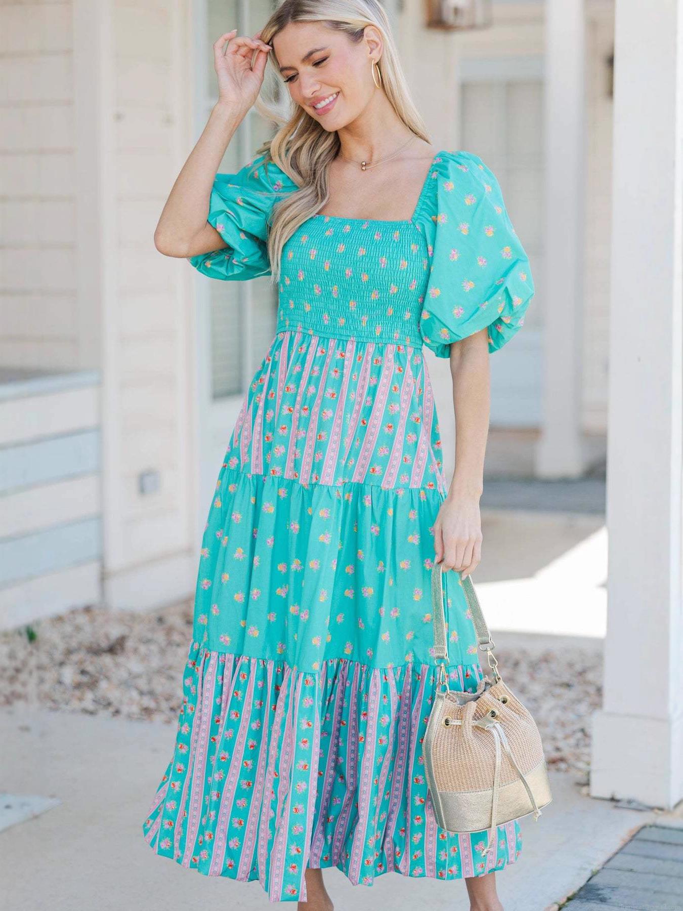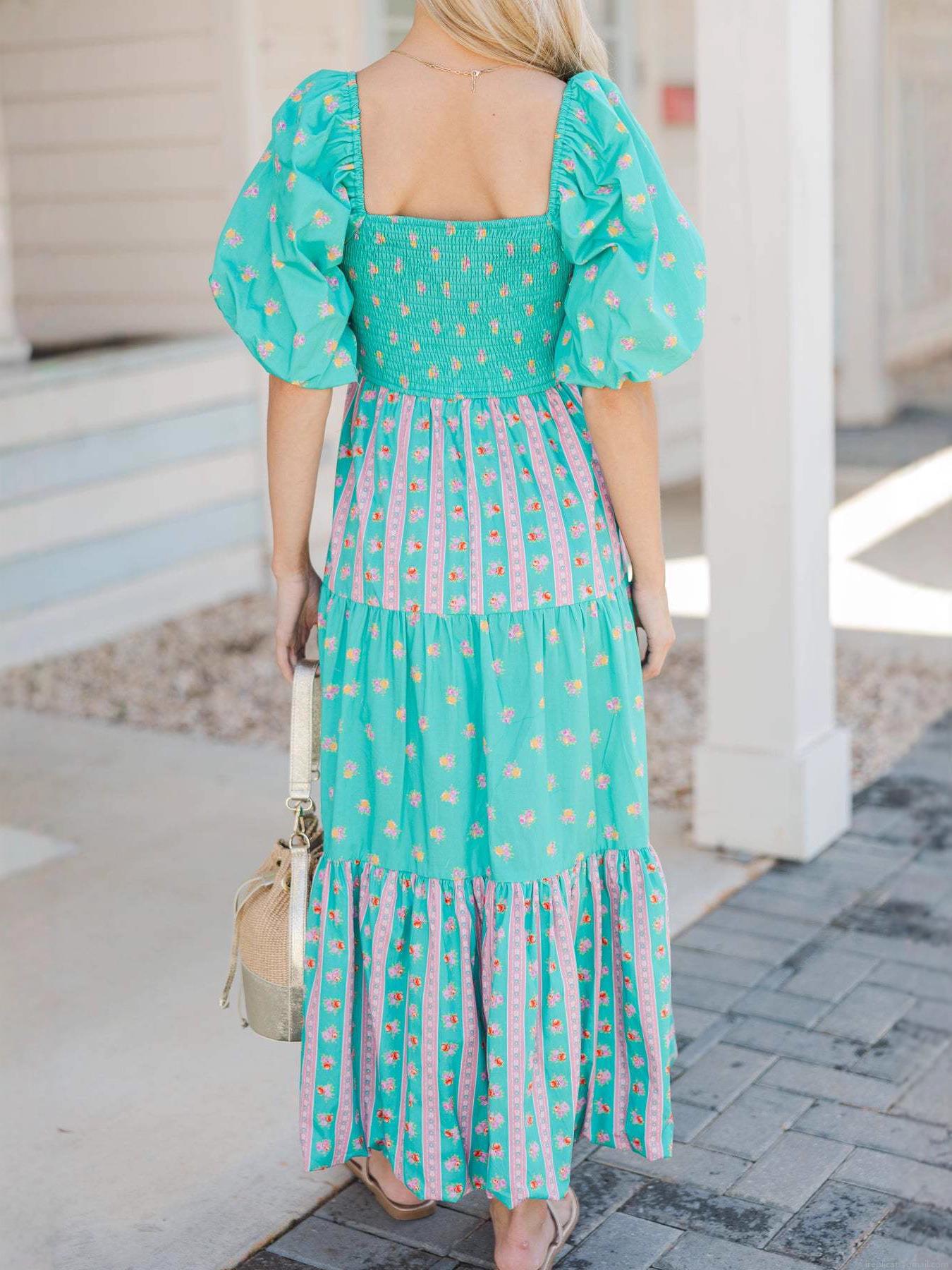 • Women Floral Maxi Dress Puff Sleeve Square Neck Smocked Waist Tiered Long Dresses Summer Vacation Beach Party Streetwear Polyester Outfits