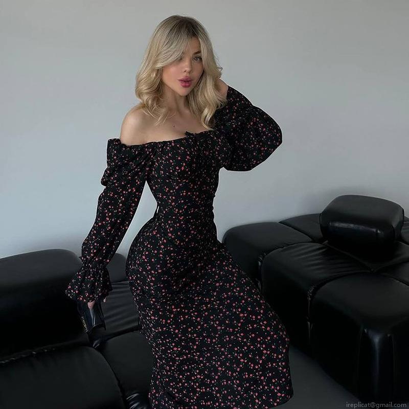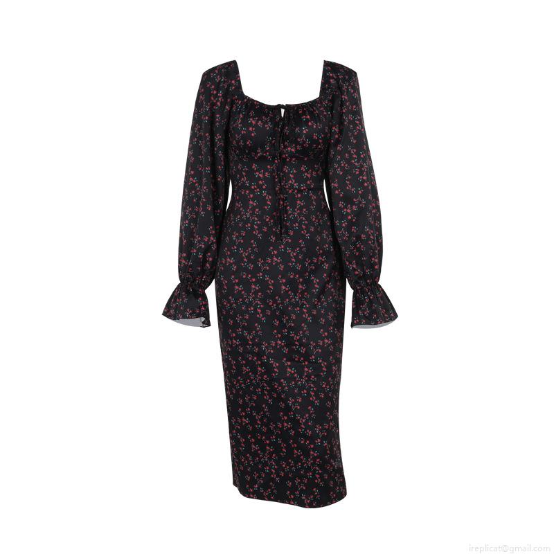 • Women Floral Print Bodycon Maxi Dress Square Neck Lantern Long Sleeve Lace-up Backless Slim Fit Elegant French Vintage Dress Autumn Outfit