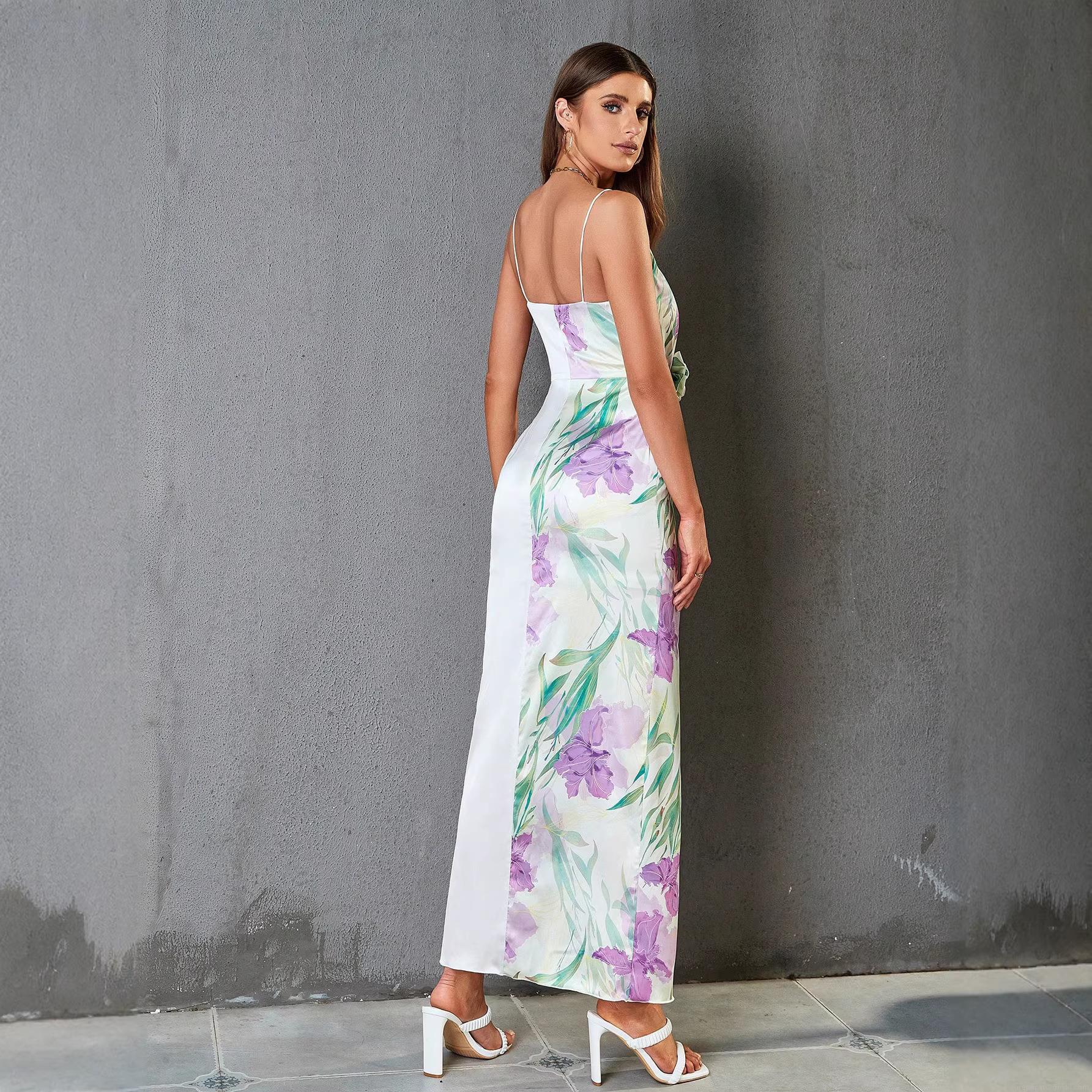 Women Floral Print Satin Slip Maxi Dress Elegant V Neck High Slit 3D Flower Applique Sexy Sleeveless Backless Summer Beach Resort Party Evening Dress