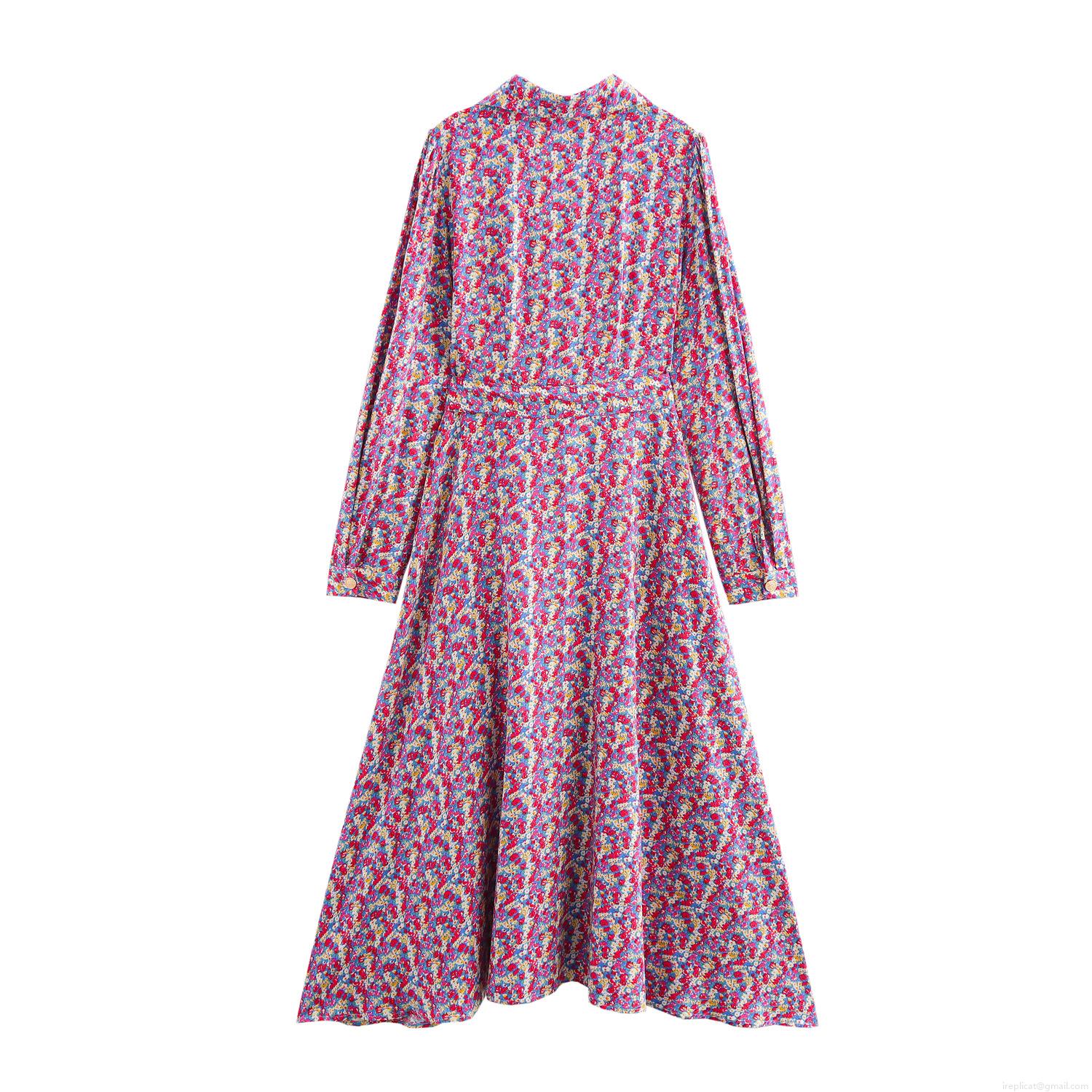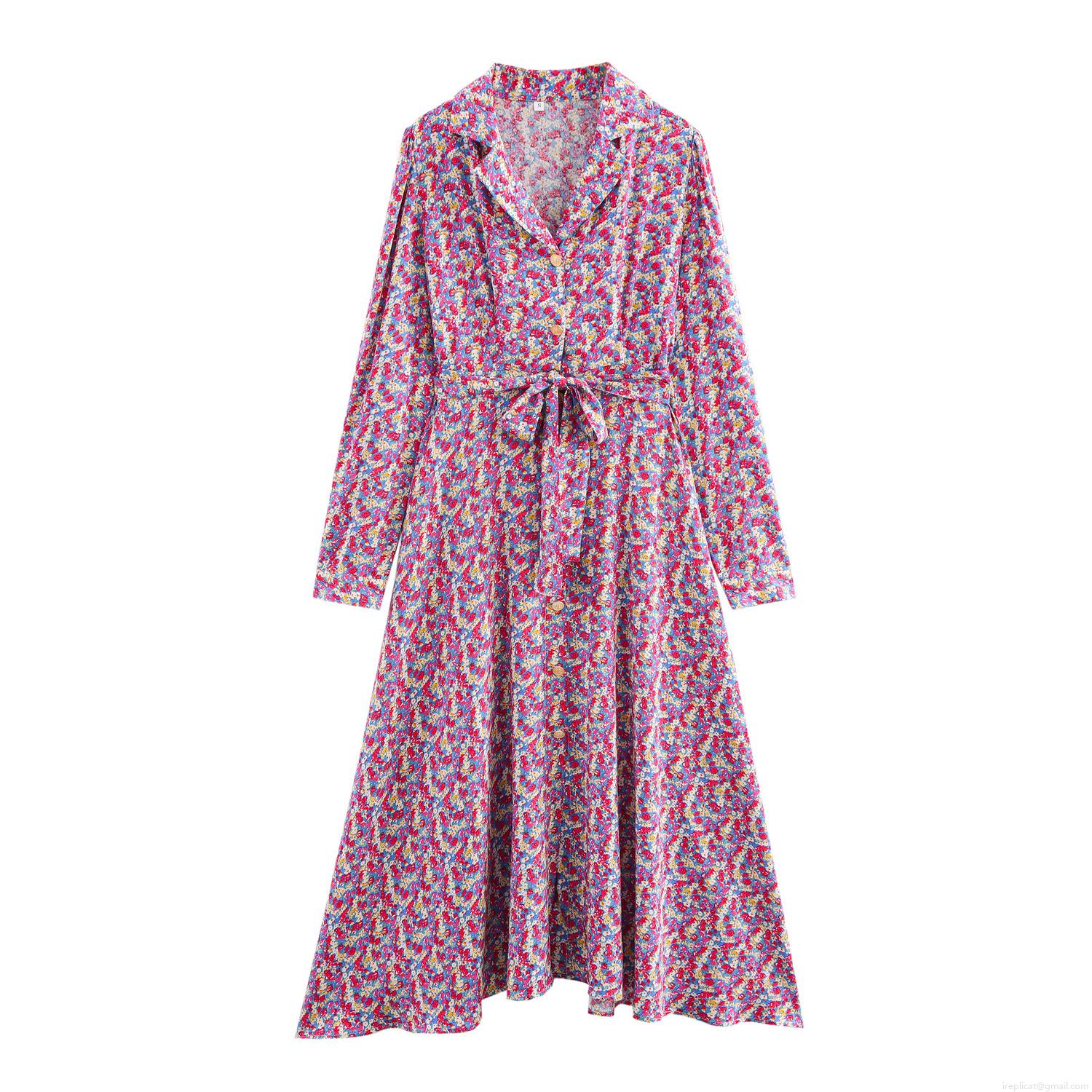 • Women French Pastoral Floral Maxi Dress Elegant Lapel Long Sleeve Button Down Polyester Dress With Waist Tie Vintage Chic Floral Printed Long Dress