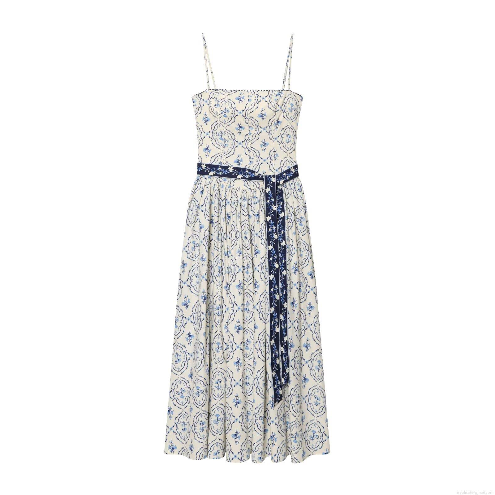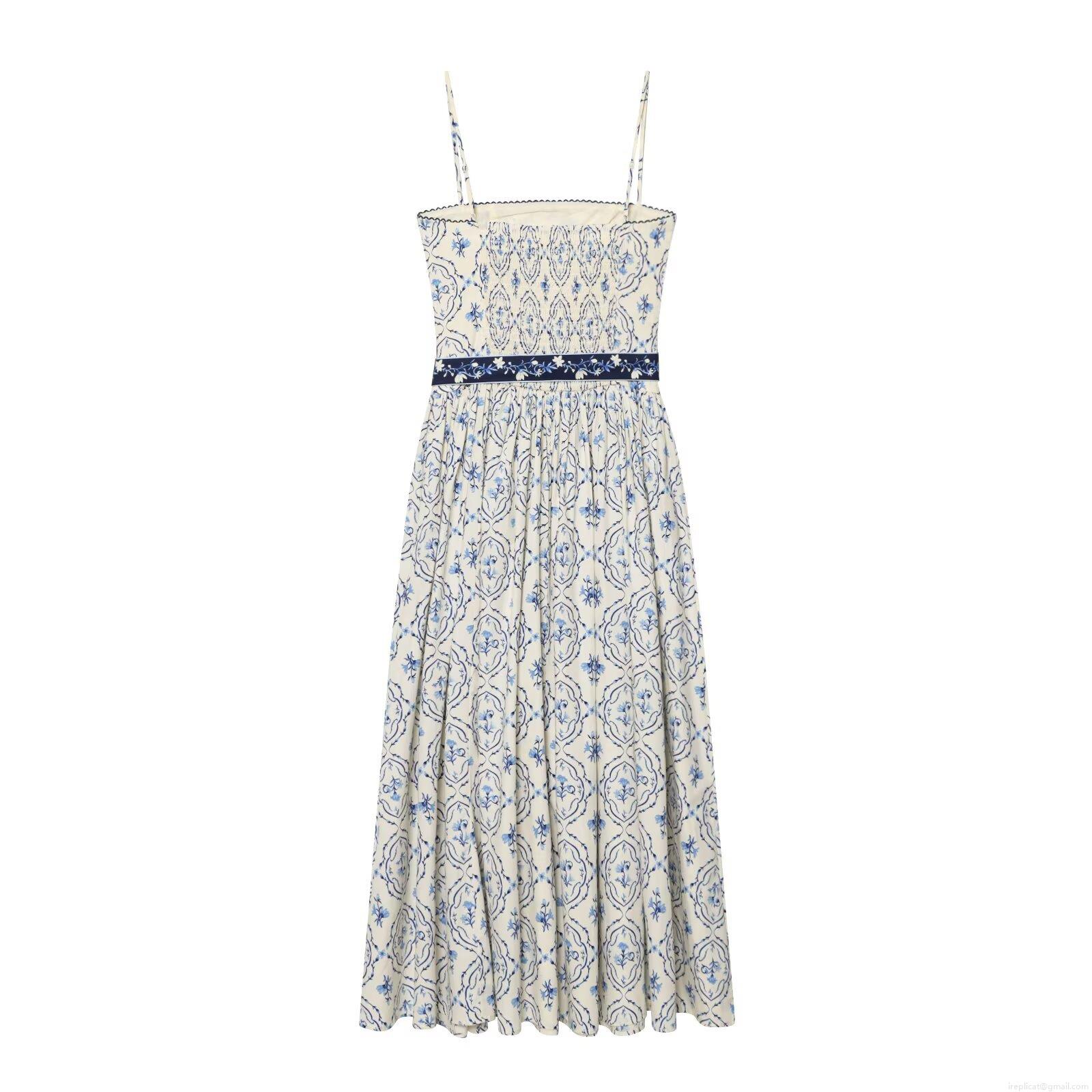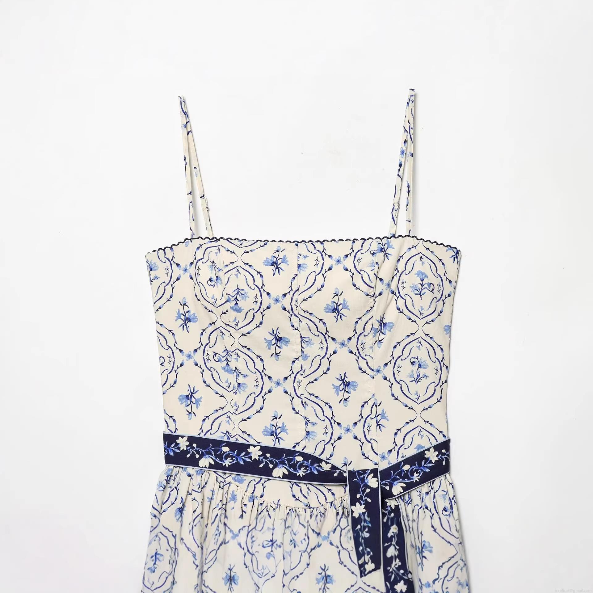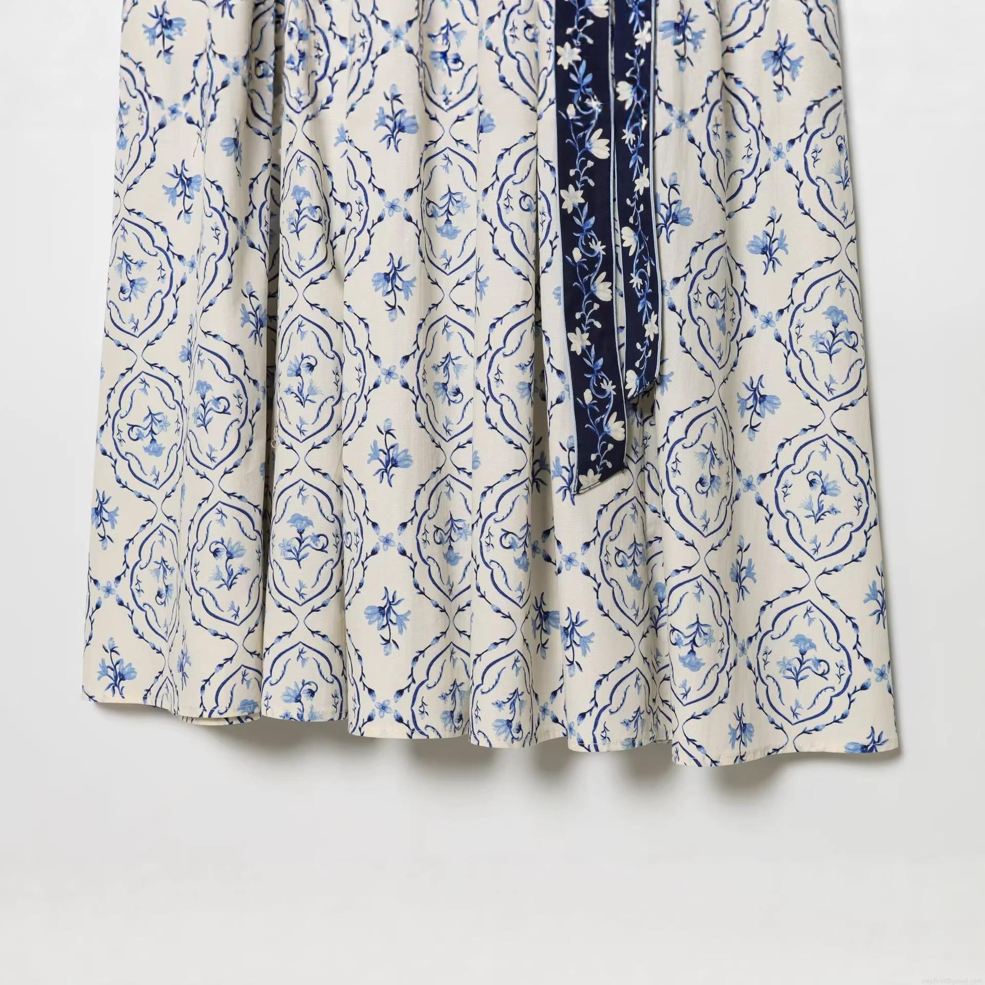 Floral Pattern, Printing, Off-shoulder, Gathering, Wavy Edge, Belt, Blue And White Porcelain Style Flowers