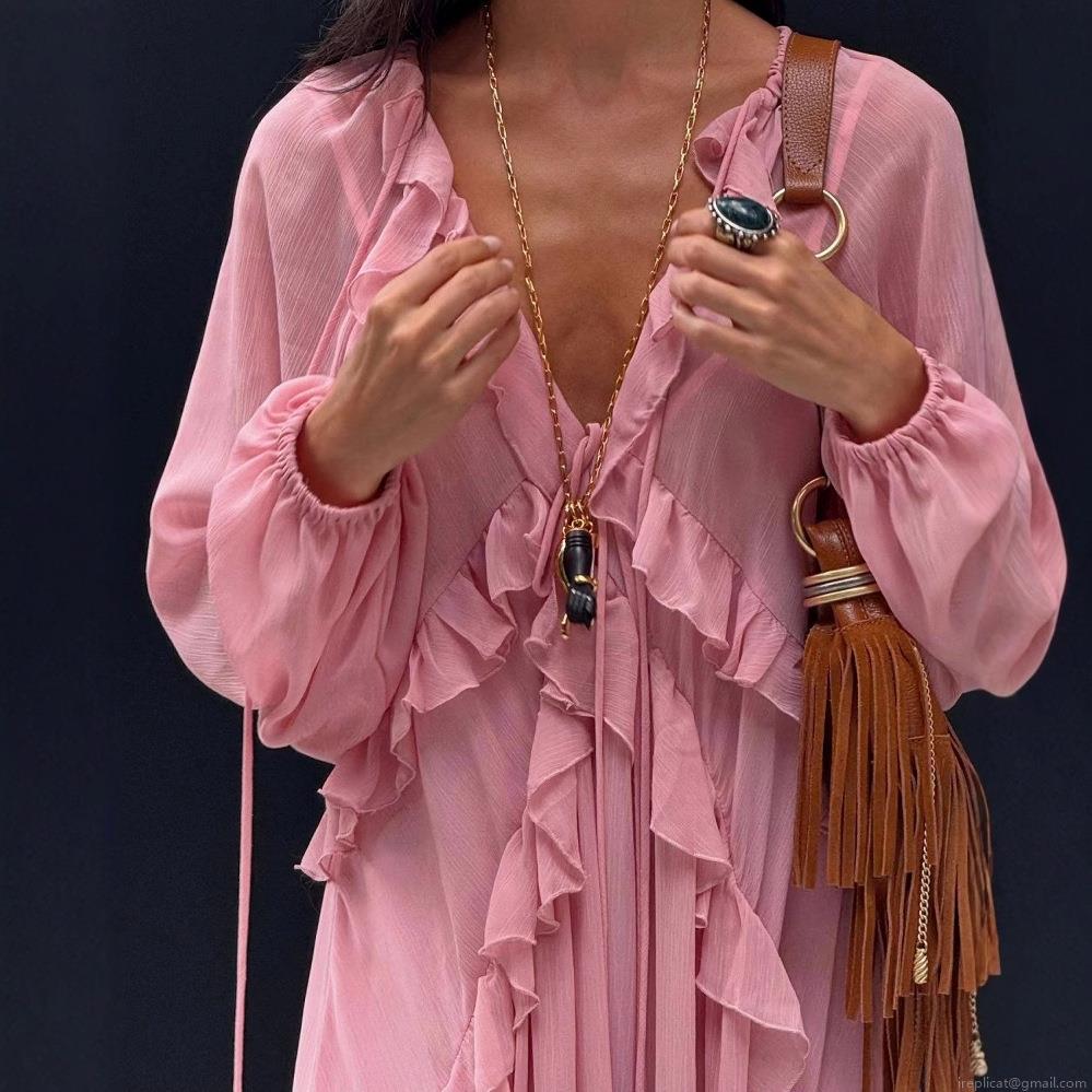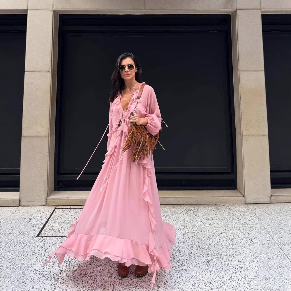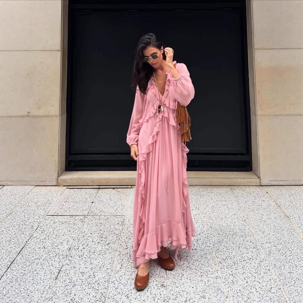 • Women French Romantic Ruffle Maxi Dress Solid Pink Chiffon Long Sleeve V-Neck Loose Bohemian Vacation Elegant Tiered Flowy Party Dress