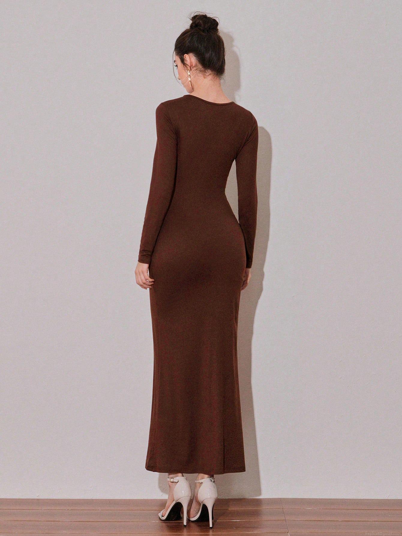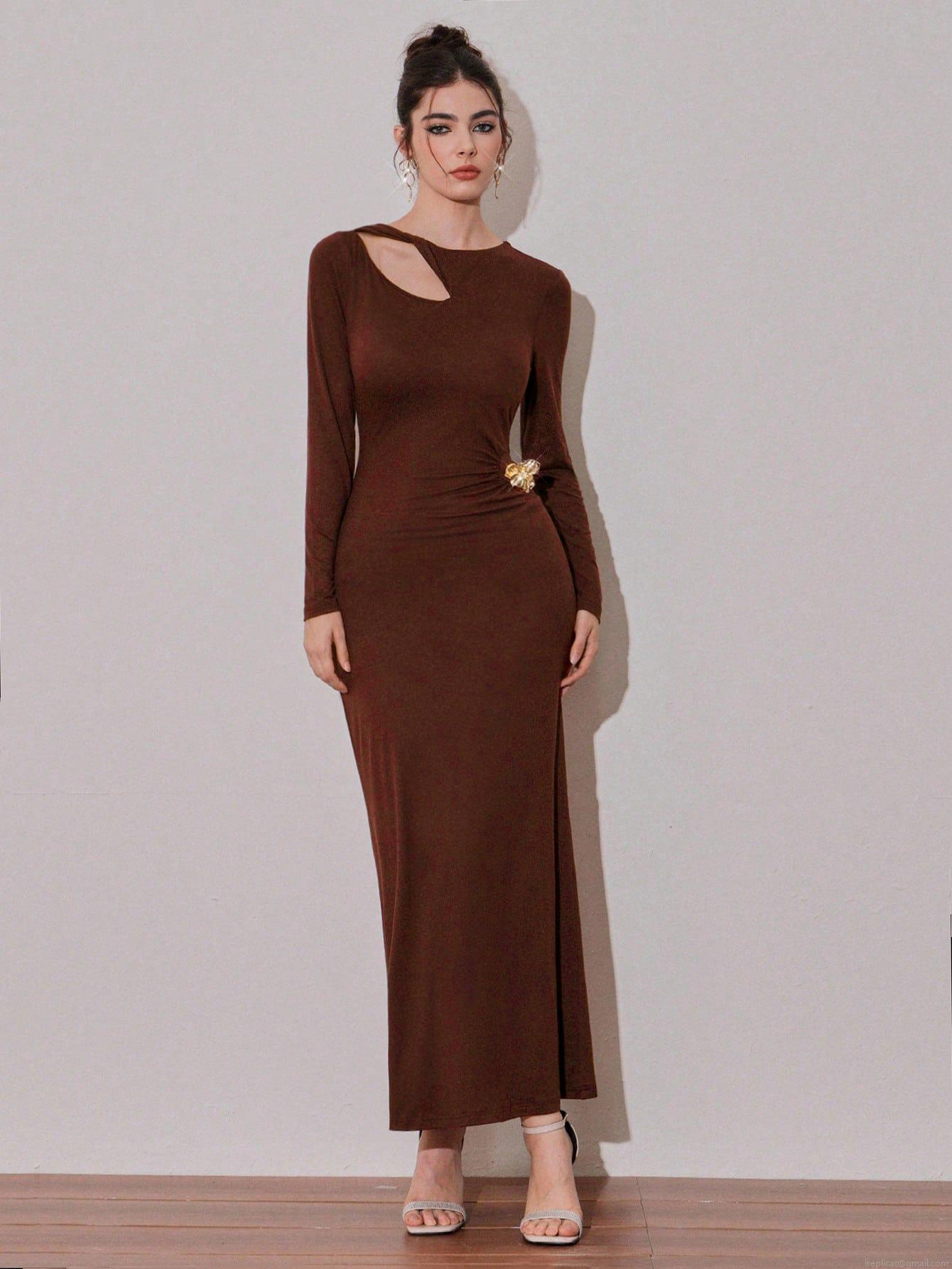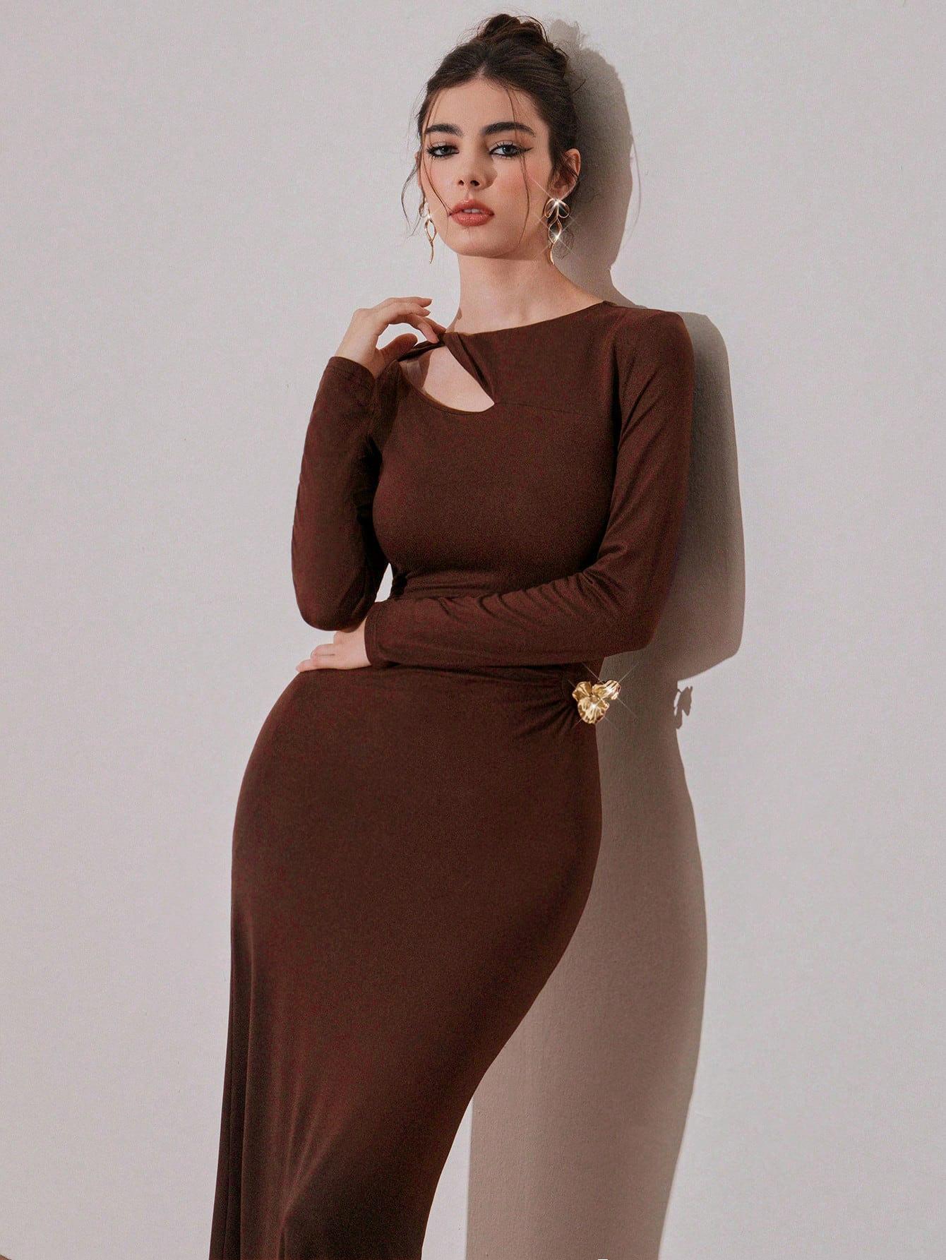 • Women French Vintage Hollow Out Long Sleeve Maxi Dress Slim Fit Bodycon Evening Party Long Dress With Gold Flower Brooch 95% Polyester 5% Elastane Knit Dress