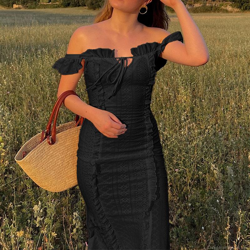 • Women French Vintage Off-Shoulder Spaghetti Strap Maxi Dress Elegant Lace Hollow Out Ruffle A-Line High Waist Long Sundress For Summer Beach Vacation Party