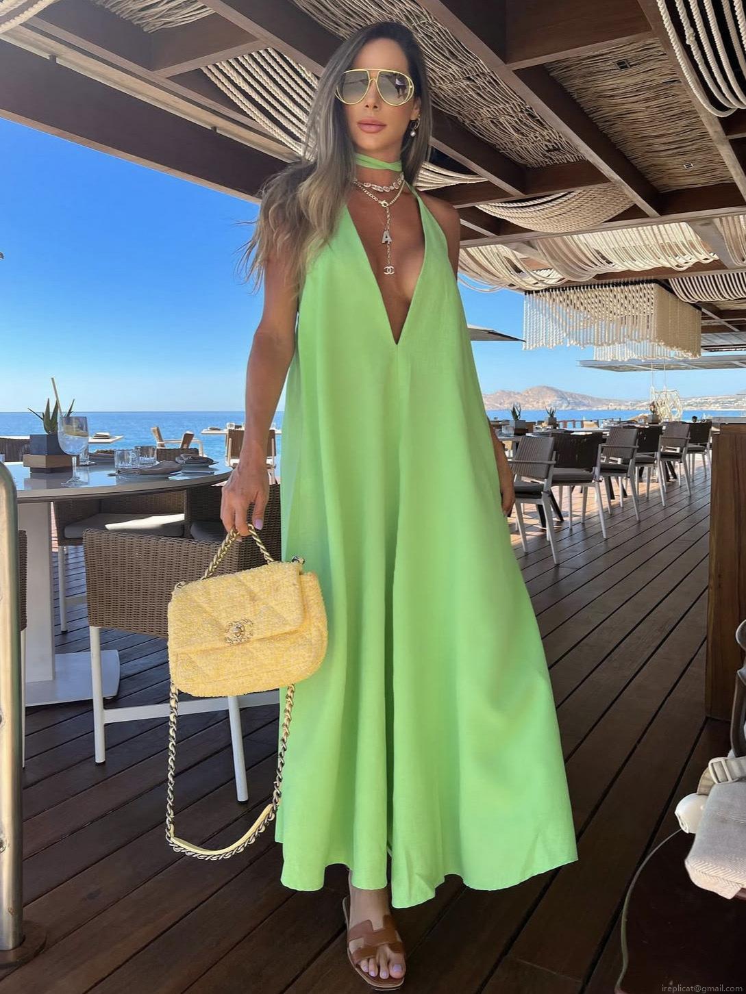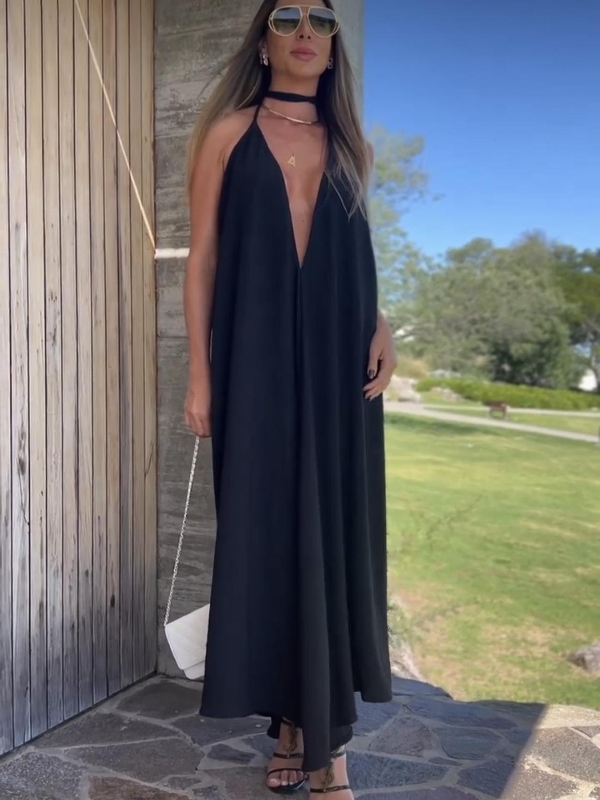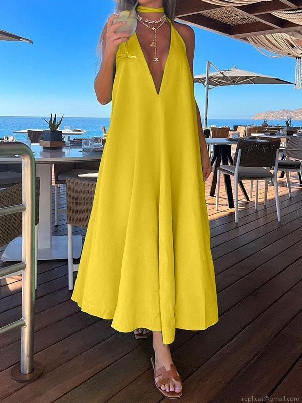 • Women Halter Deep V-Neck Maxi Dress Summer Vacation Beach Backless Loose A-Line Long Sundress Sleeveless Solid Color Polyester Blend Elegant Party Vestidos