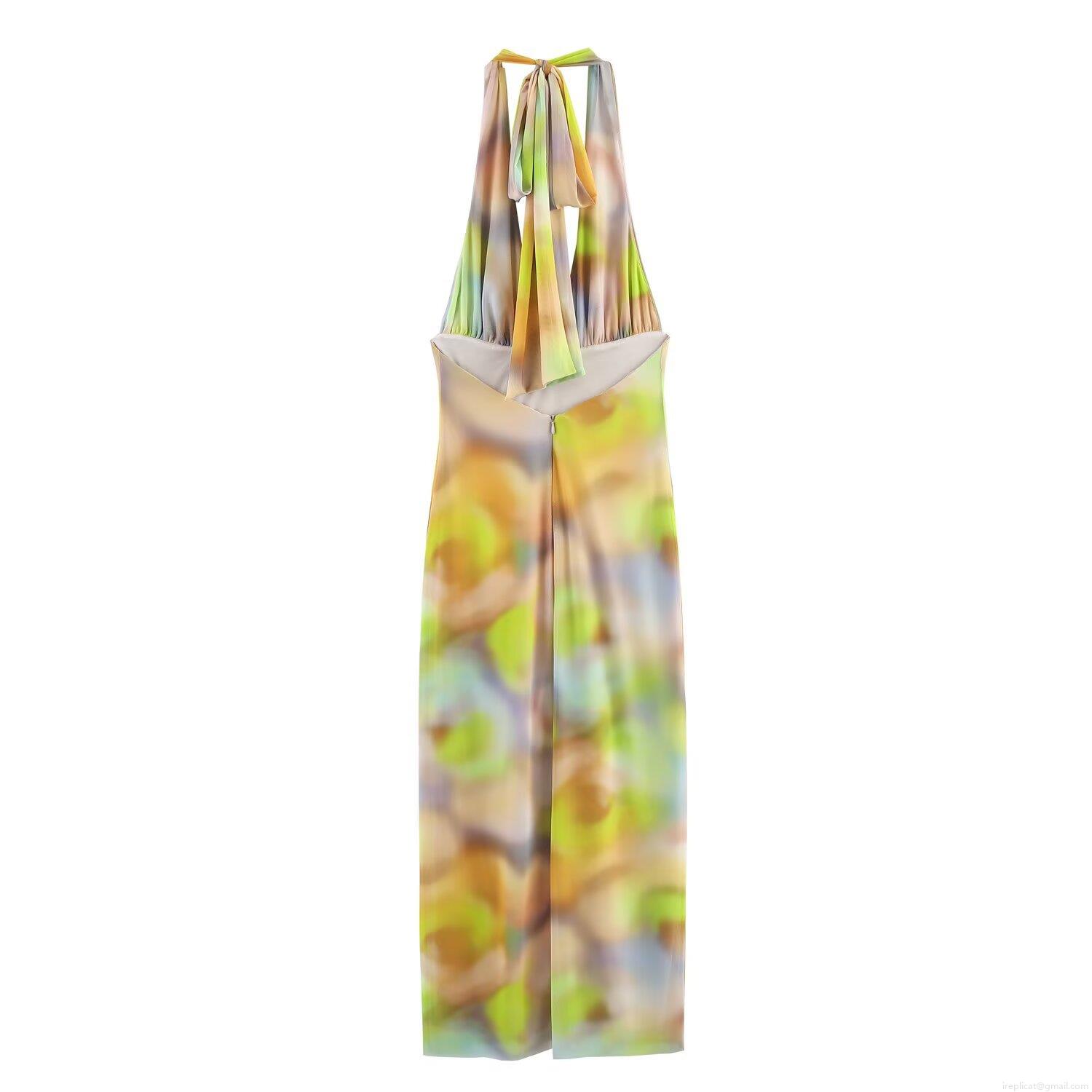 • Women Halter Neck Backless Abstract Print Mesh Maxi Dress Summer Bohemian Vacation Style Sleeveless Long Sundress Polyester Beachwear Clothing