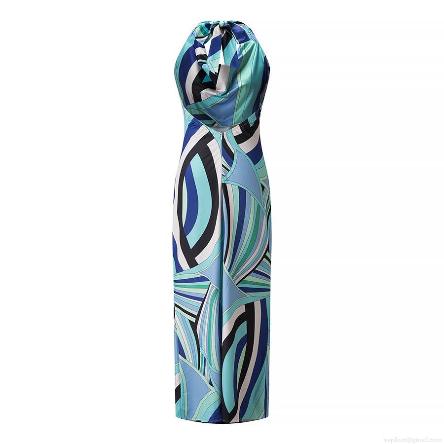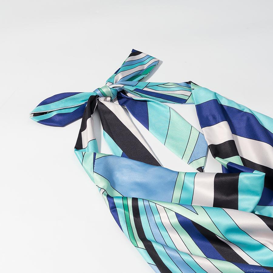 Women Halter Neck Backless Geometric Printed Slim Fit Maxi Dress Sexy Cowl Neck Satin Polyester Sleeveless Party Club Long Dress