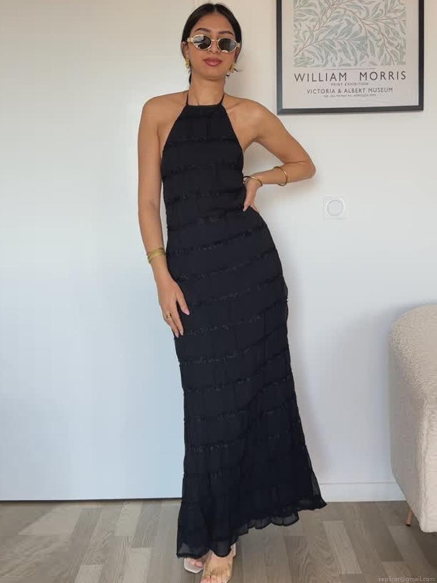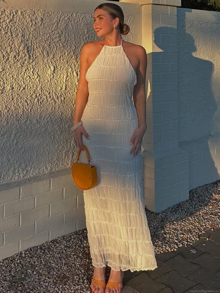 • Women Halter Neck Backless Pleated Maxi Dress Sexy Solid Color Ruffle Chiffon Bodycon Long Dress For Summer Beach Vacation Party Evening