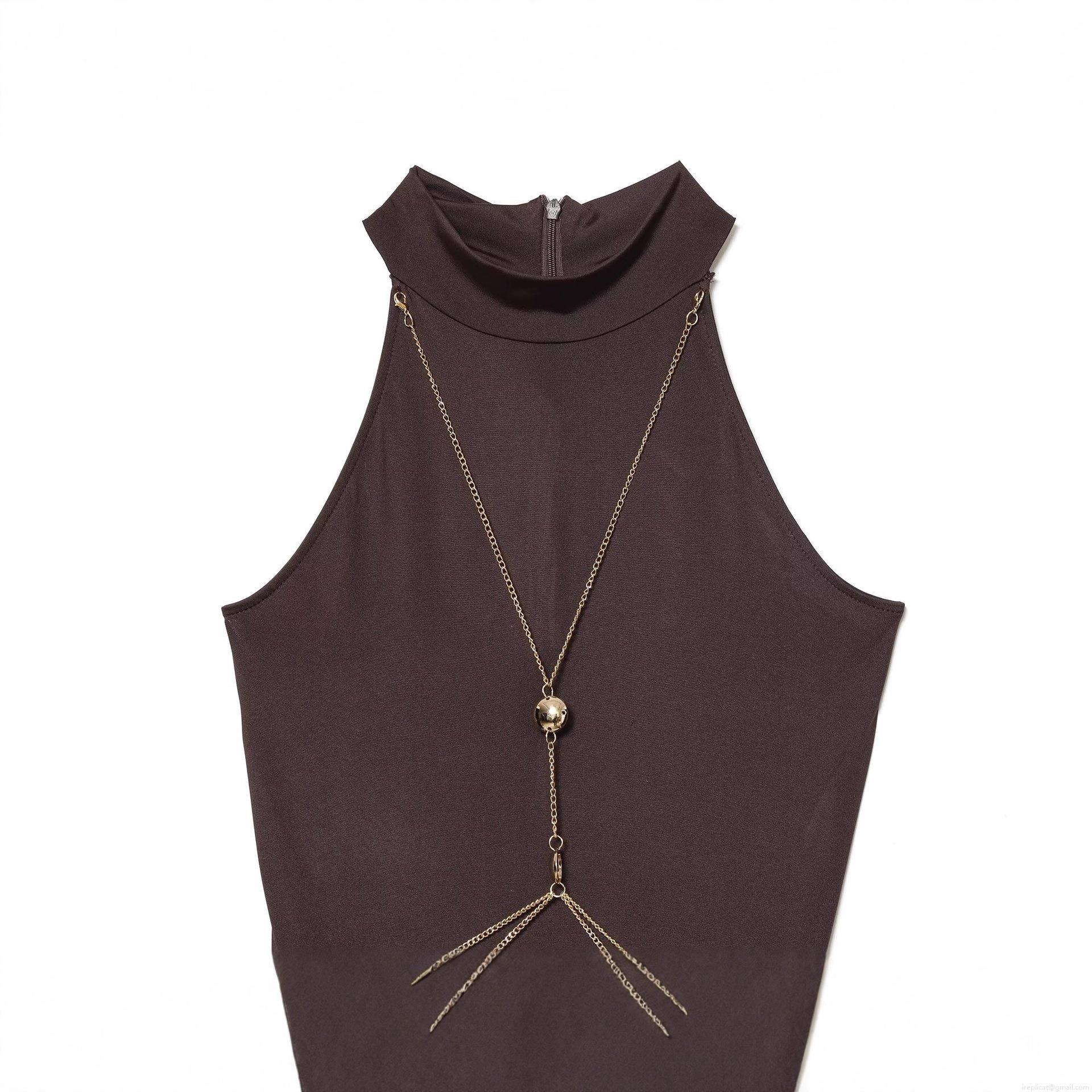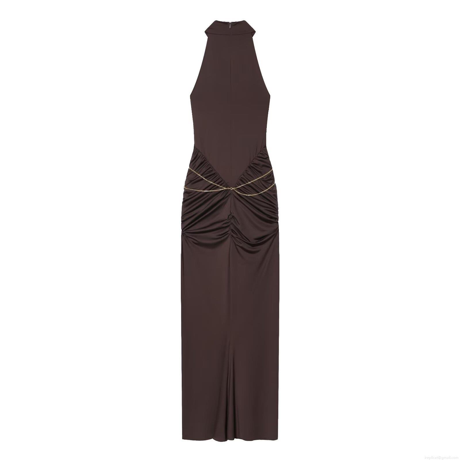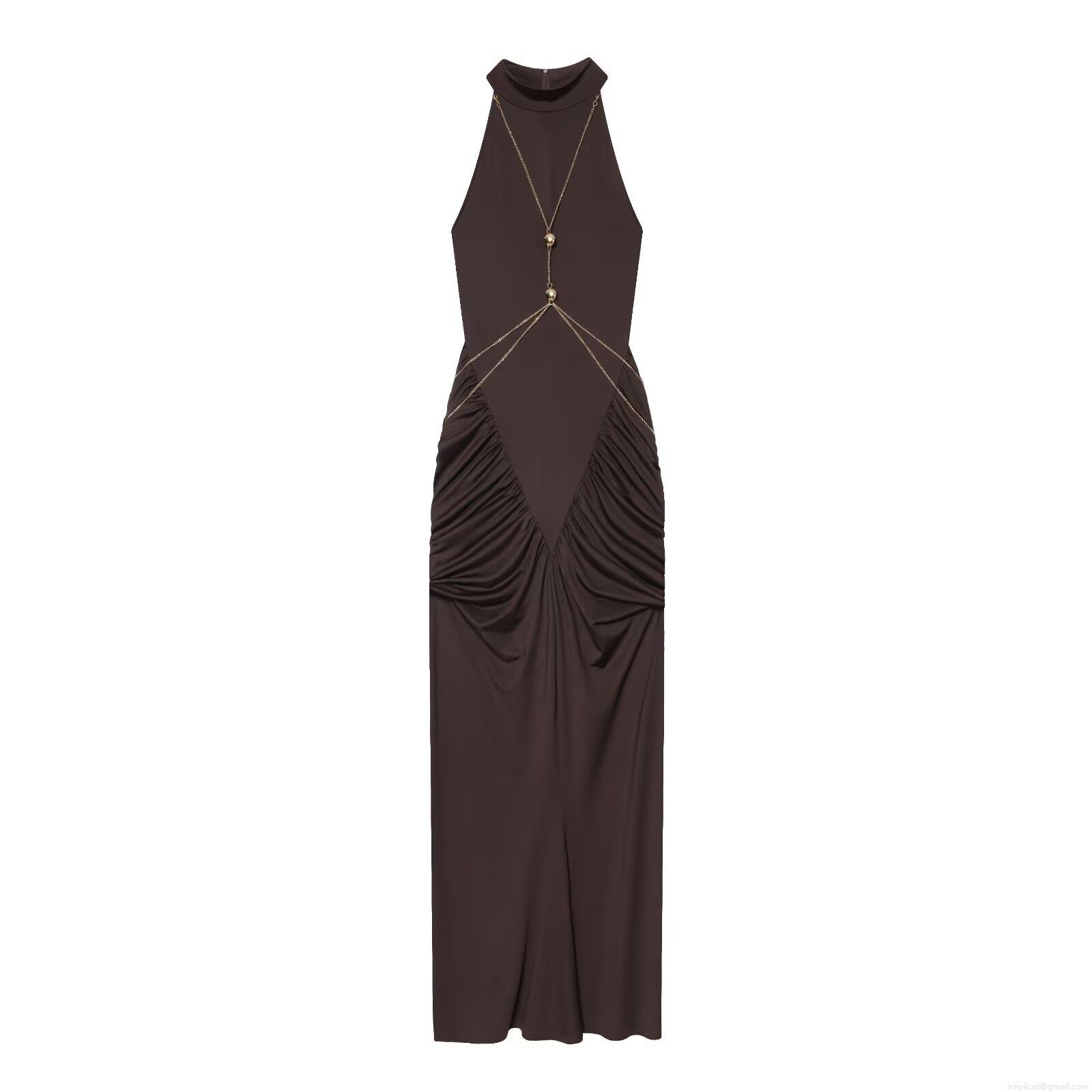 • Women Halter Neck Bodycon Maxi Dress Long Sleeve With Metal Chain Ruched Elegant Solid Color Party Evening Long Dress For Ladies
