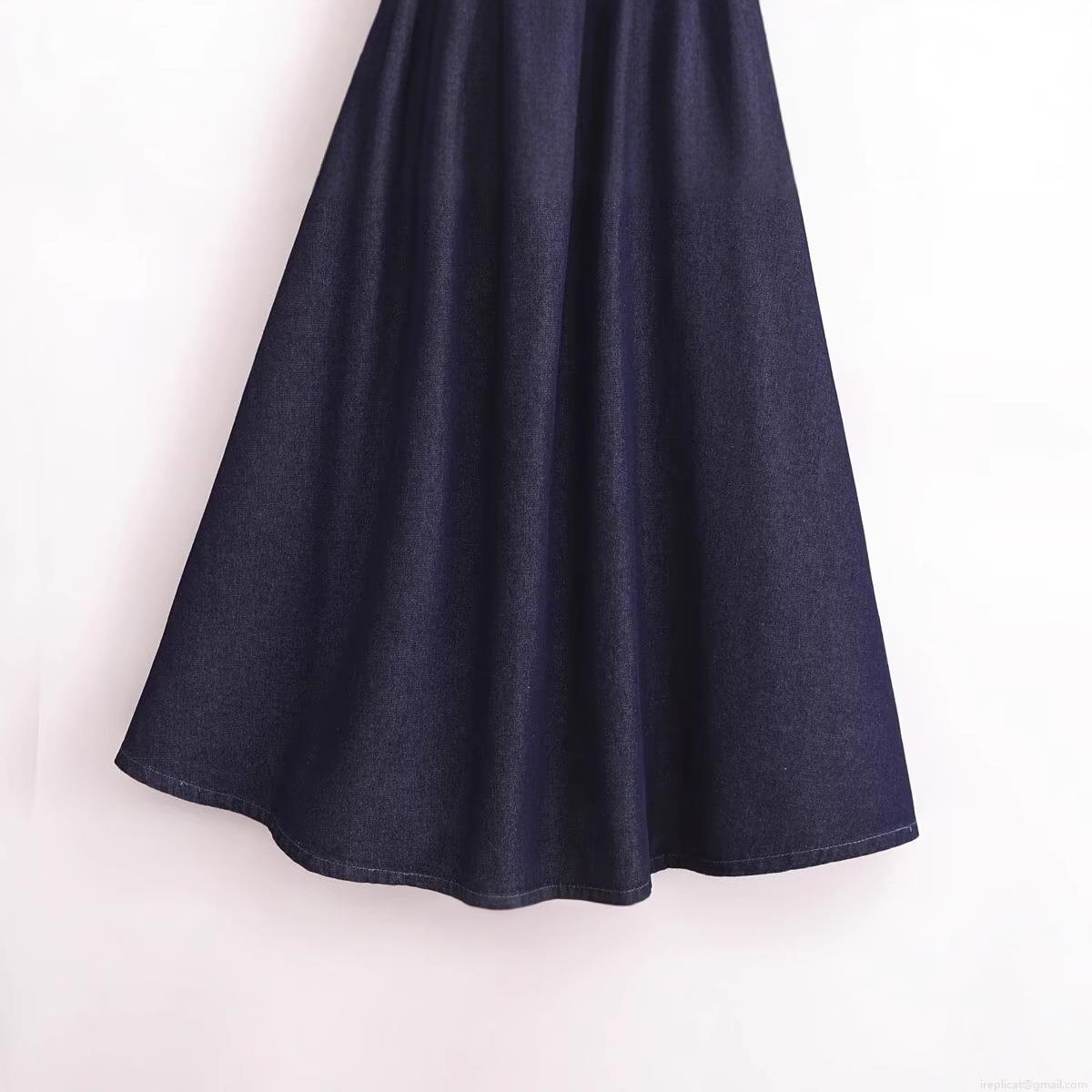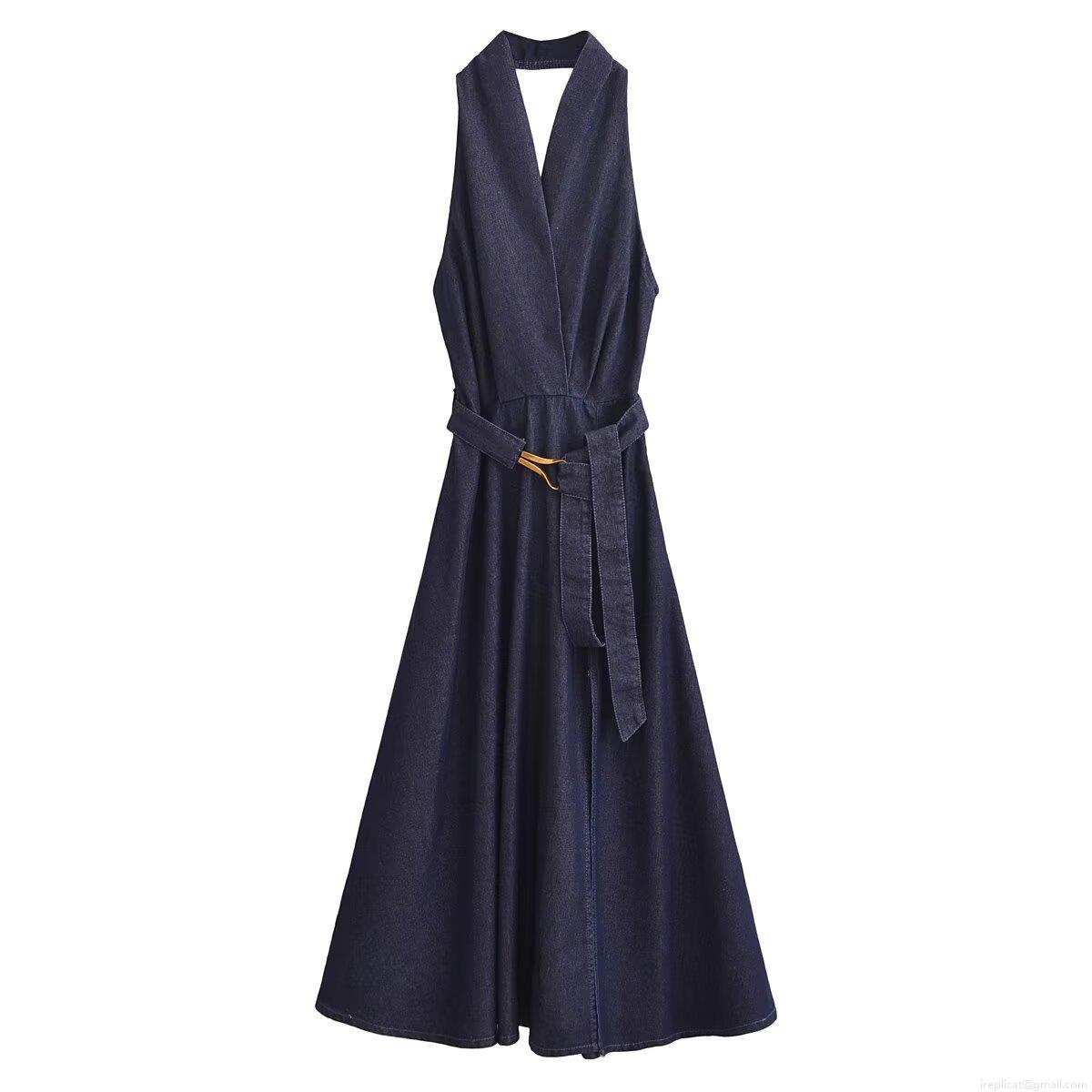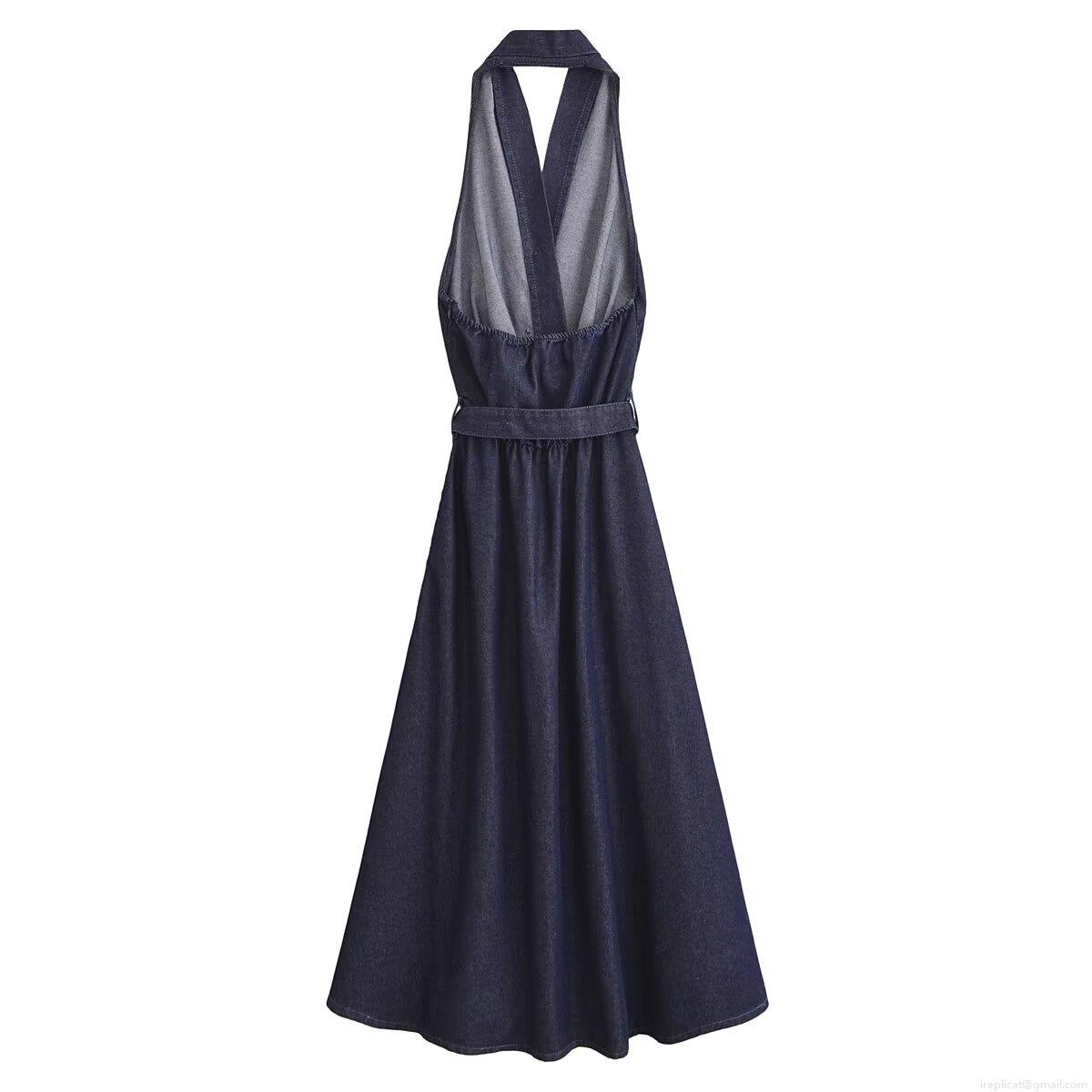 • Women Halter Neck Denim Maxi Dress Sexy Backless V Neck Sleeveless A Line Long Dress With Belt For Summer Streetwear Fashion Party