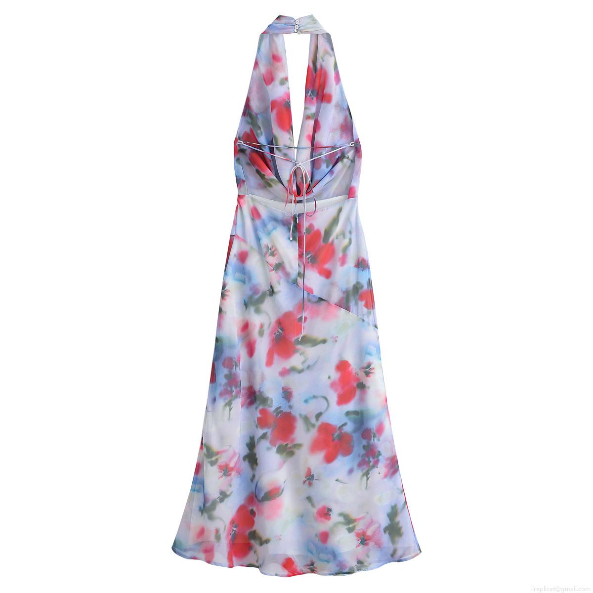 • Women Halter Neck Maxi Dress 100% Polyester Floral Print V-Neck Backless Sleeveless Summer Resort Elegant A-Line Long Dress For Party Vacation