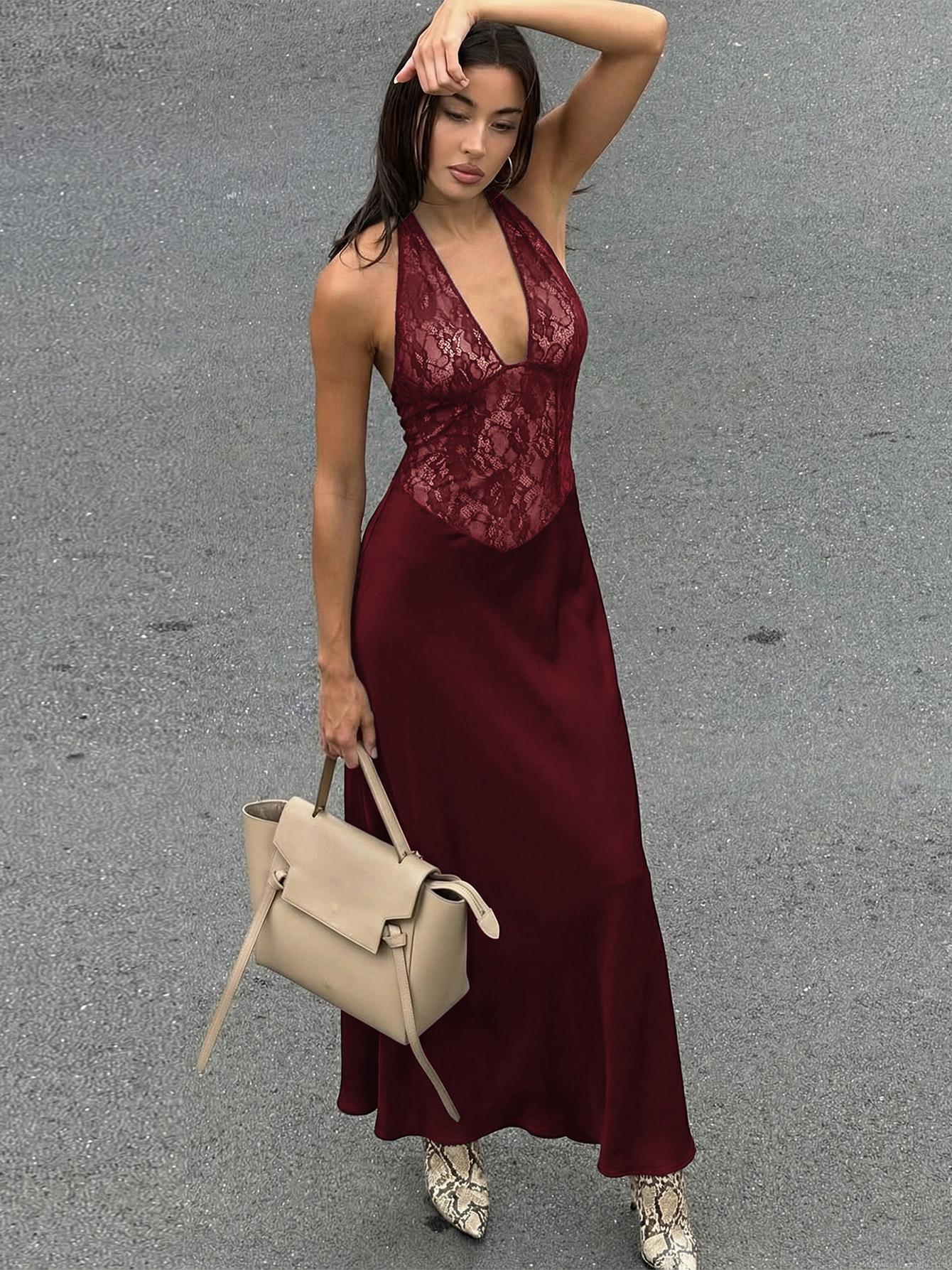 Women Halter Neck Maxi Dress Sexy Lace Splicing Backless Deep V Neck Satin Bodycon Long Dress For Evening Party Cocktail Event