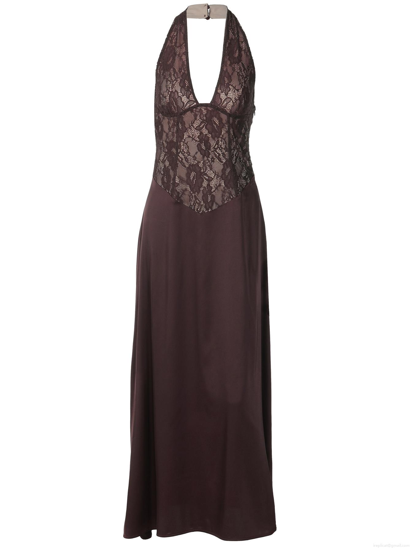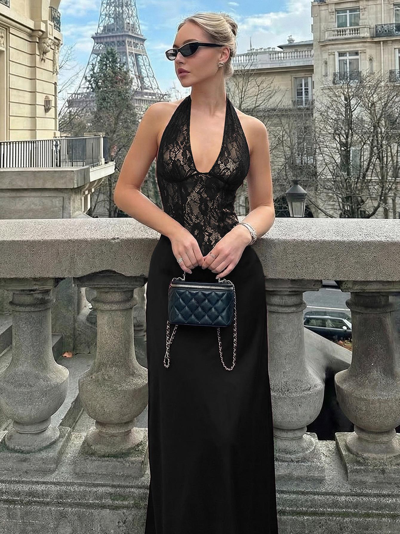 • Women Halter Neck Maxi Dress Sexy Lace Splicing Backless Deep V Neck Satin Bodycon Long Dress For Evening Party Cocktail Event