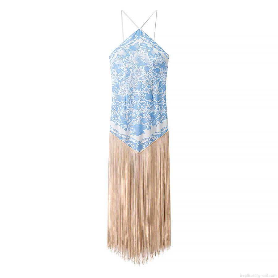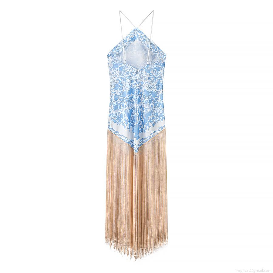 Women Halter V-Neck Floral Print Maxi Dress With Long Tassels Satin Bohemian Elegant Backless Party Vacation Summer Sleeveless Long Gown