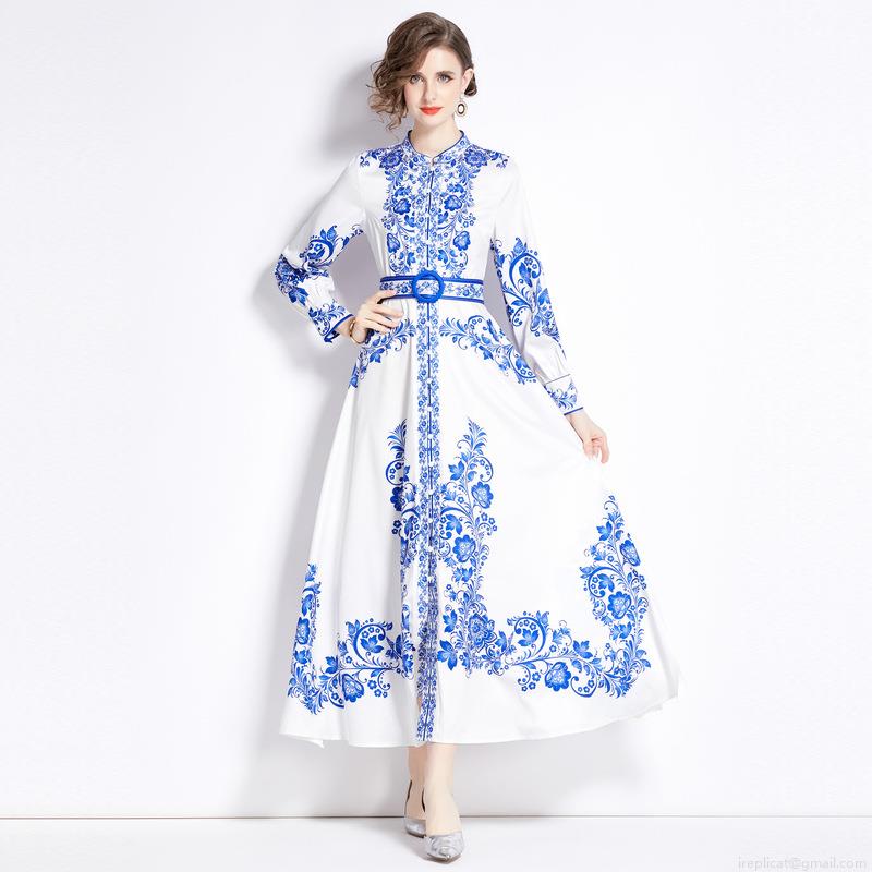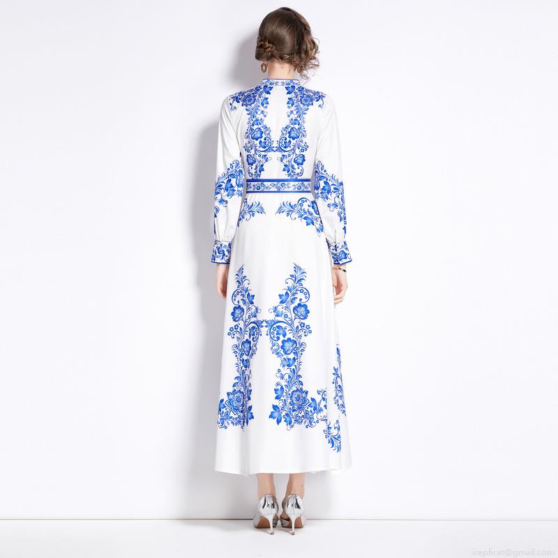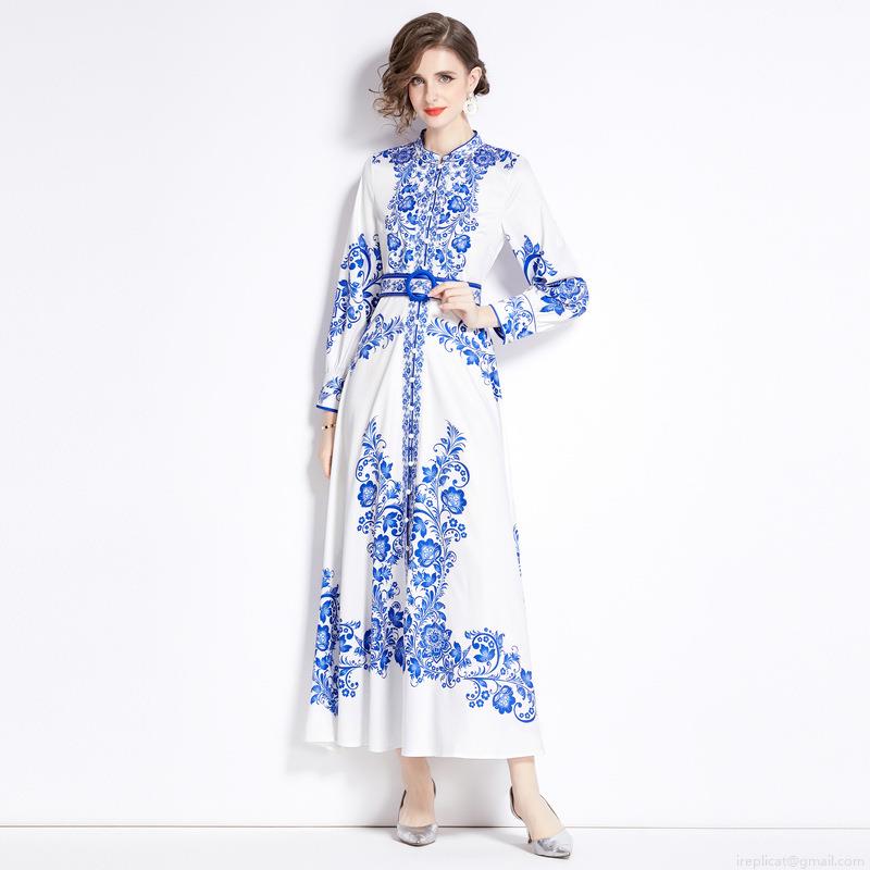Women Mandarin Collar Blue And White Porcelain Print Maxi Dress Elegant Palace Style Long Sleeve Single Breasted Chinoiserie Floral Long Dress With Belt