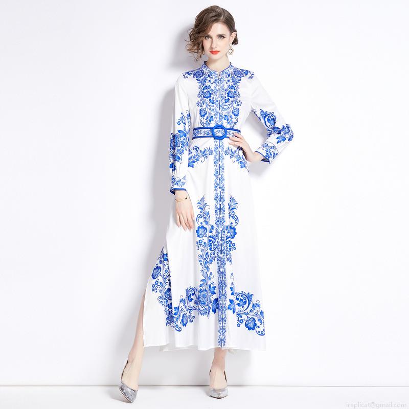 • Women Mandarin Collar Blue And White Porcelain Print Maxi Dress Elegant Palace Style Long Sleeve Single Breasted Chinoiserie Floral Long Dress With Belt