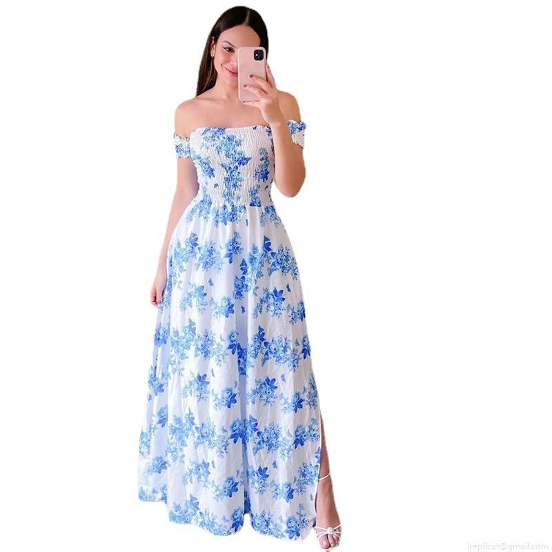 • Women Off Shoulder Maxi Dress High Split Floral Sunflower Printed Boho Beach Dress Elegant Graduated Color Party Summer Sundress