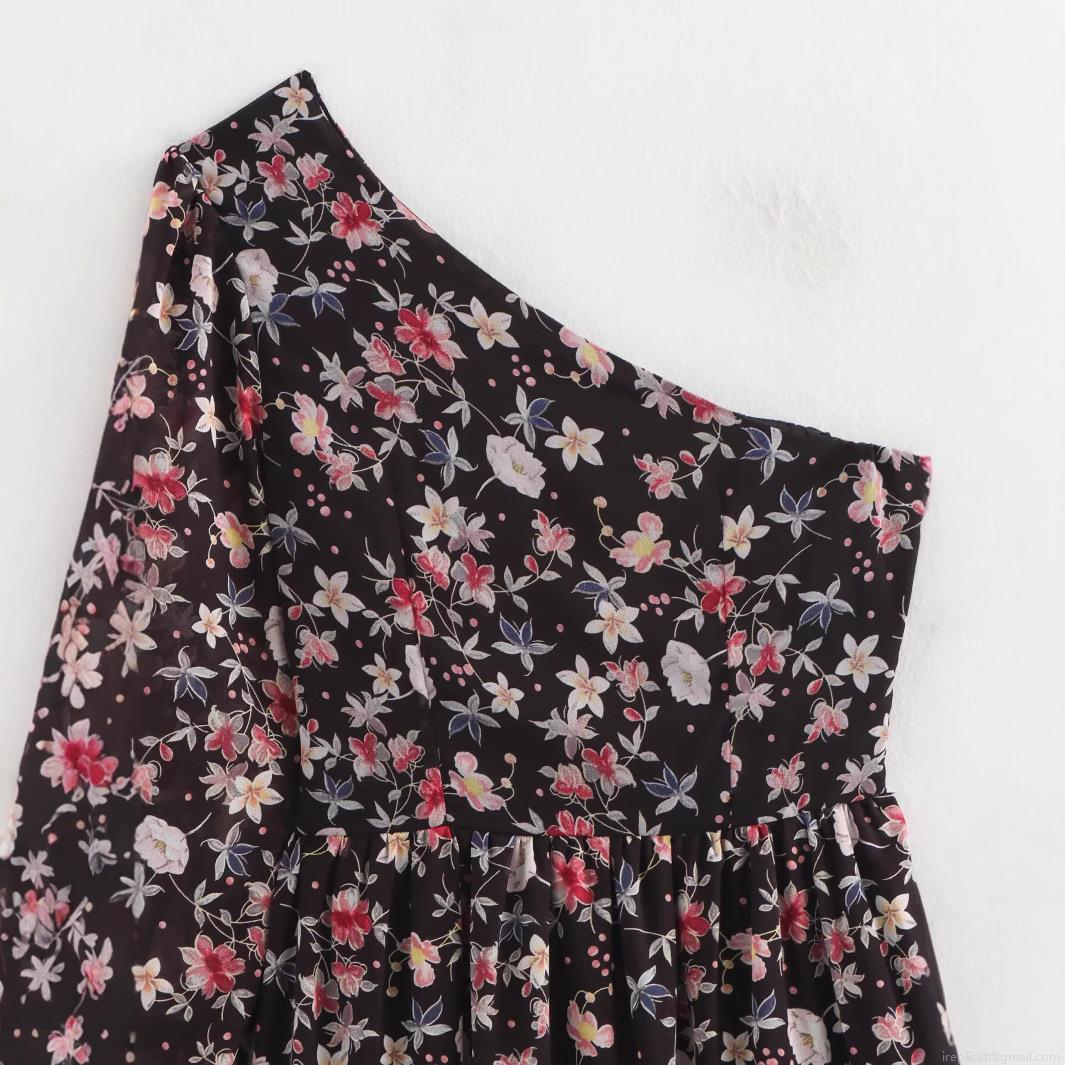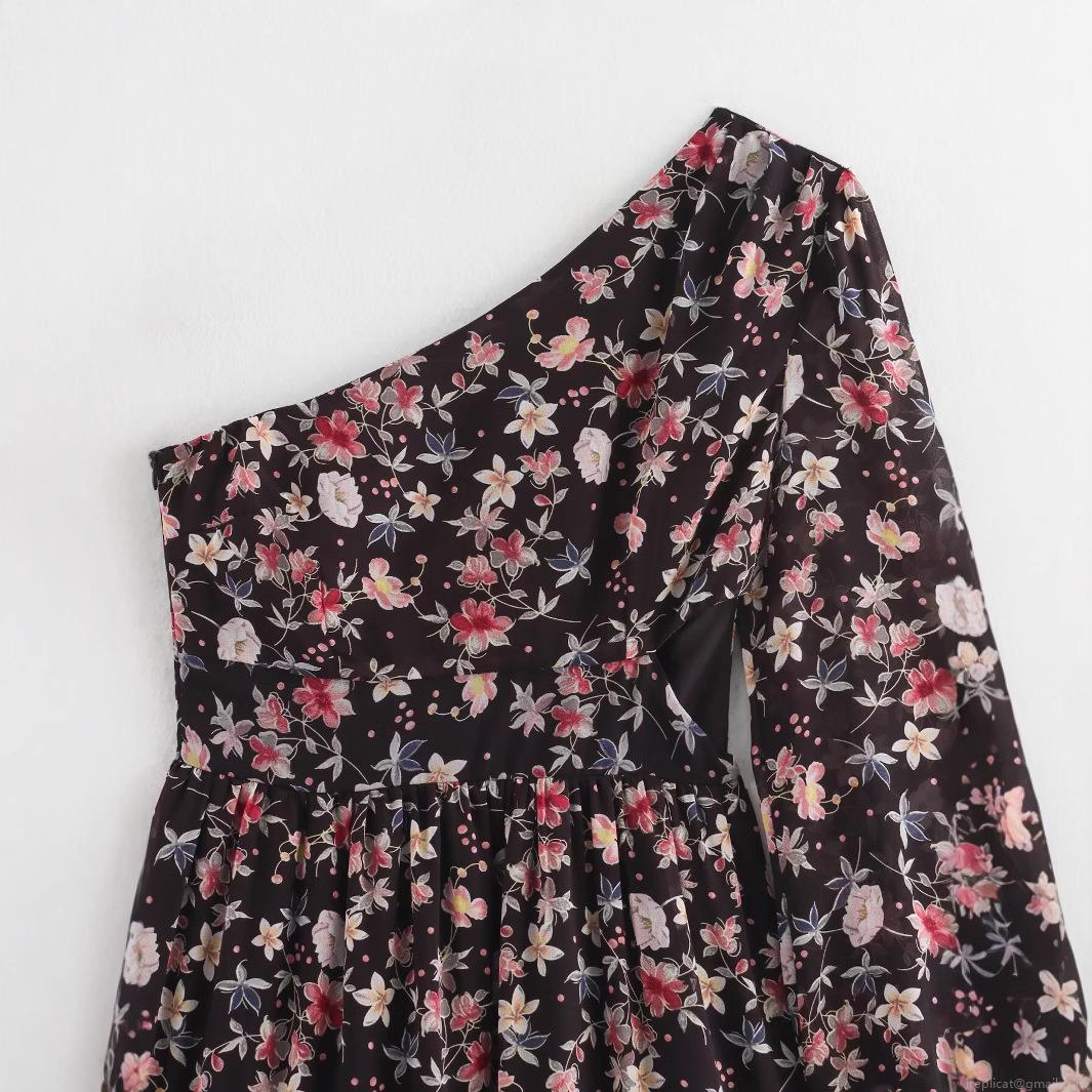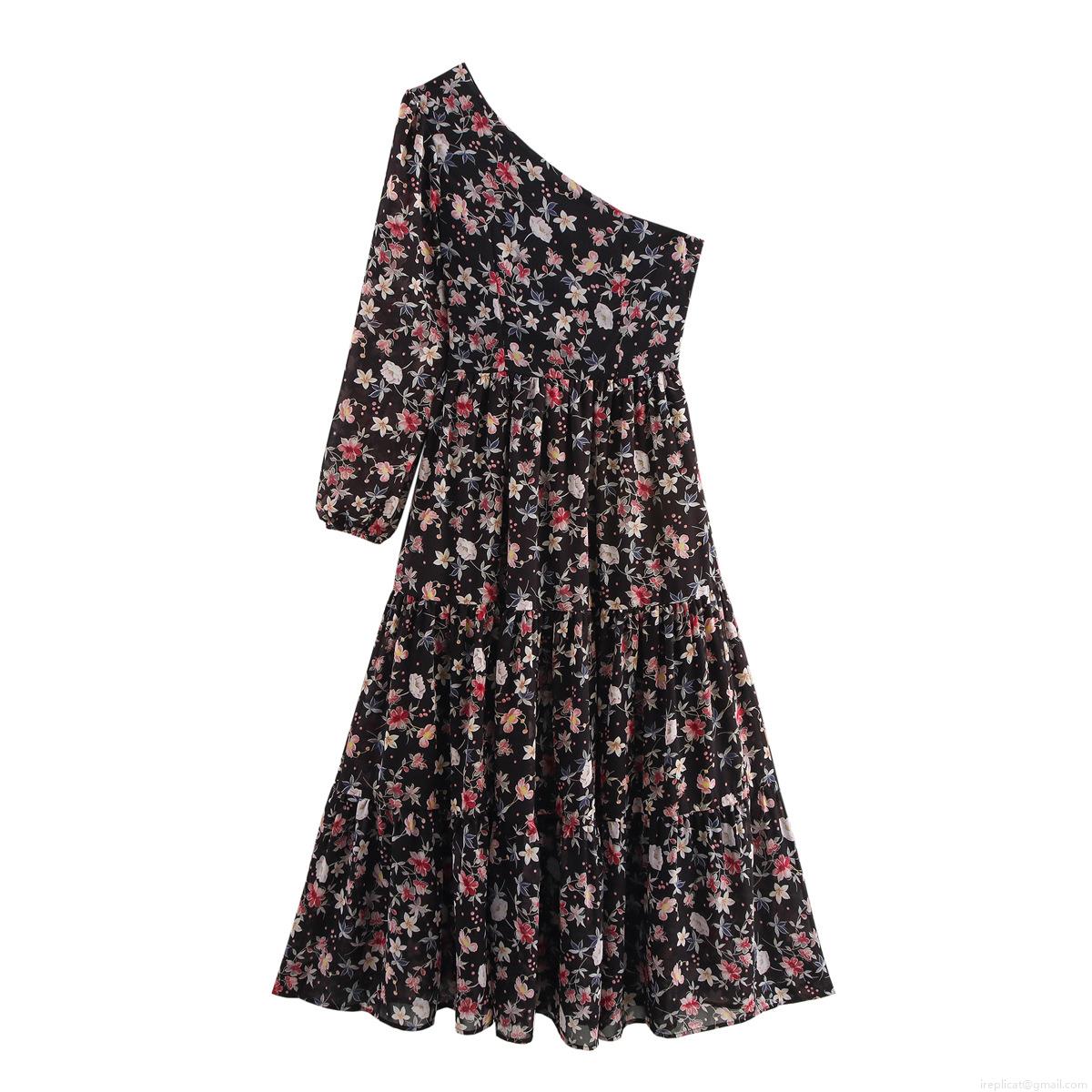 • Women One Shoulder Floral Print Maxi Dress 100% Polyester Long Sleeve Layered Cake Skirt Elegant Street Style Vacation Summer Party Dress