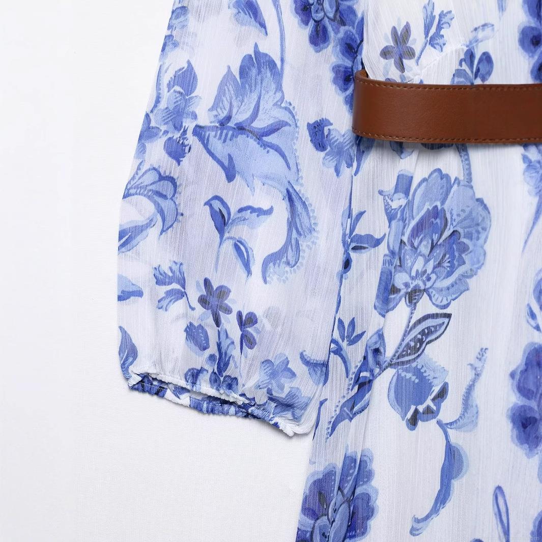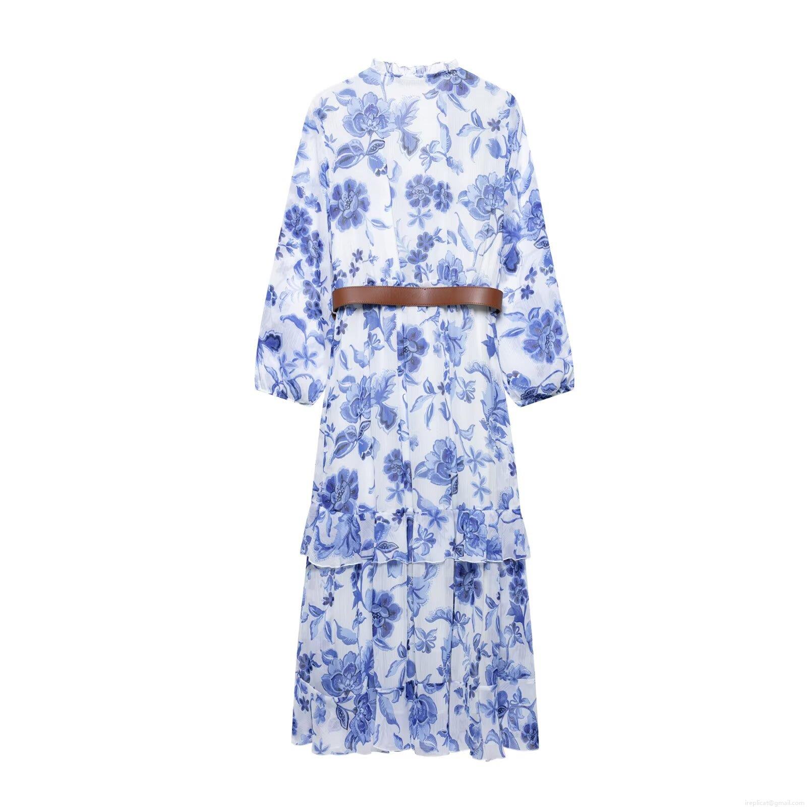 • Women Orchid Floral Print Long Sleeve V-Neck Maxi Dress With Brown Belt Elegant Chiffon Ruffle Socialite Style Party Dress