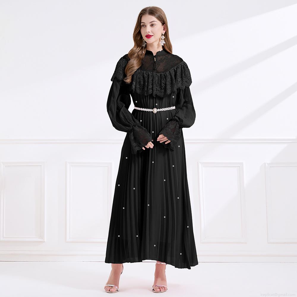 Women Palace Style Lace Patchwork Pleated Maxi Dress With Pearl Belt Elegant Long Sleeve Stand Collar Party Evening Dress For Ladies