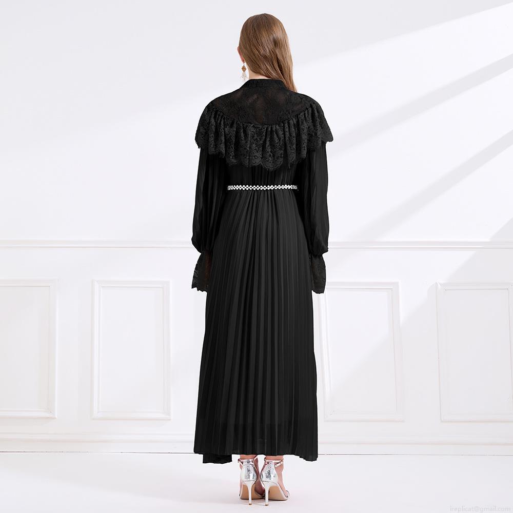 • Women Palace Style Lace Patchwork Pleated Maxi Dress With Pearl Belt Elegant Long Sleeve Stand Collar Party Evening Dress For Ladies