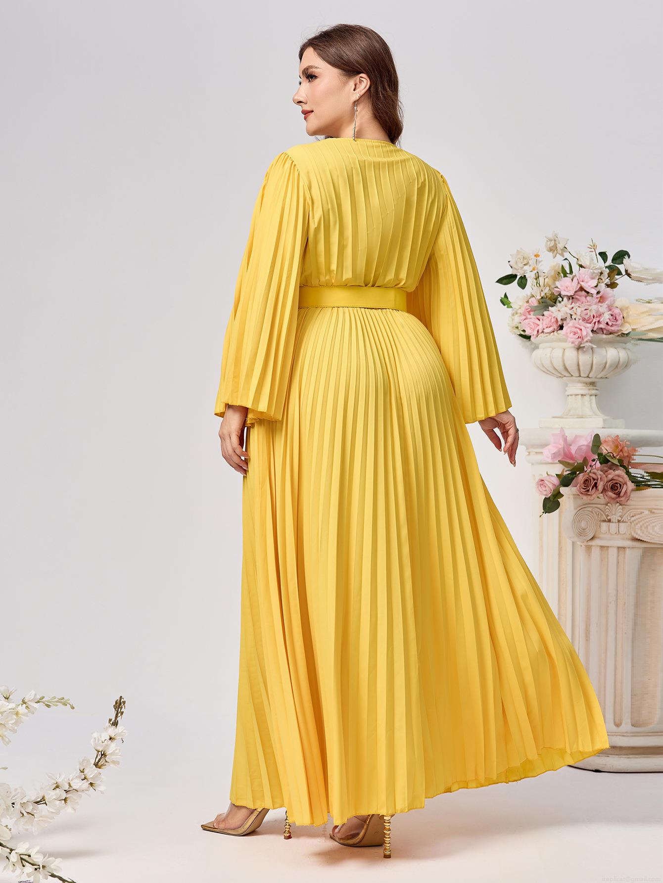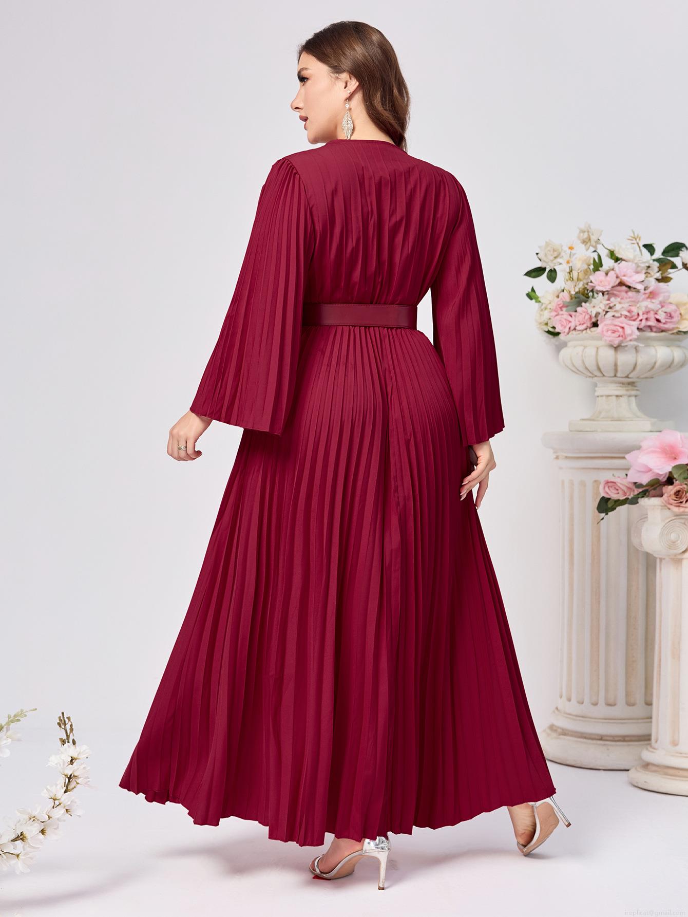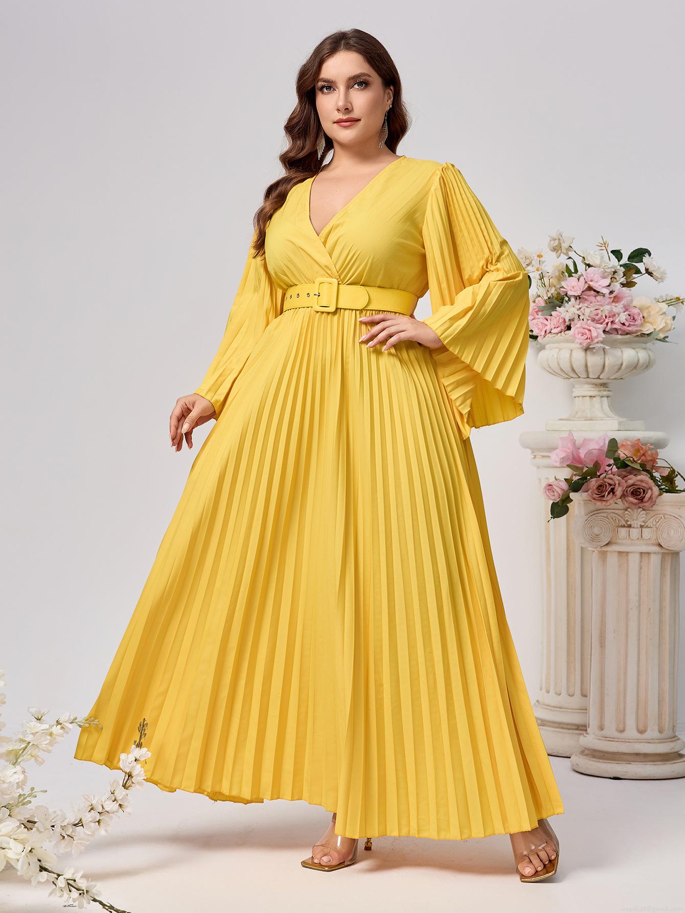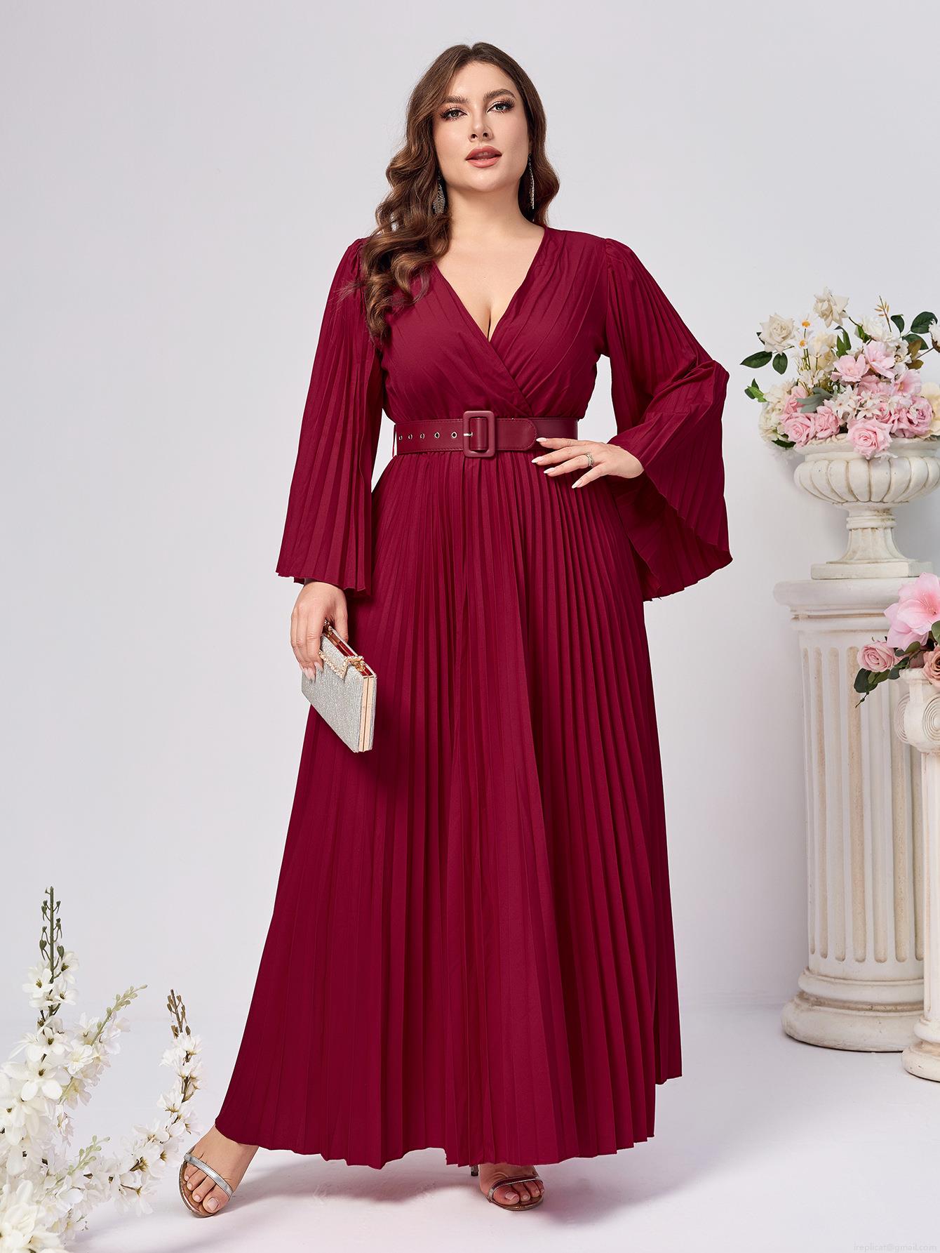 • Women Plus Size Elegant V Neck Pleated Maxi Dress Long Sleeve Solid Color Flowy A-Line Party Gown With Belt