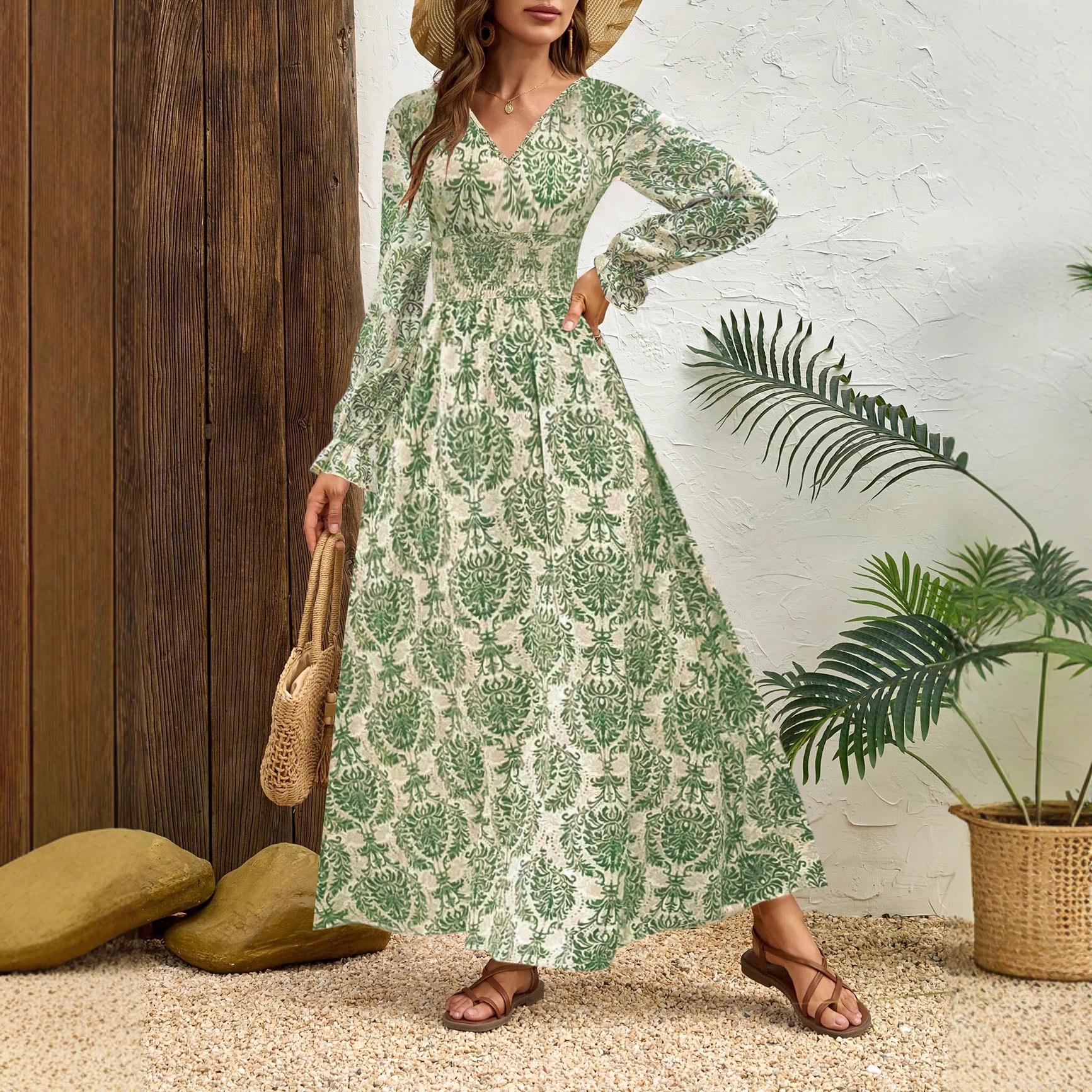 • Women Plus Size Vintage Damask Print Maxi Dress V-Neck Long Sleeve Elastic Waist Bohemian Long Dresses Elegant Autumn Winter Fashion Plus Size Gowns