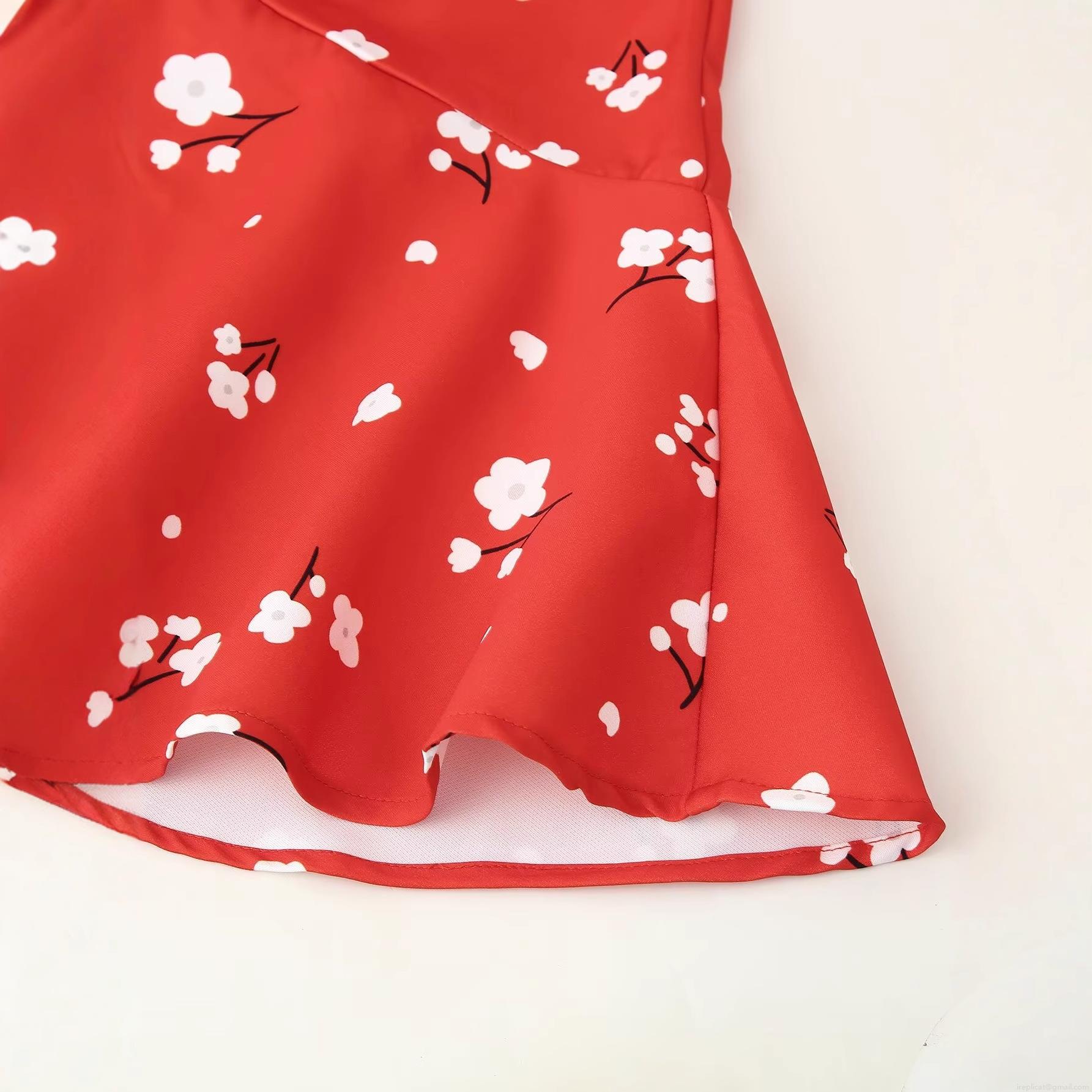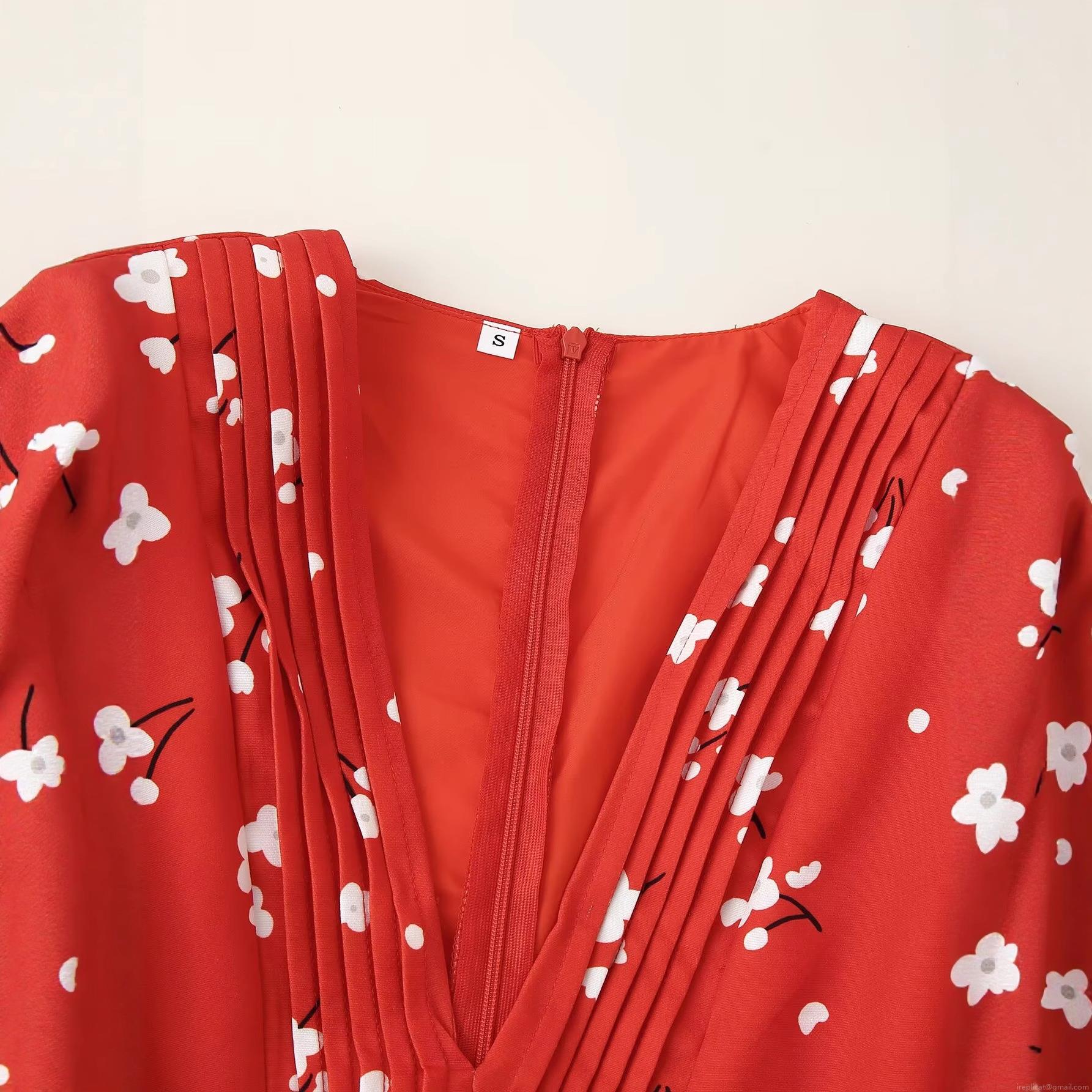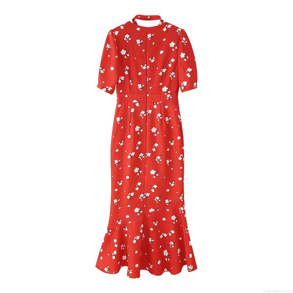 • Women Red Floral Print V-Neck Maxi Dress Short Puff Sleeve Fishtail Hem Slim Fit Elegant Polyester Party Long Dress