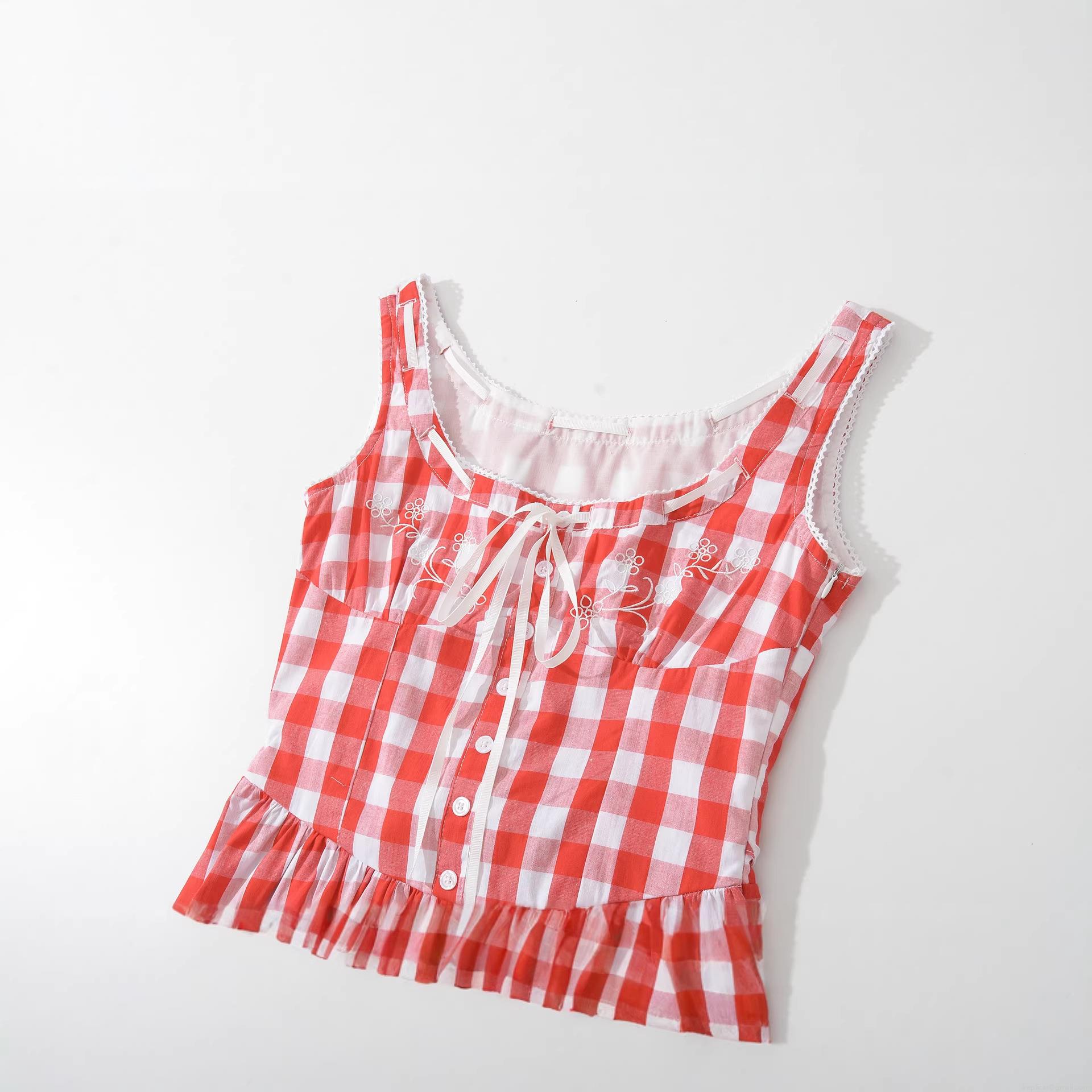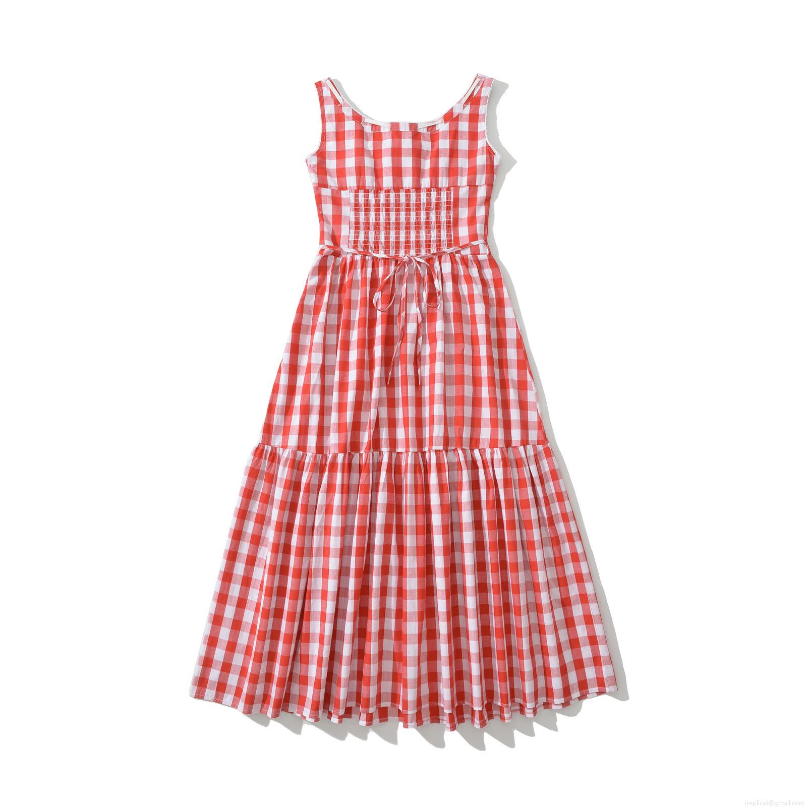 • Women Red Gingham Check Cotton Maxi Dress With Floral Embroidery Lace Trim Smocked Waist And Bow Sweet Sleeveless Tiered Cake Dress