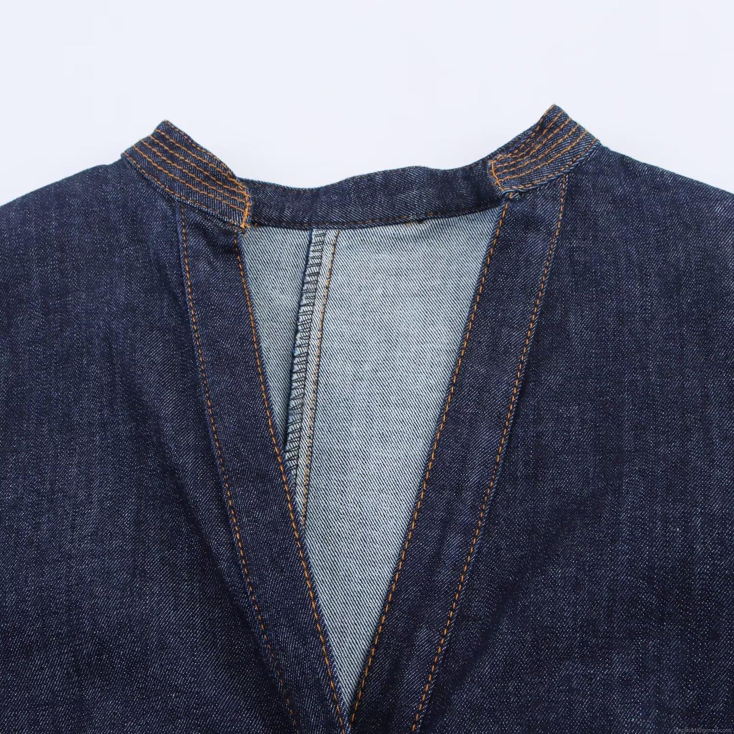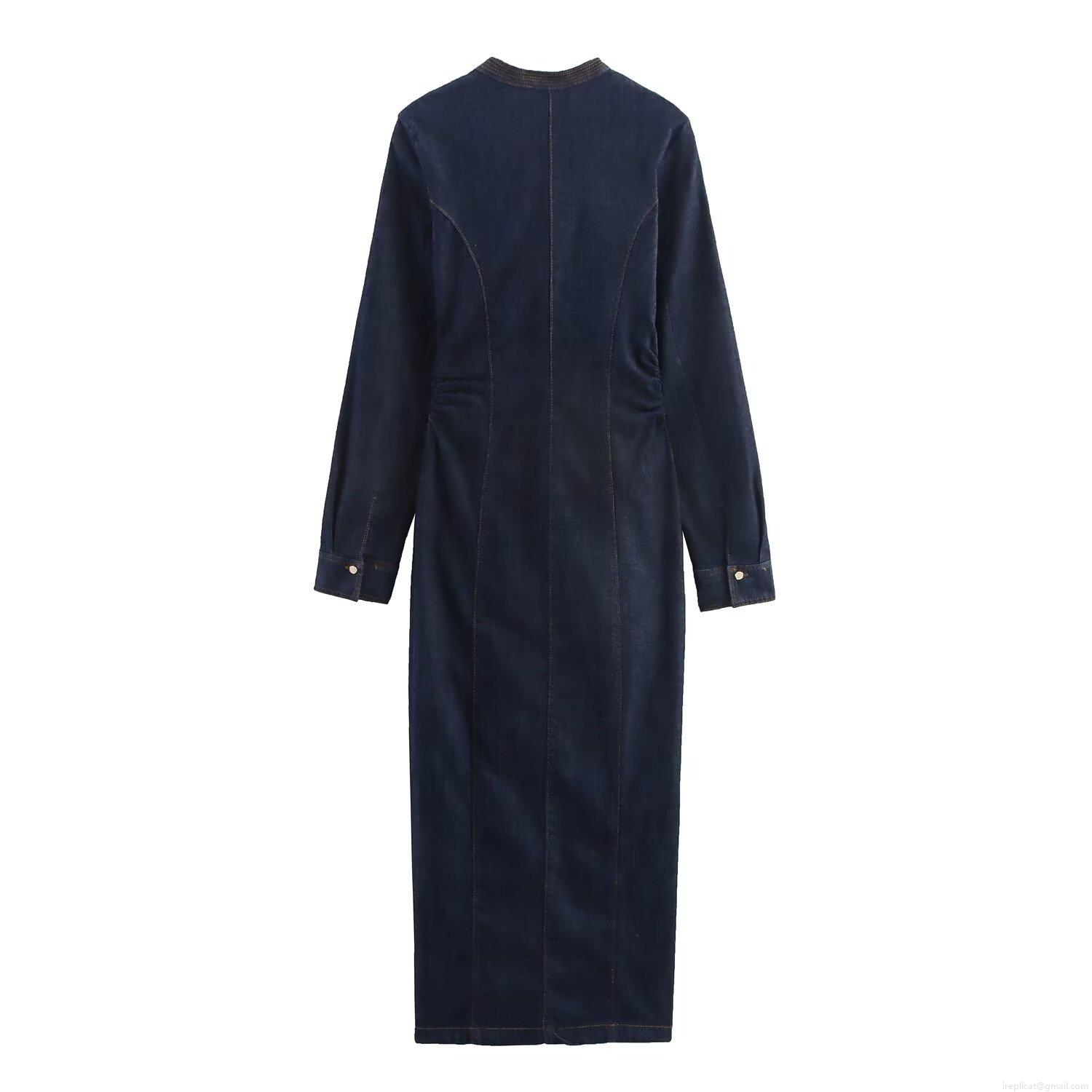 • Women Retro Dark Blue Denim Maxi Dress V-Neck Long Sleeve Single-Breasted Slim Fit Pleated Leisure Bodycon Dress Elegant Long Sleeve Denim Long Dress