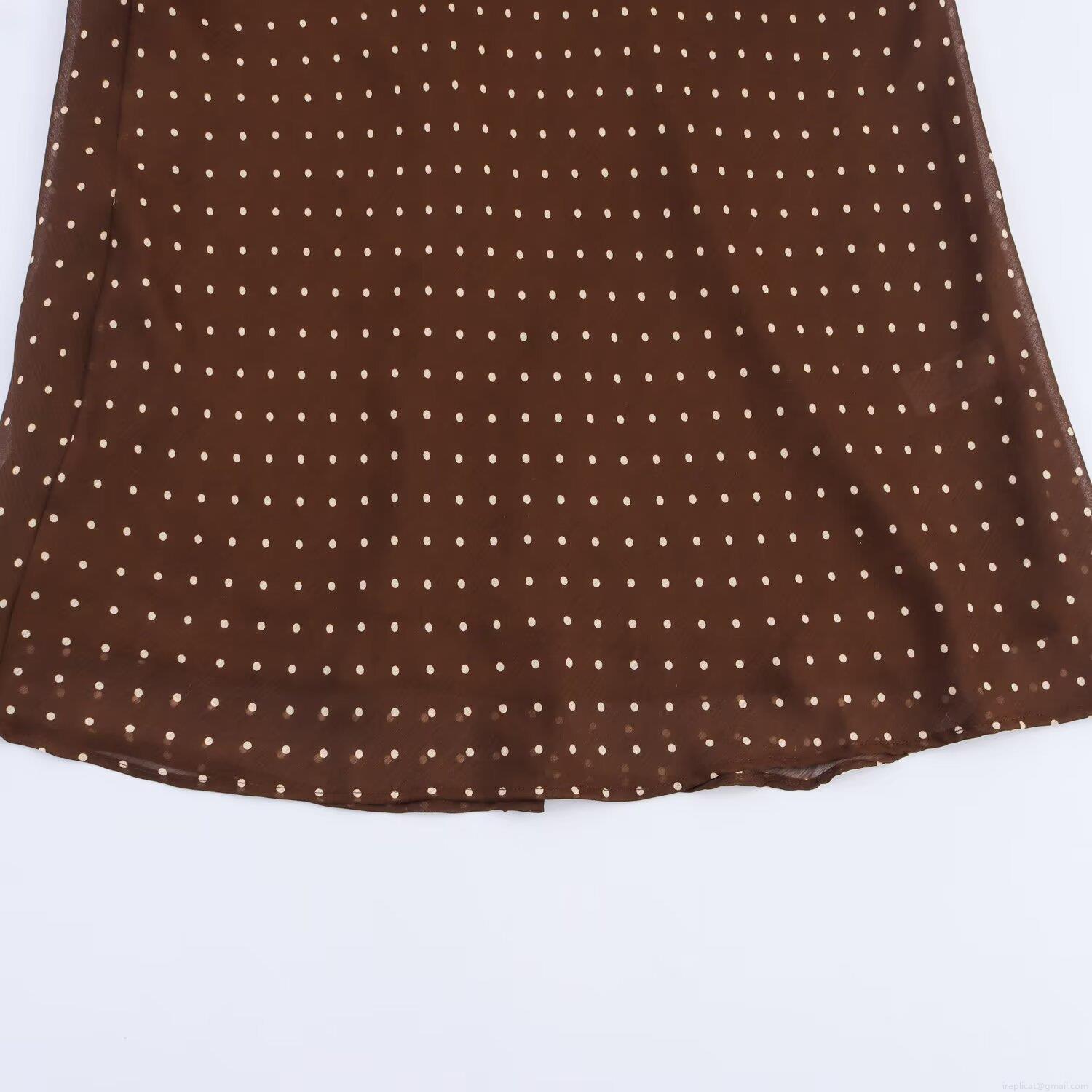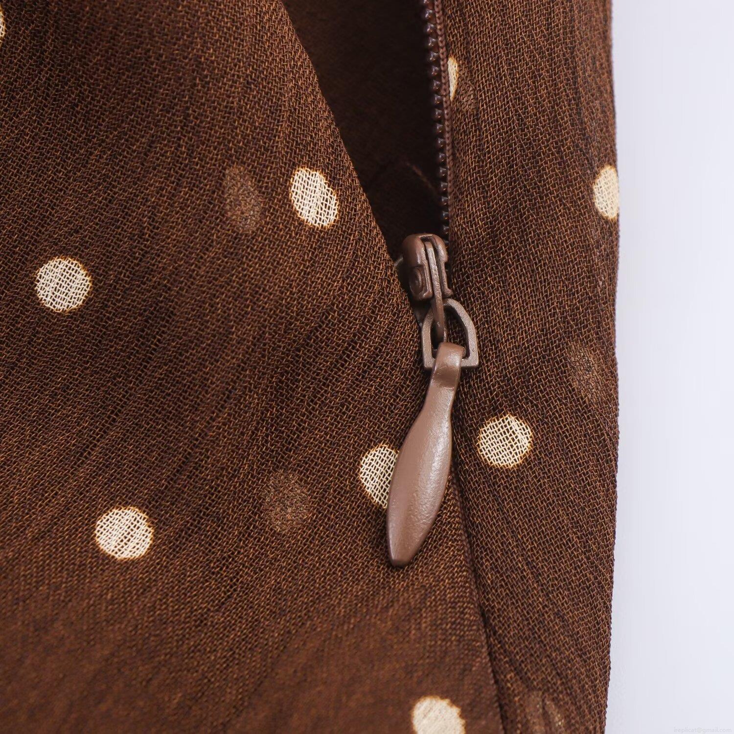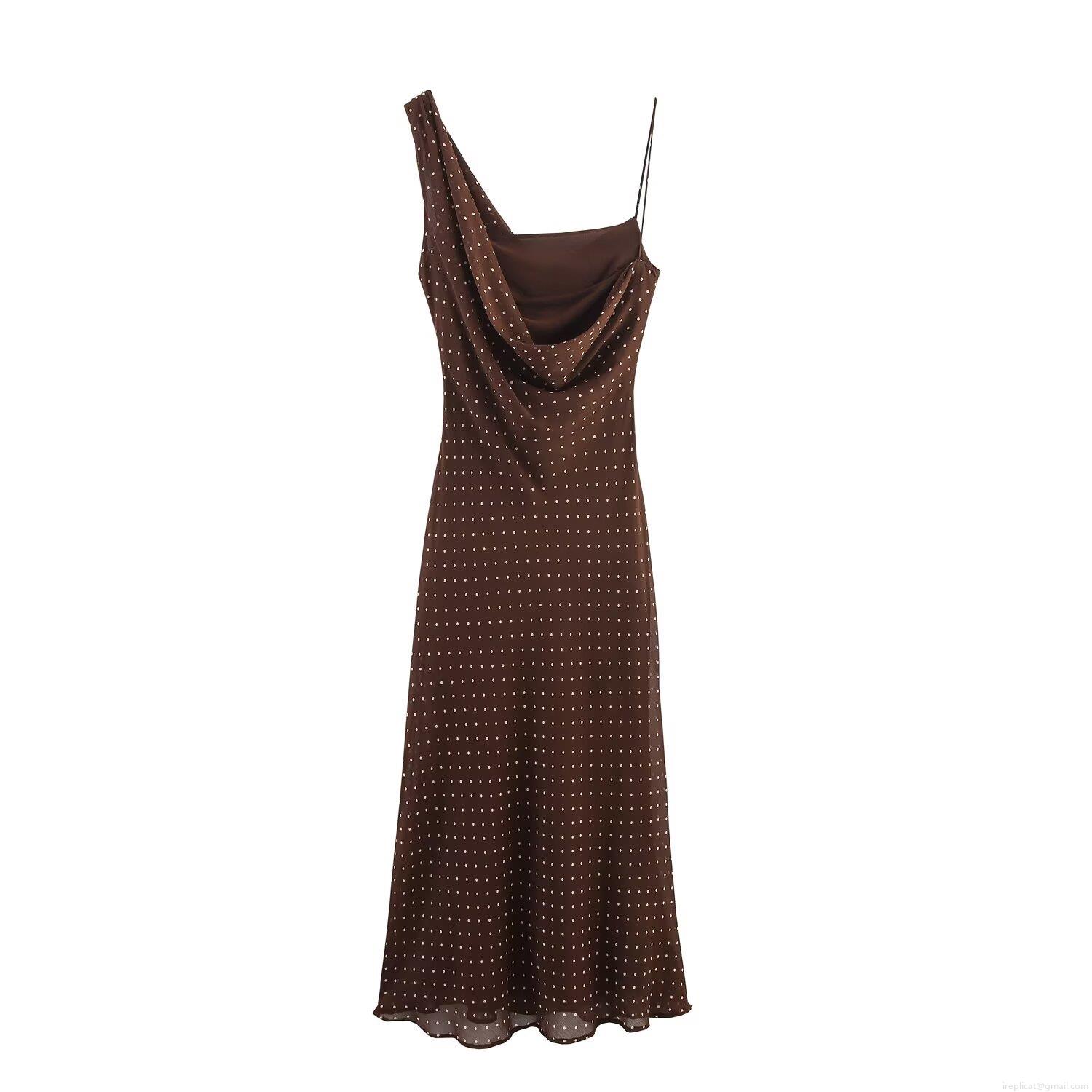 • Women Retro Dark Brown Polka Dot Maxi Dress Sexy Asymmetric Ruffle Neckline Sleeveless Chiffon Sling Dress For Summer Autumn Party Elegant Lady