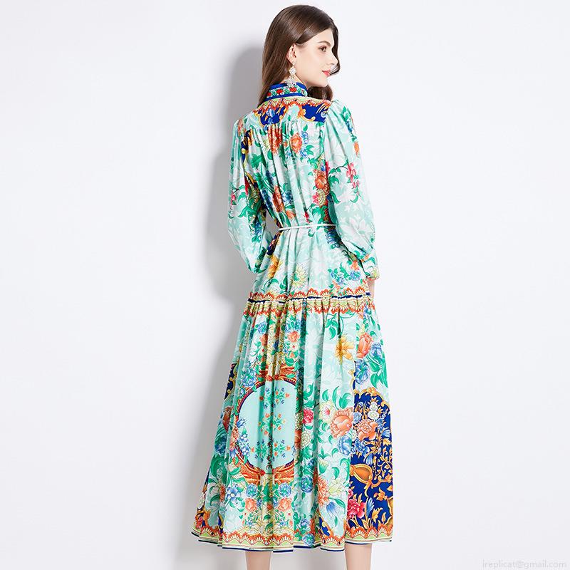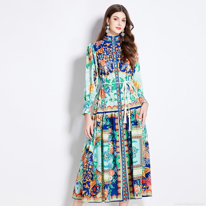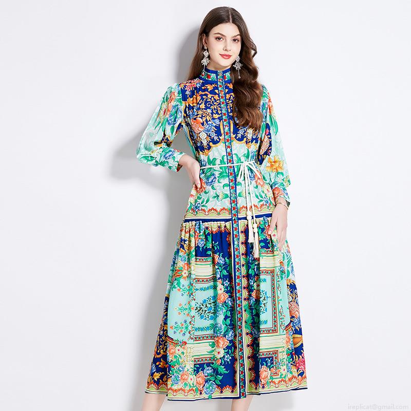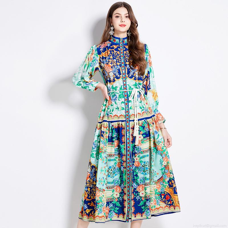 • Women Retro Ethnic Floral Print Maxi Dress Elegant Stand Collar Lantern Sleeve Button Up A-Line Long Dress With Tassel Waist Belt For Party Dating Daily