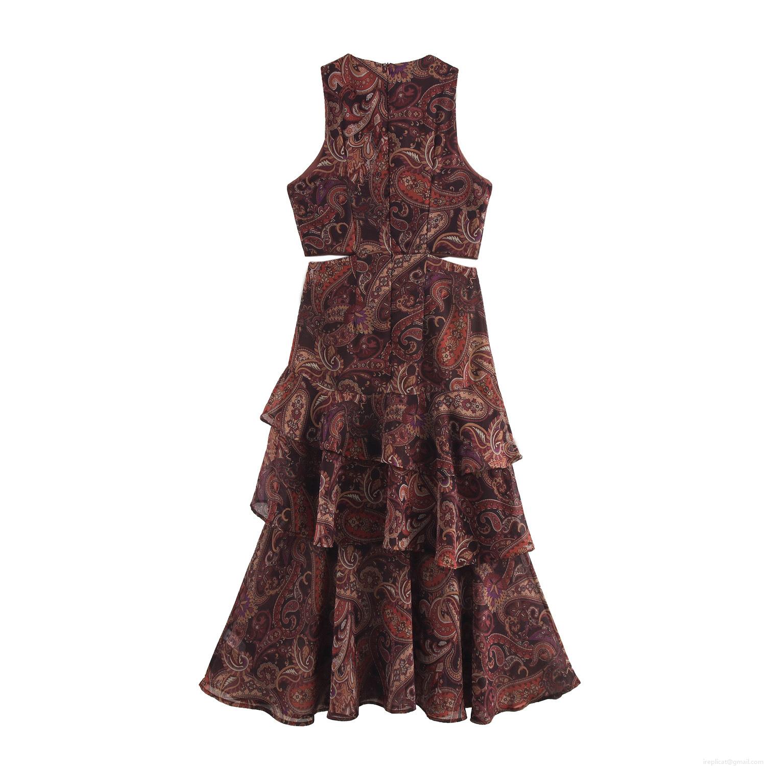 Women Retro Paisley Print Chiffon Maxi Dress Boho Sleeveless Halter Hollow Out Layered Ruffle Vacation Beach Party Fashion Long Dress For Lady