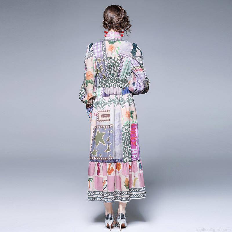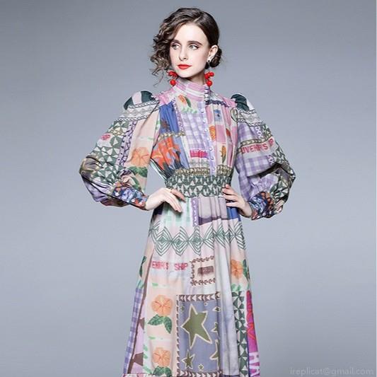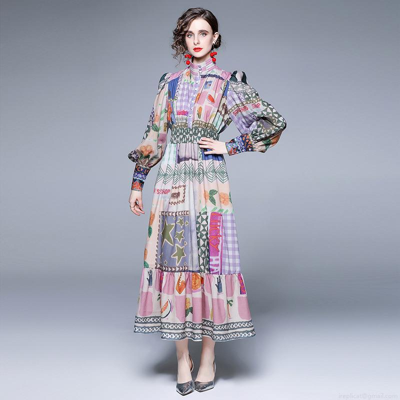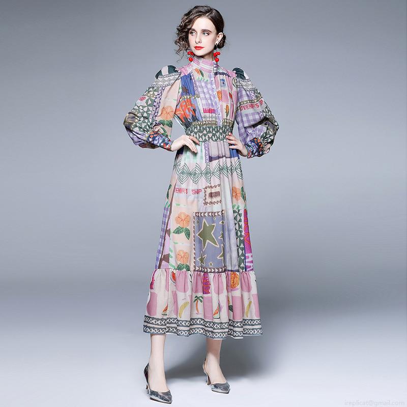• Women Retro Patchwork Print Maxi Dress Elegant Stand Collar Puff Sleeve Elastic Waist Long Dress For Holiday Beach Party Women Fashion Dresses