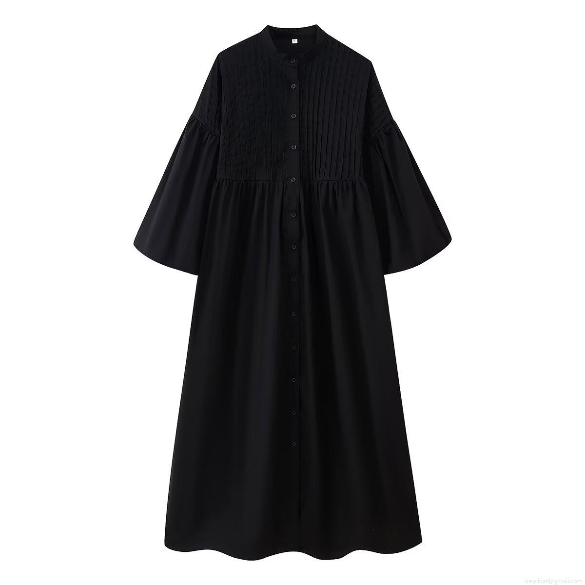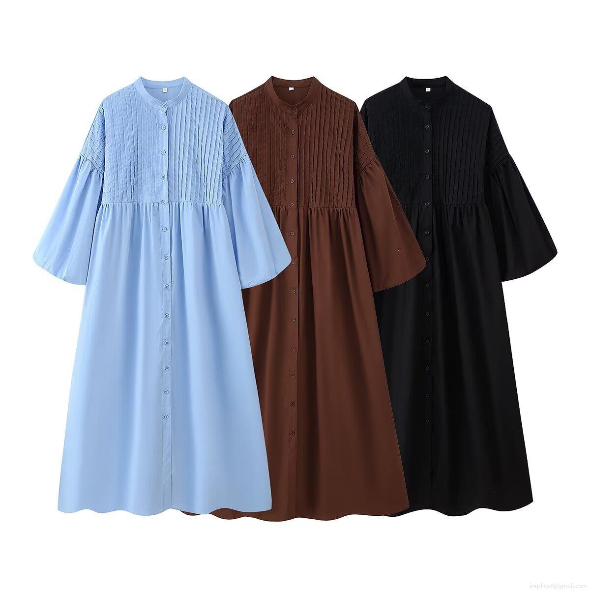 • Women Retro Round Neck Puff Sleeve Pintuck Shirt Dress Loose Fit Single Breasted Polyester Solid Color Lantern Sleeve Maxi Dress For Casual Daily Wear