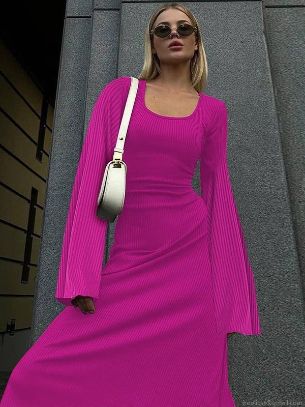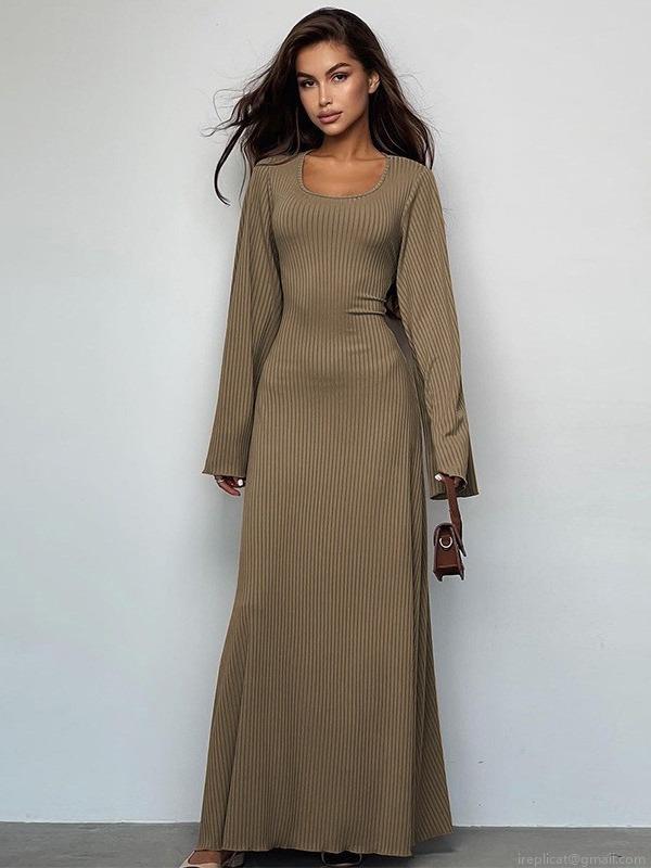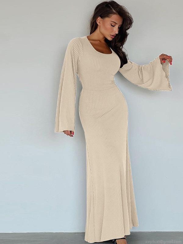 • Women Ribbed Knit Maxi Dress Flare Long Sleeve Bodycon Long Gown Chic Backless Tie-Up Solid Color Polyester Dress For Women Casual Evening Party Minimalist Muslim Robe
