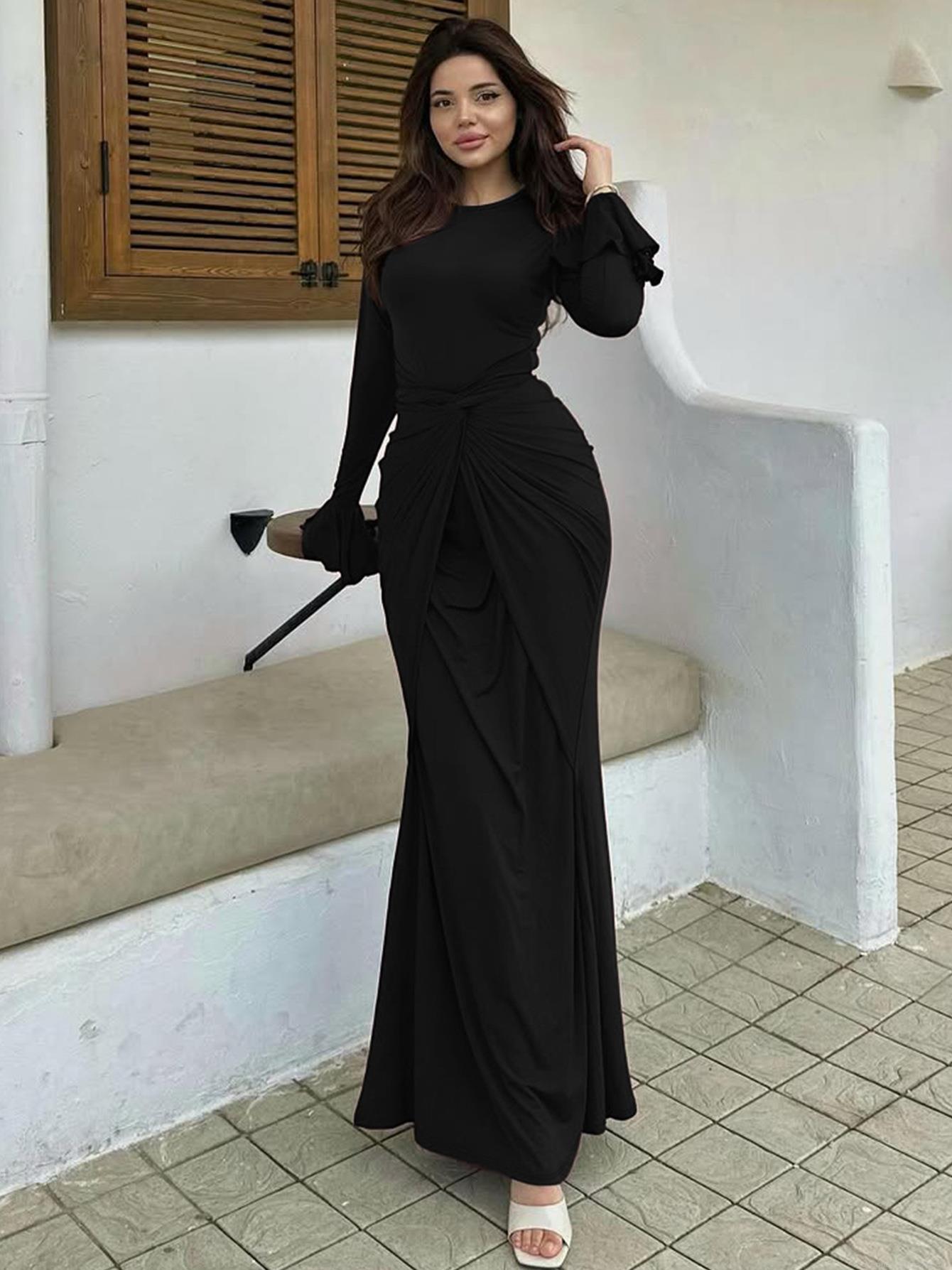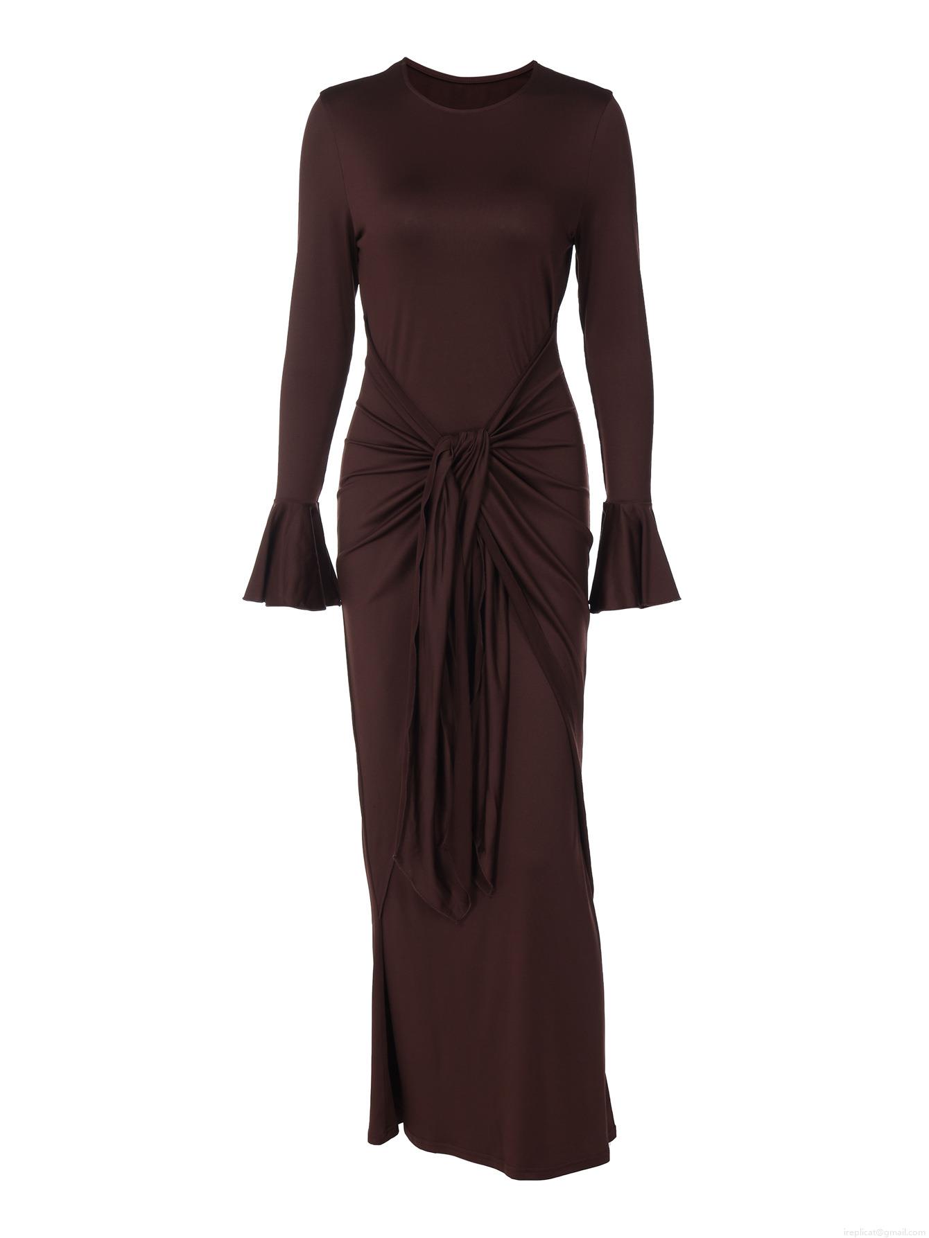 • Women Round Neck Long Flare Sleeve Maxi Dress Elegant Slim Fit Waist Knot Solid Color Party Evening Gown